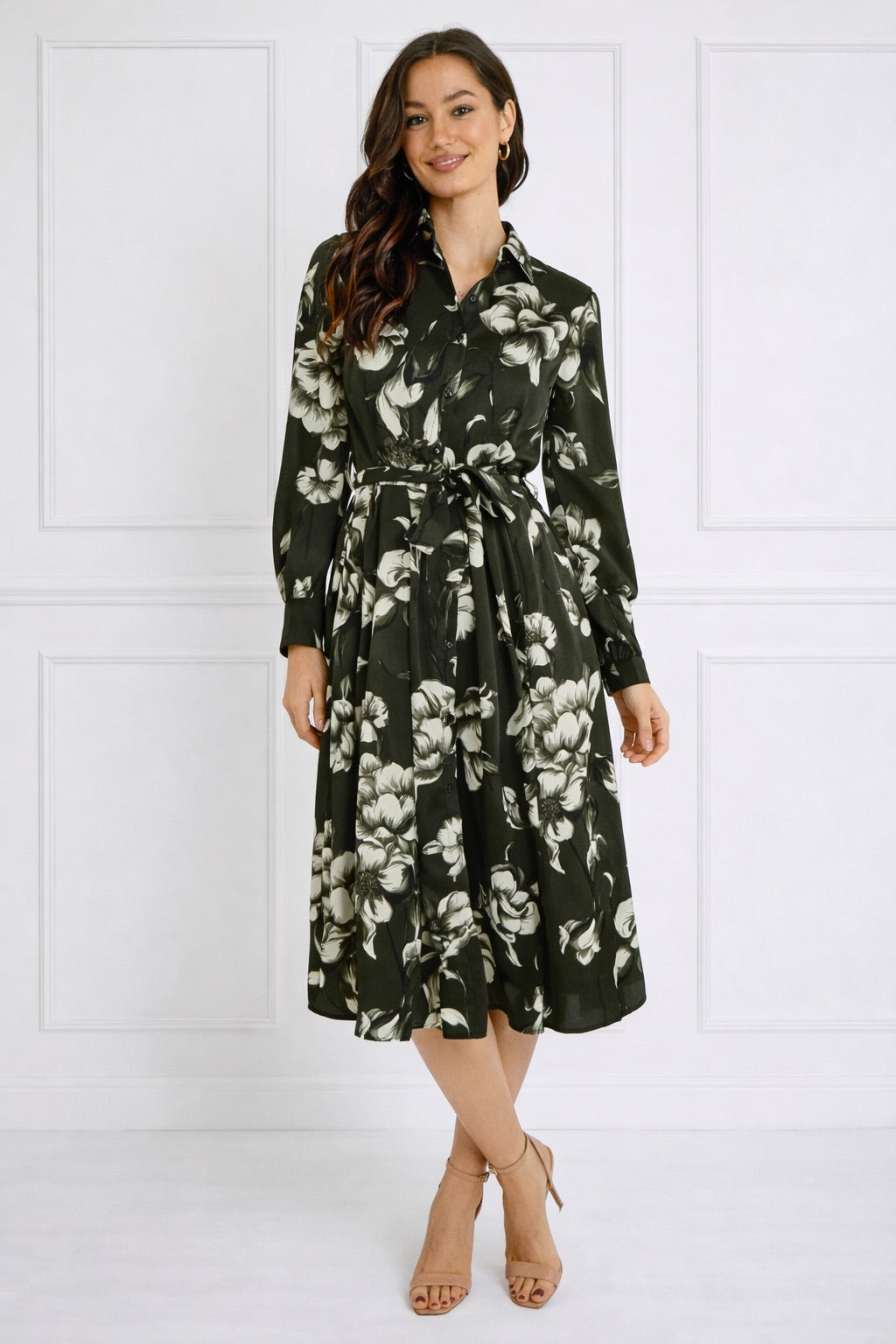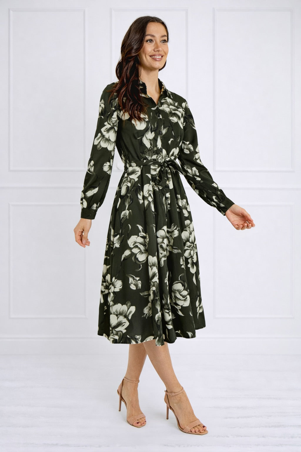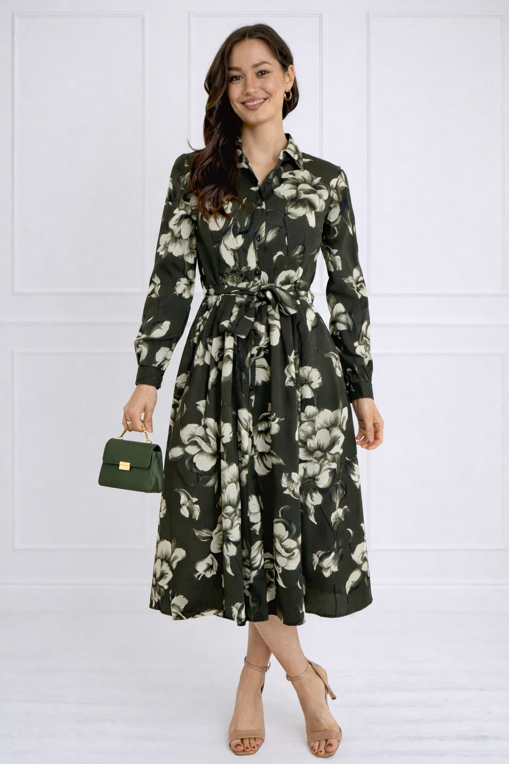 Green Botanical Print Belted Midi Shirt Dress