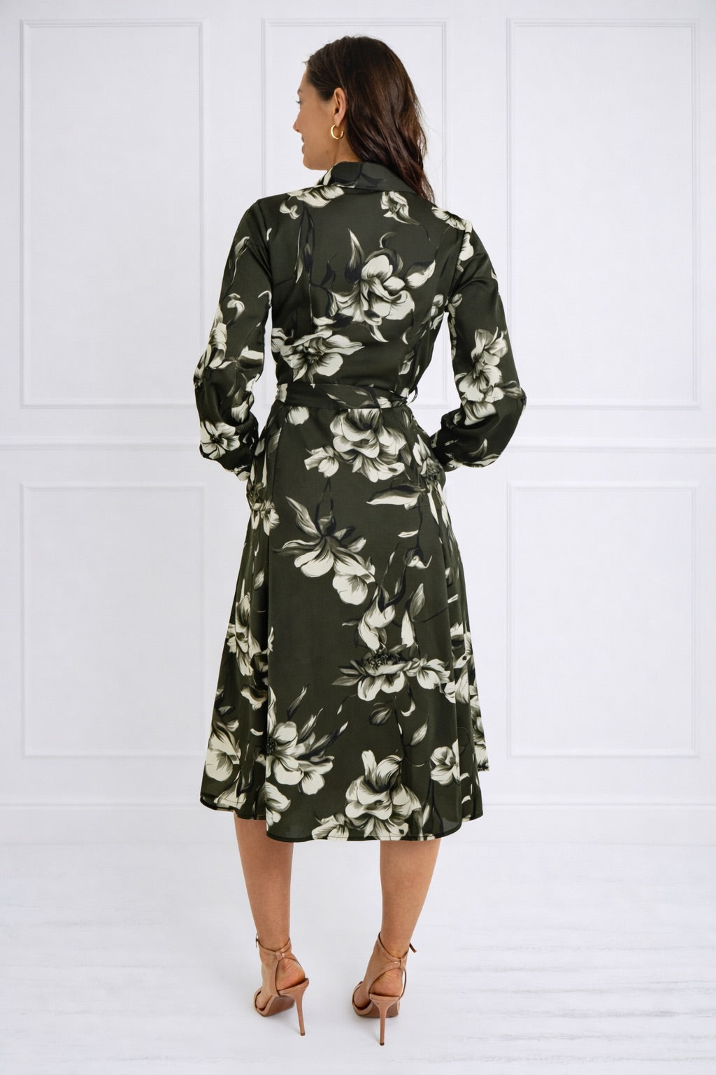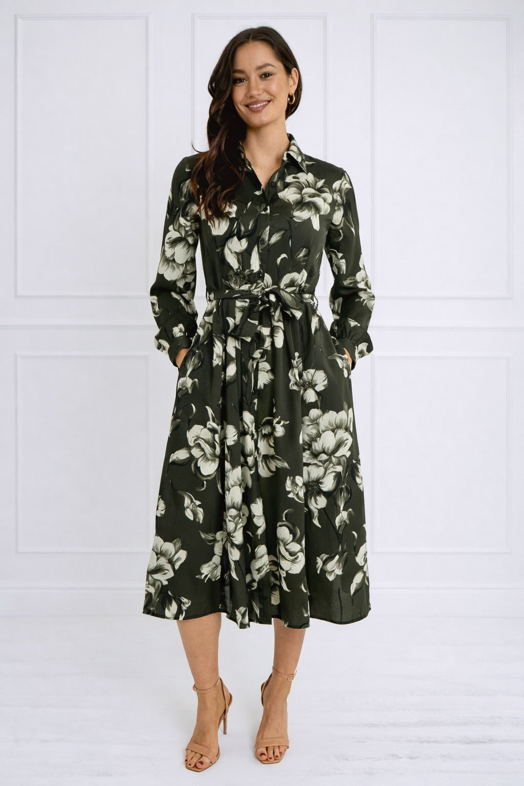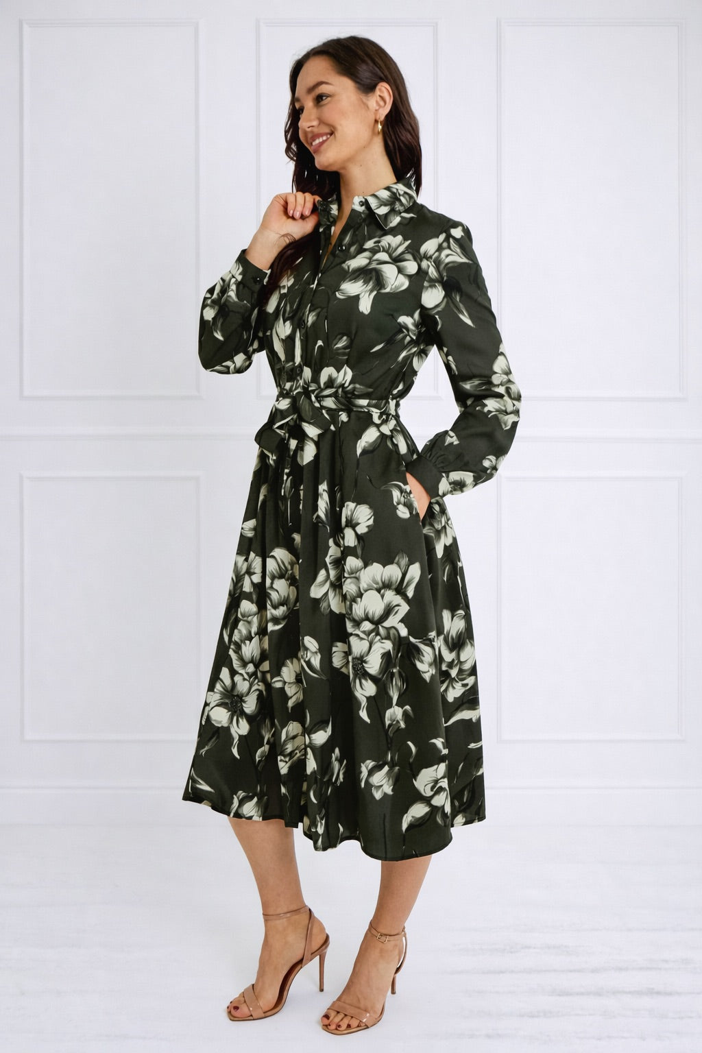Green Botanical Print Belted Midi Shirt Dress