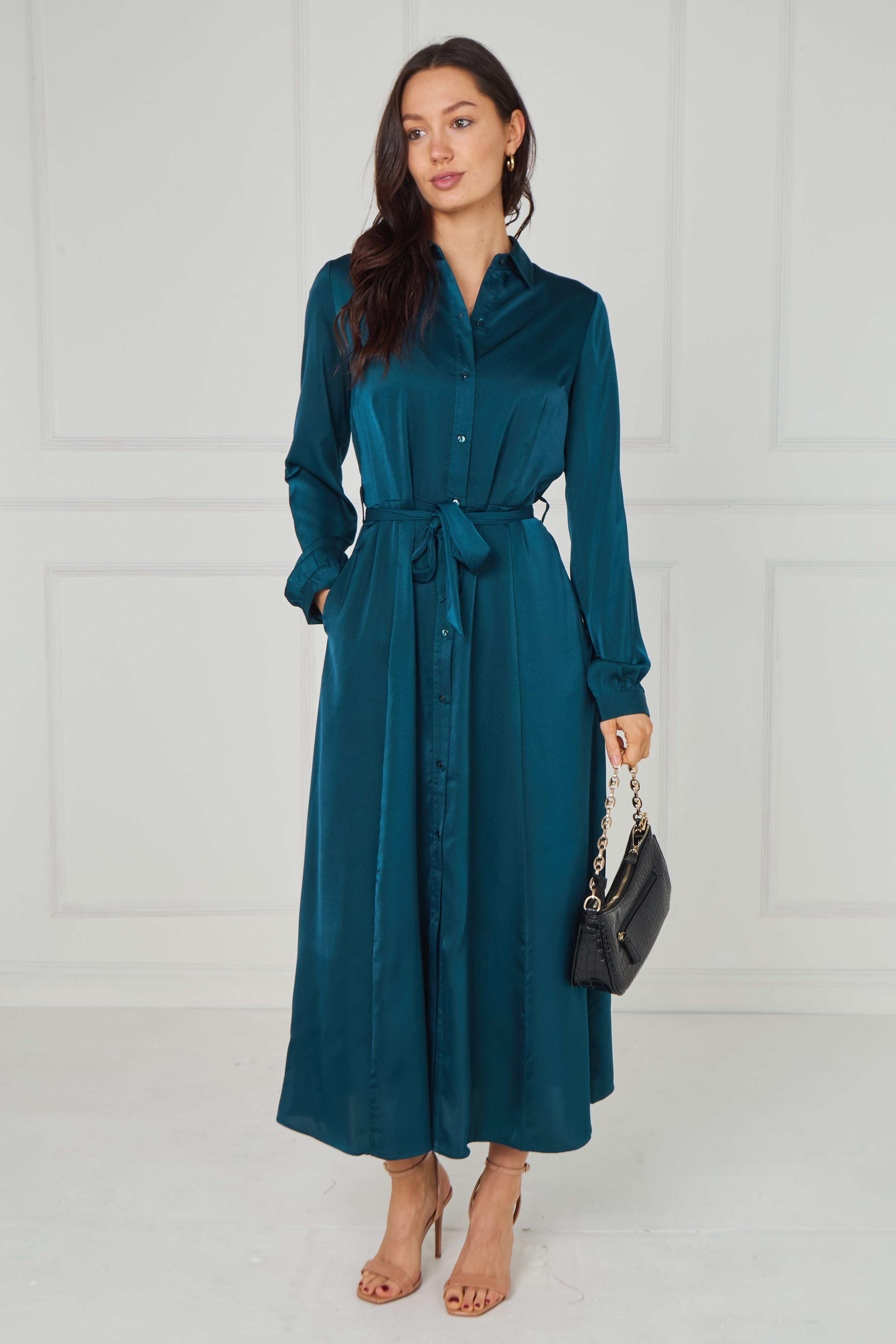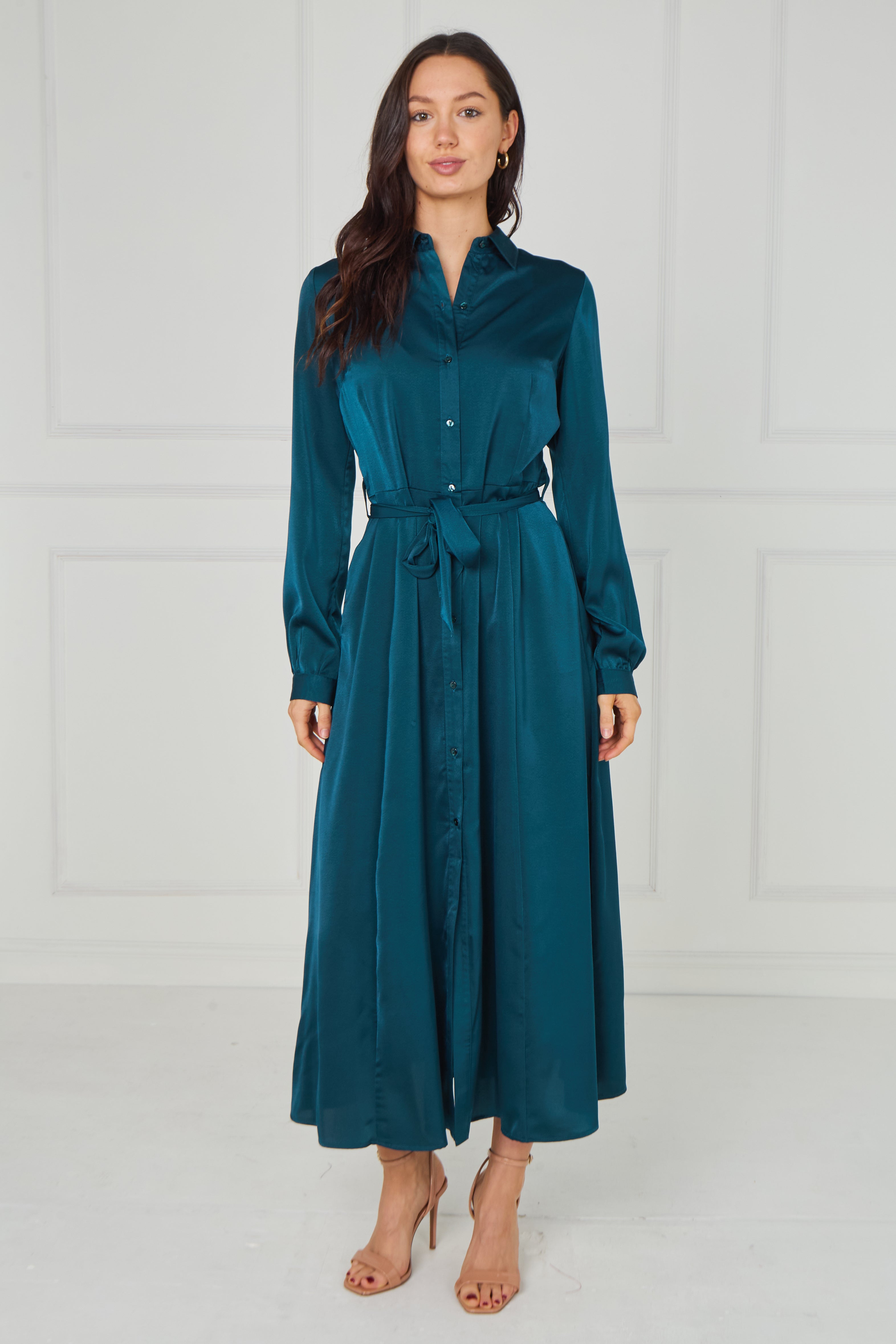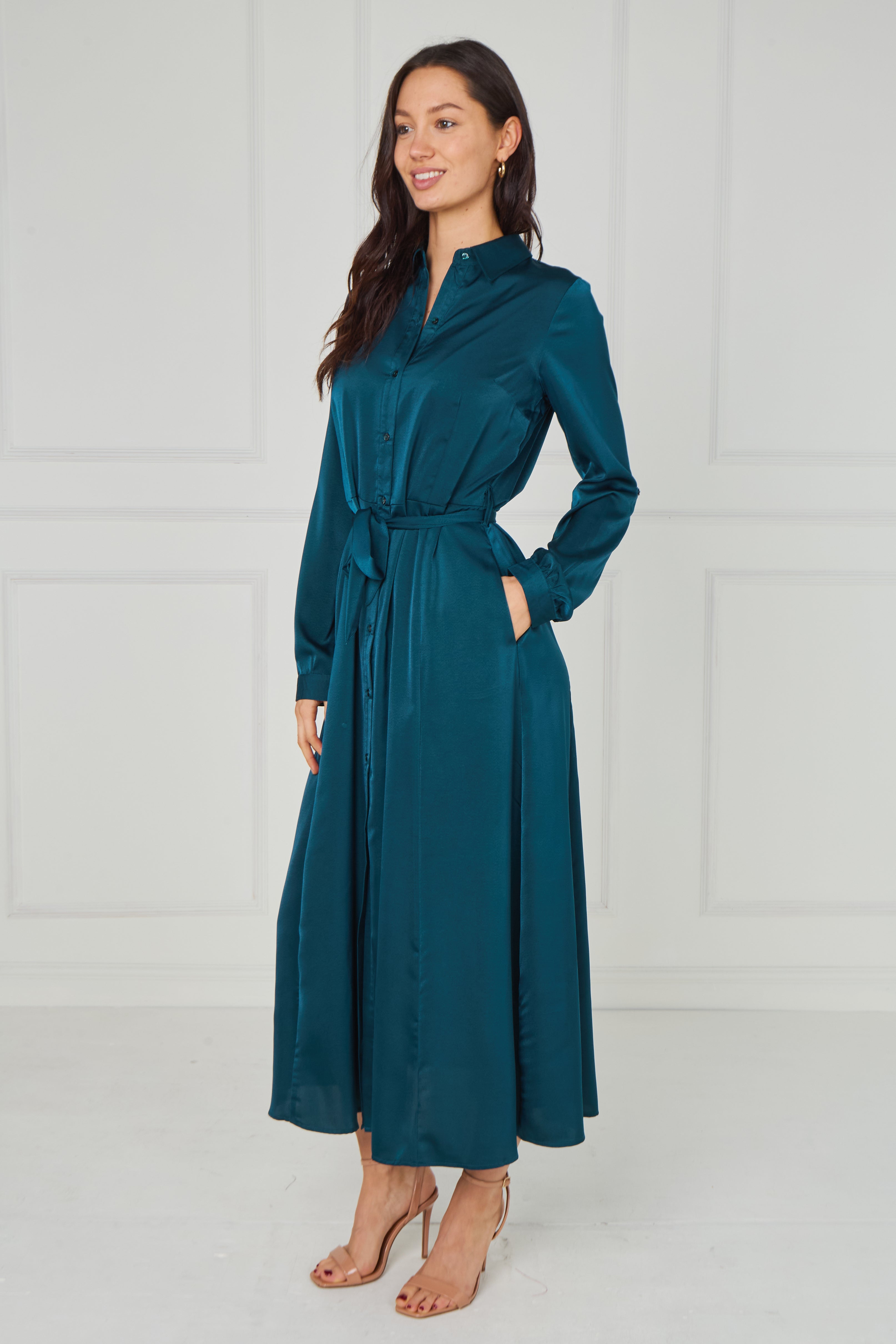 Sophisticated and effortlessly refined, the Teal Velvety Satin Maxi Shirt Dress features a rich jewel-toned teal hue enhanced by a soft velvety satin finish that catches the light beautifully. Designed with a classic shirt collar, full button-through front, and long sleeves with gently gathered cuffs, it offers timeless elegance with a modern touch. The self-tie waist belt defines the silhouette for a flattering fit, while the flowing maxi-length skirt creates graceful movement. Finished with two side pockets for added practicality, this versatile dress transitions seamlessly from polished daytime styling to elevated evening occasions.