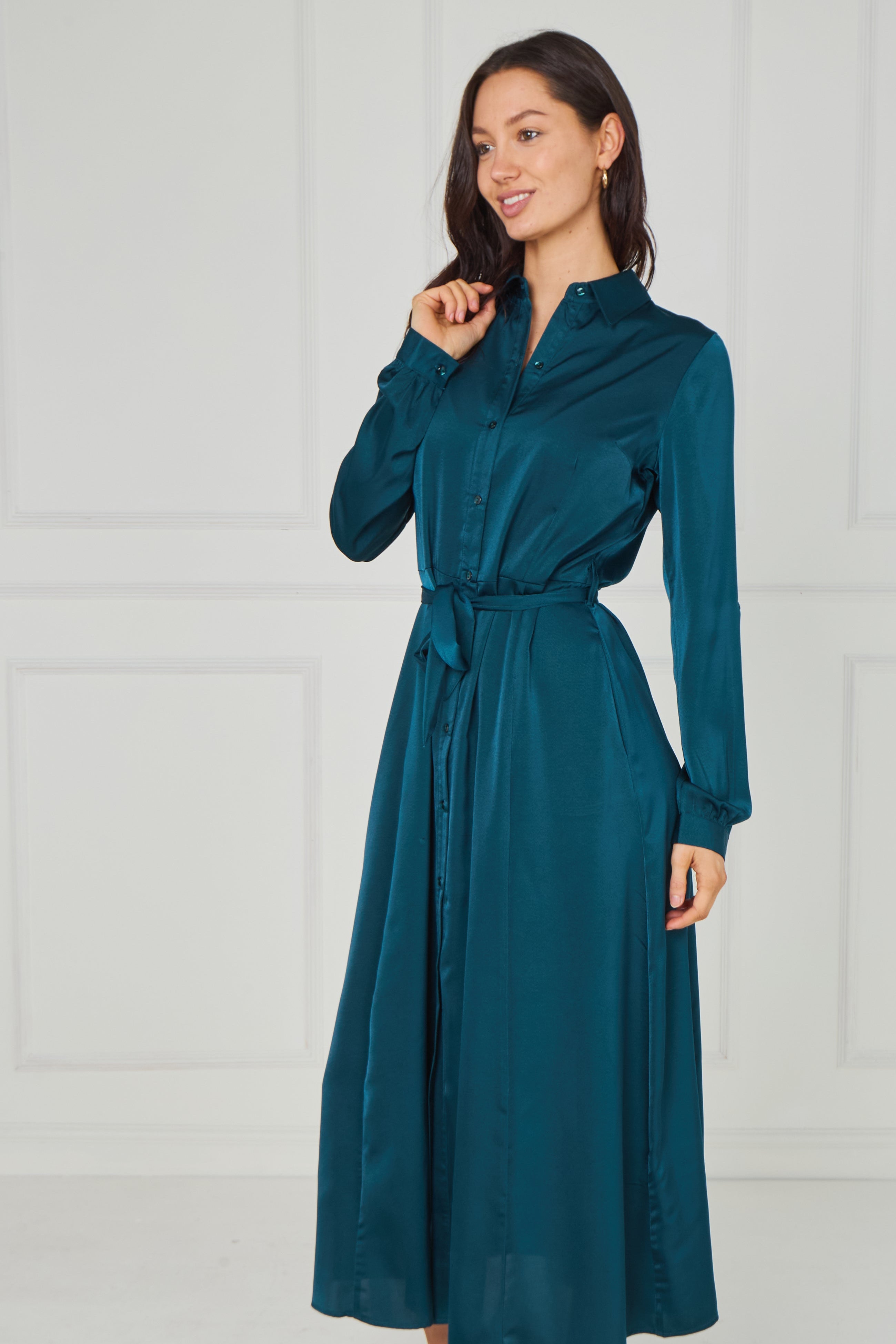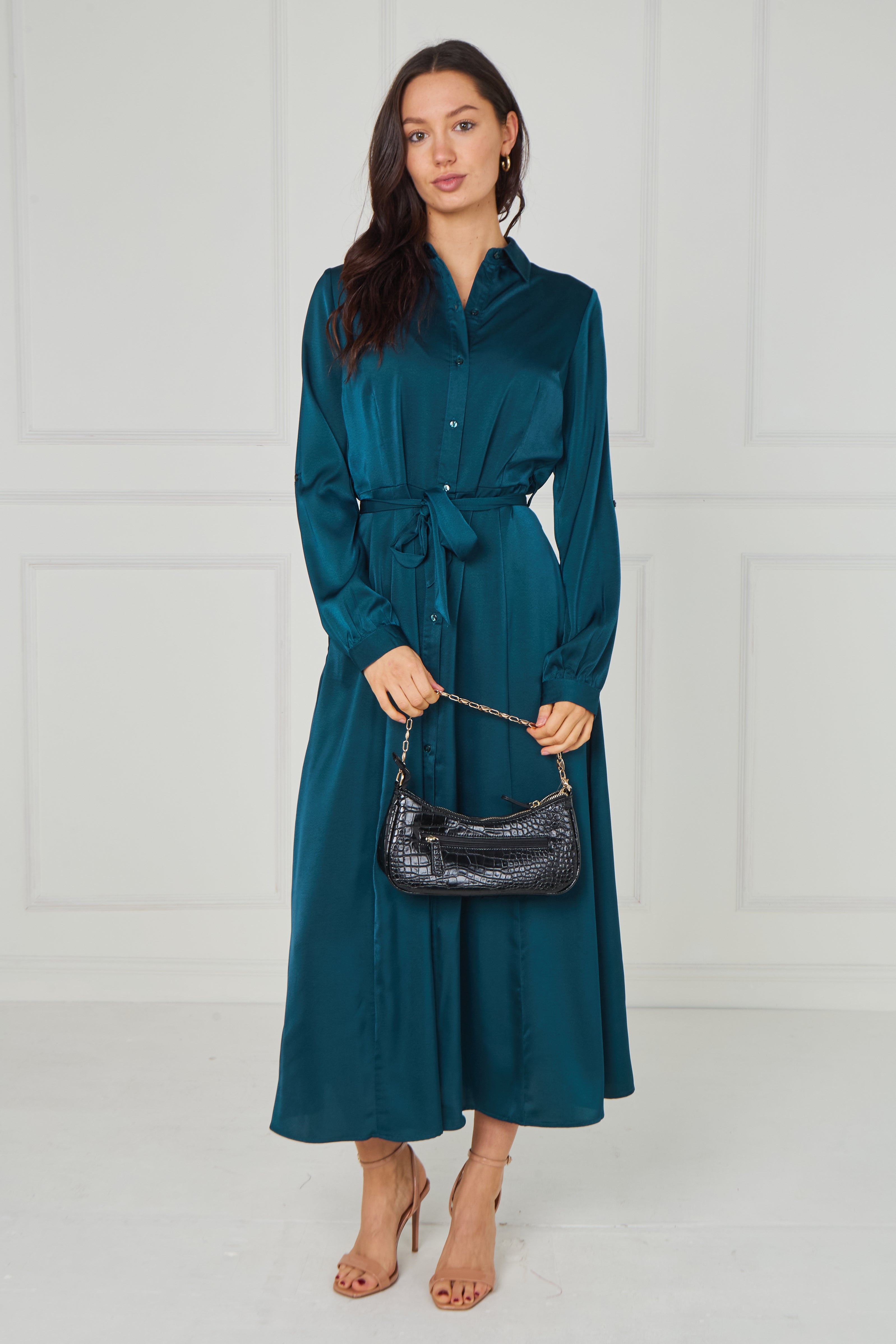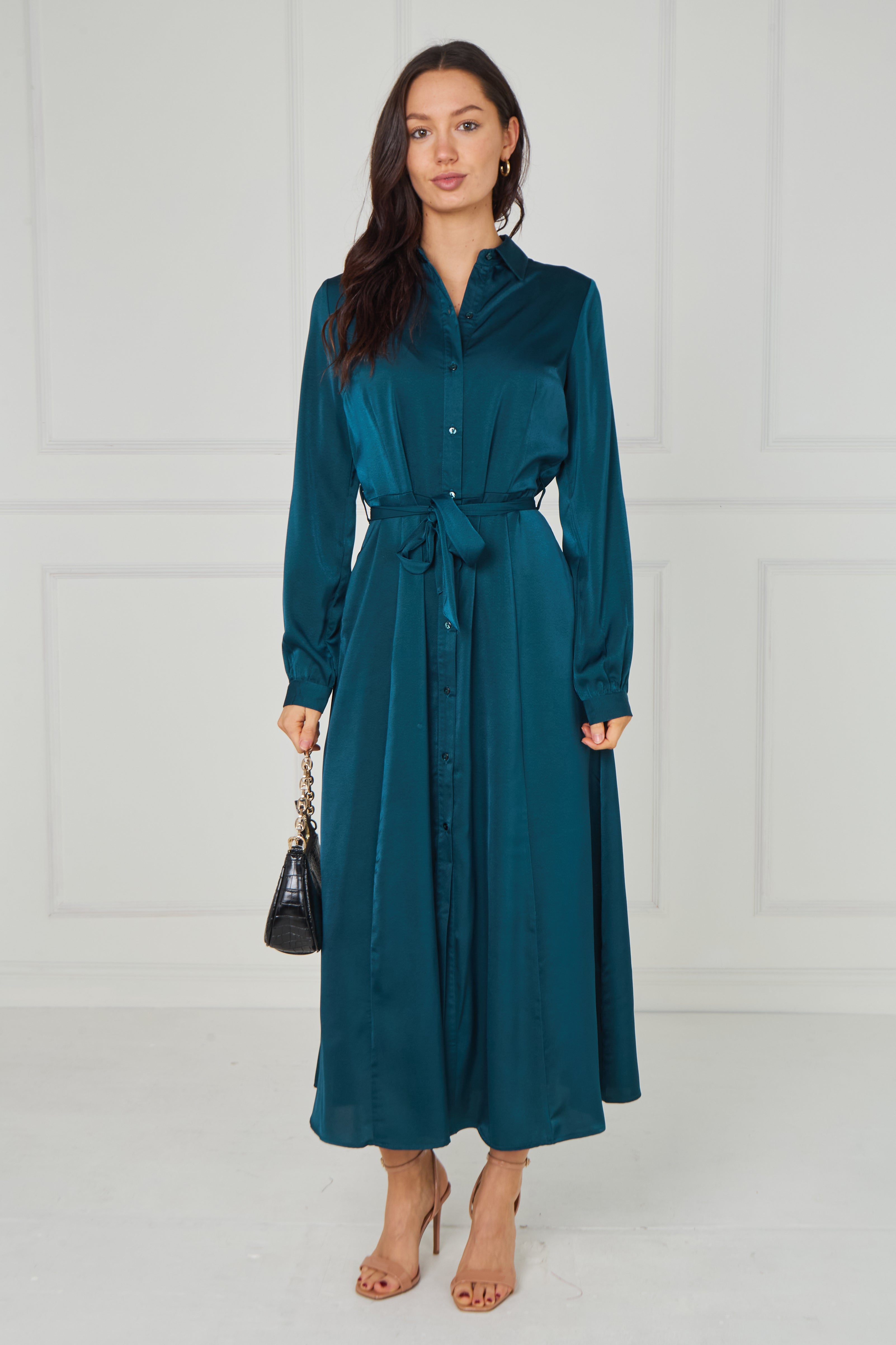 Sophisticated and effortlessly refined, the Teal Velvety Satin Maxi Shirt Dress features a rich jewel-toned teal hue enhanced by a soft velvety satin finish that catches the light beautifully. Designed with a classic shirt collar, full button-through front, and long sleeves with gently gathered cuffs, it offers timeless elegance with a modern touch. The self-tie waist belt defines the silhouette for a flattering fit, while the flowing maxi-length skirt creates graceful movement. Finished with two side pockets for added practicality, this versatile dress transitions seamlessly from polished daytime styling to elevated evening occasions.