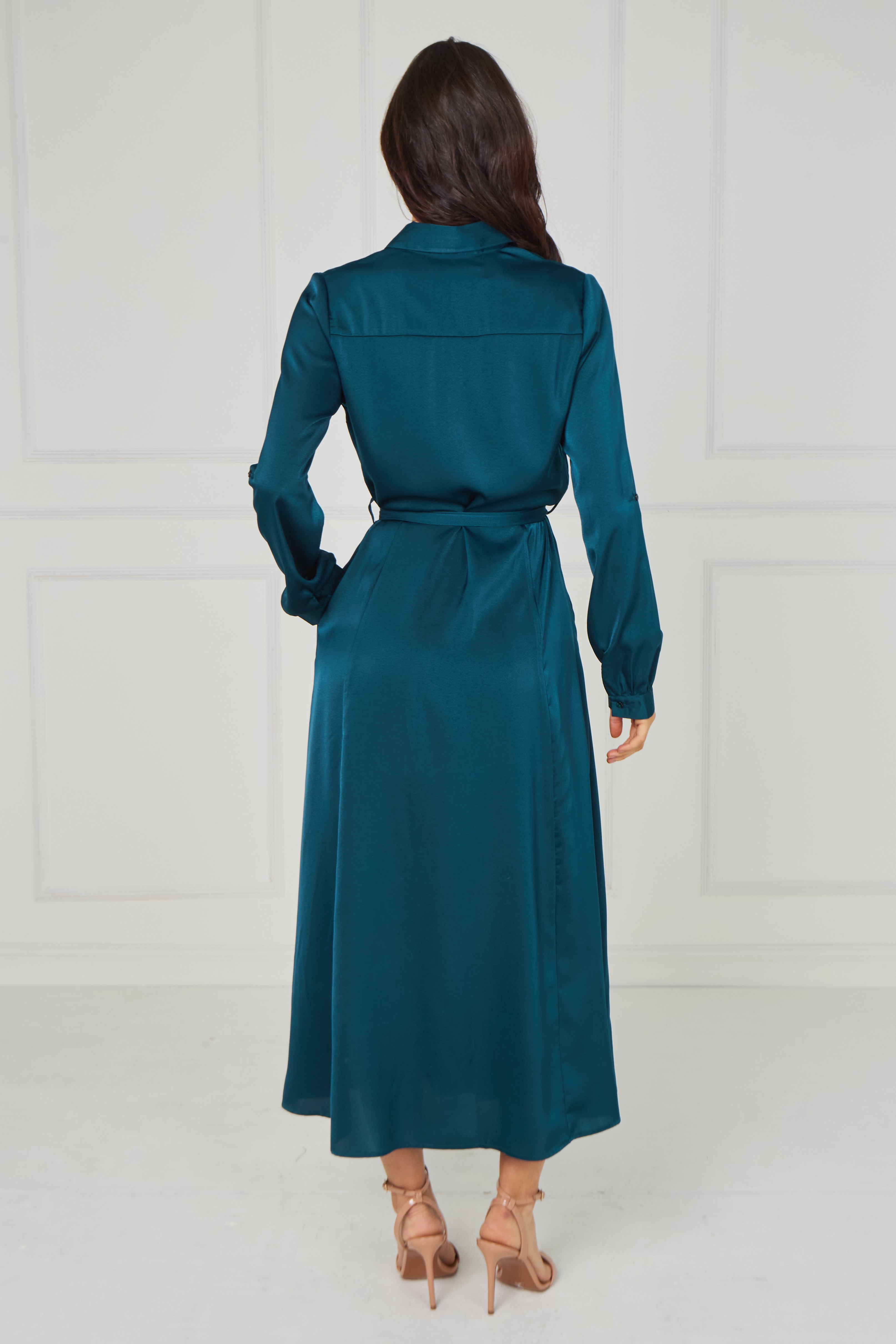 Teal Velvety Satin Maxi Shirt Dress
