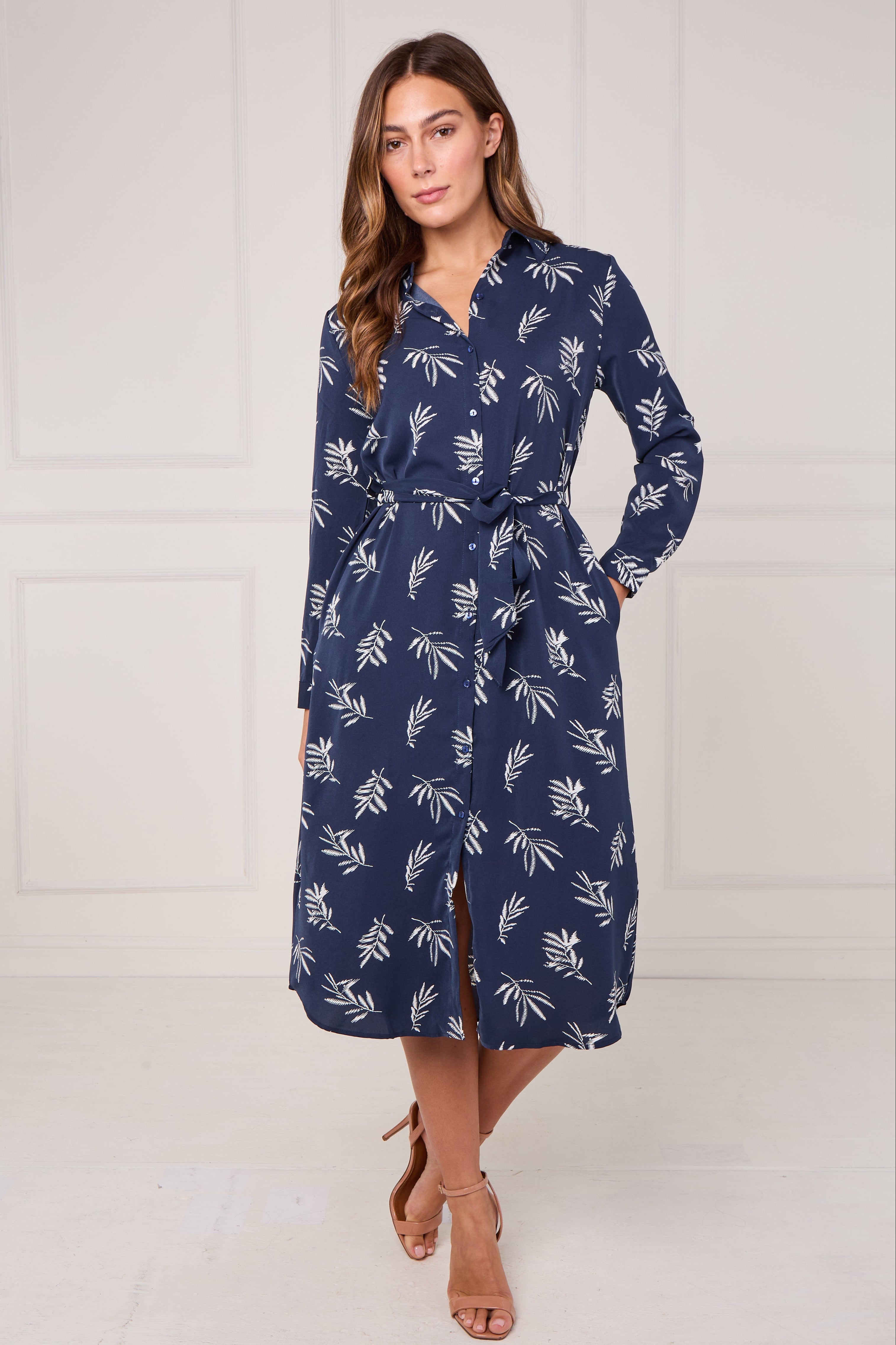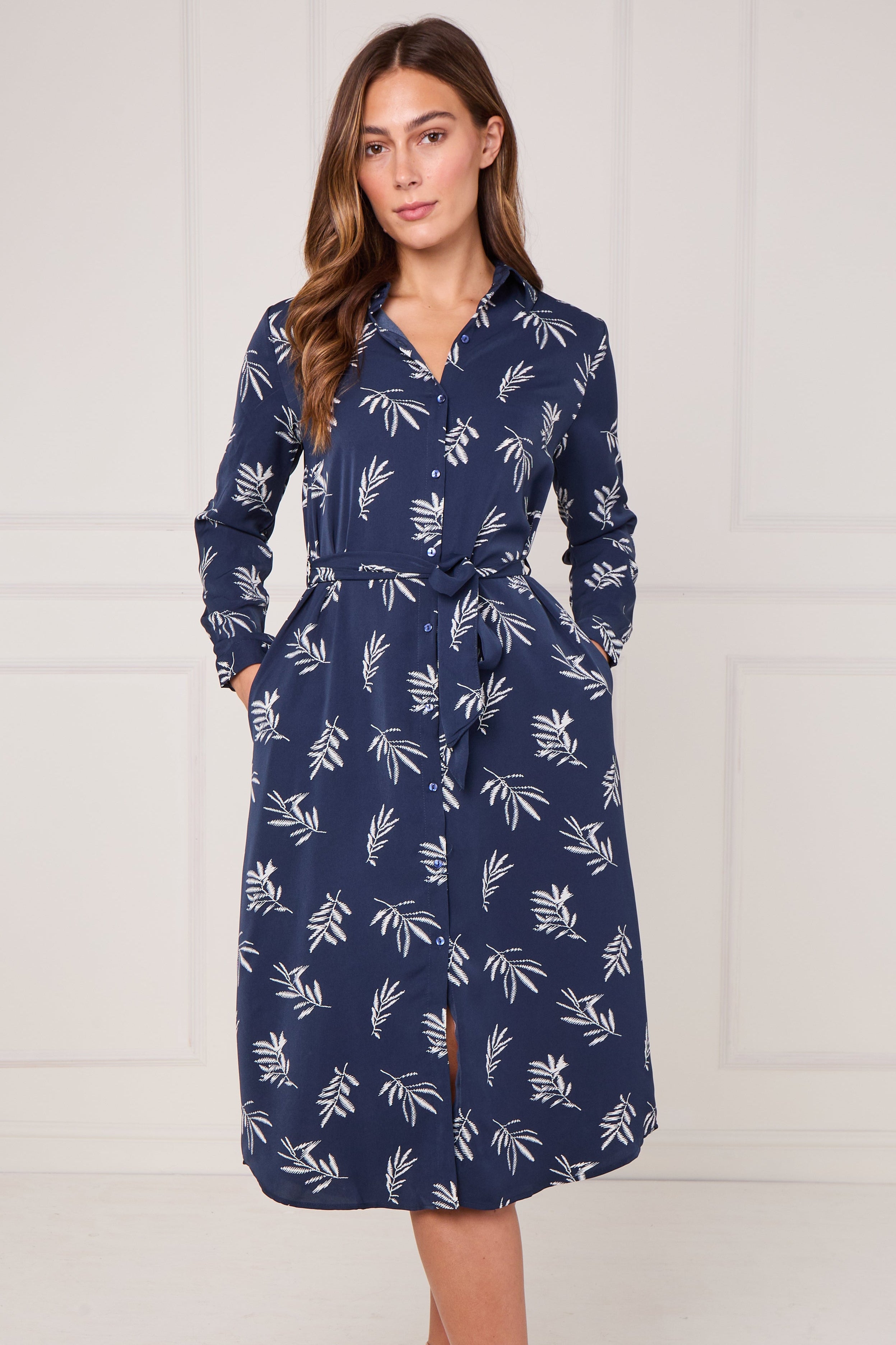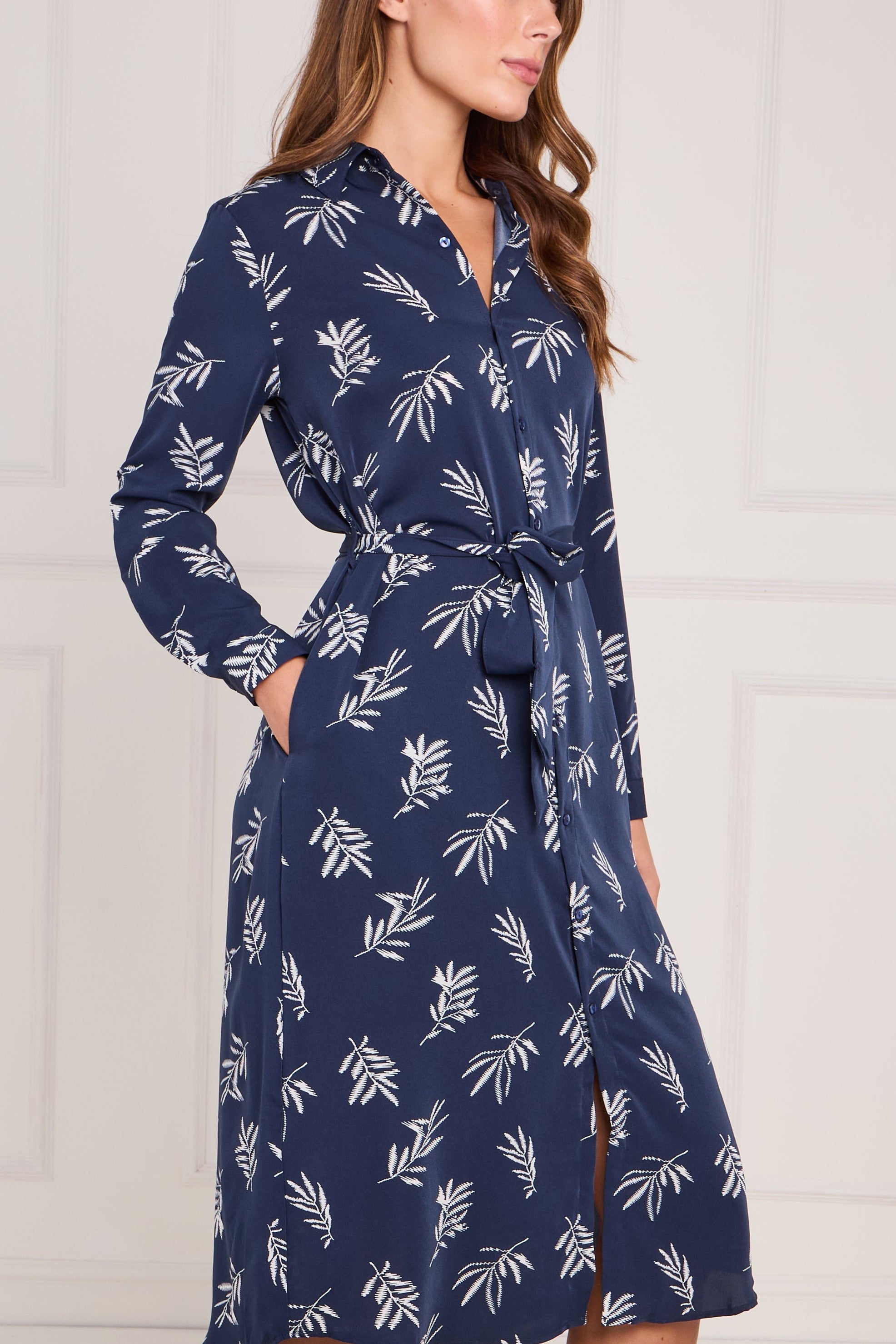 A slim-fit midi shirt dress in deep navy featuring an elegant stitched leaf effect print, crafted with a classic shirt collar, full button front, roll-up tab sleeves, practical side seam pockets and a detachable matching belt to define the waist. Effortlessly refined and versatile, this piece transitions beautifully from workdays to weekend brunch, city strolls or relaxed evening plans — polished, feminine and quietly sophisticated.