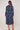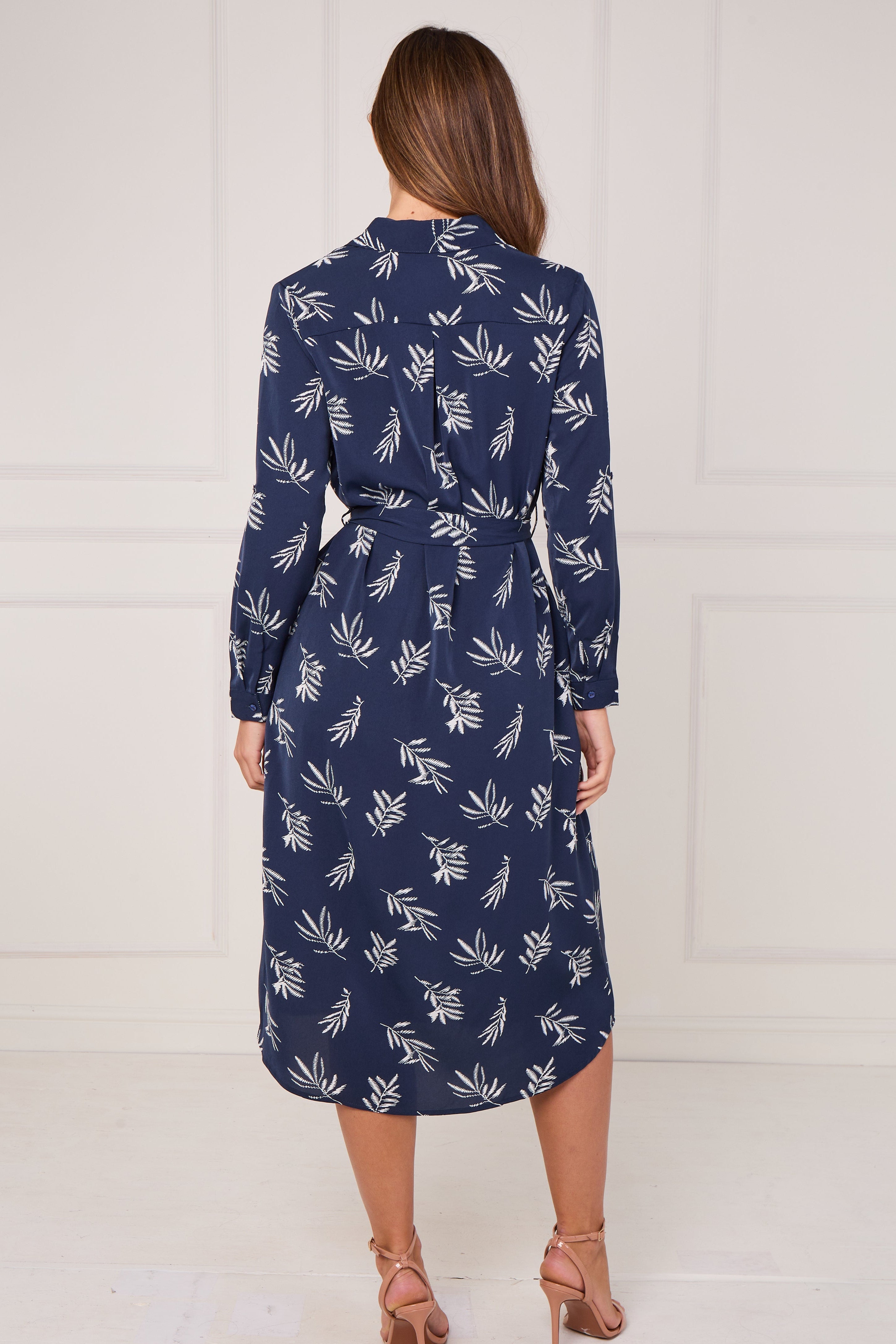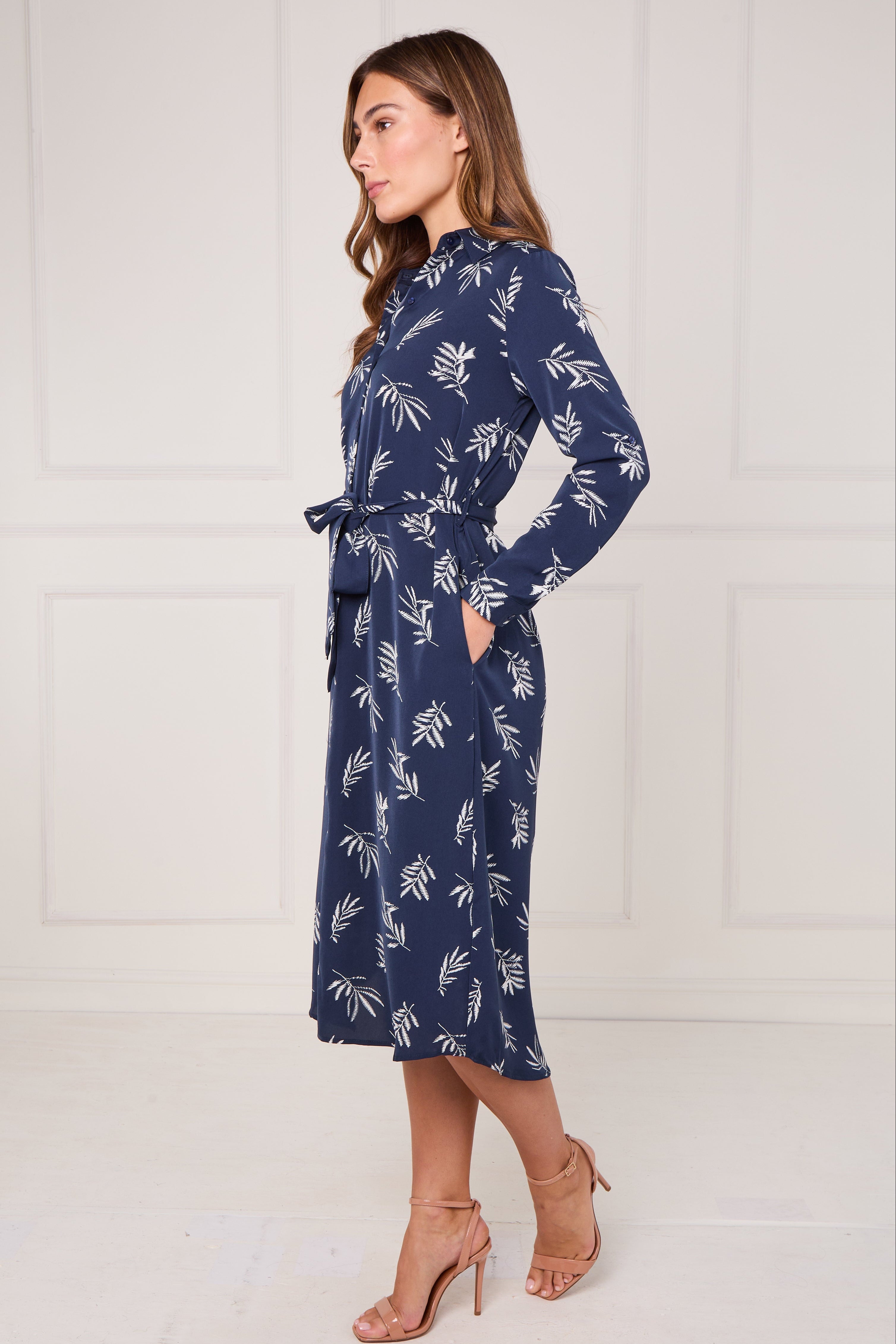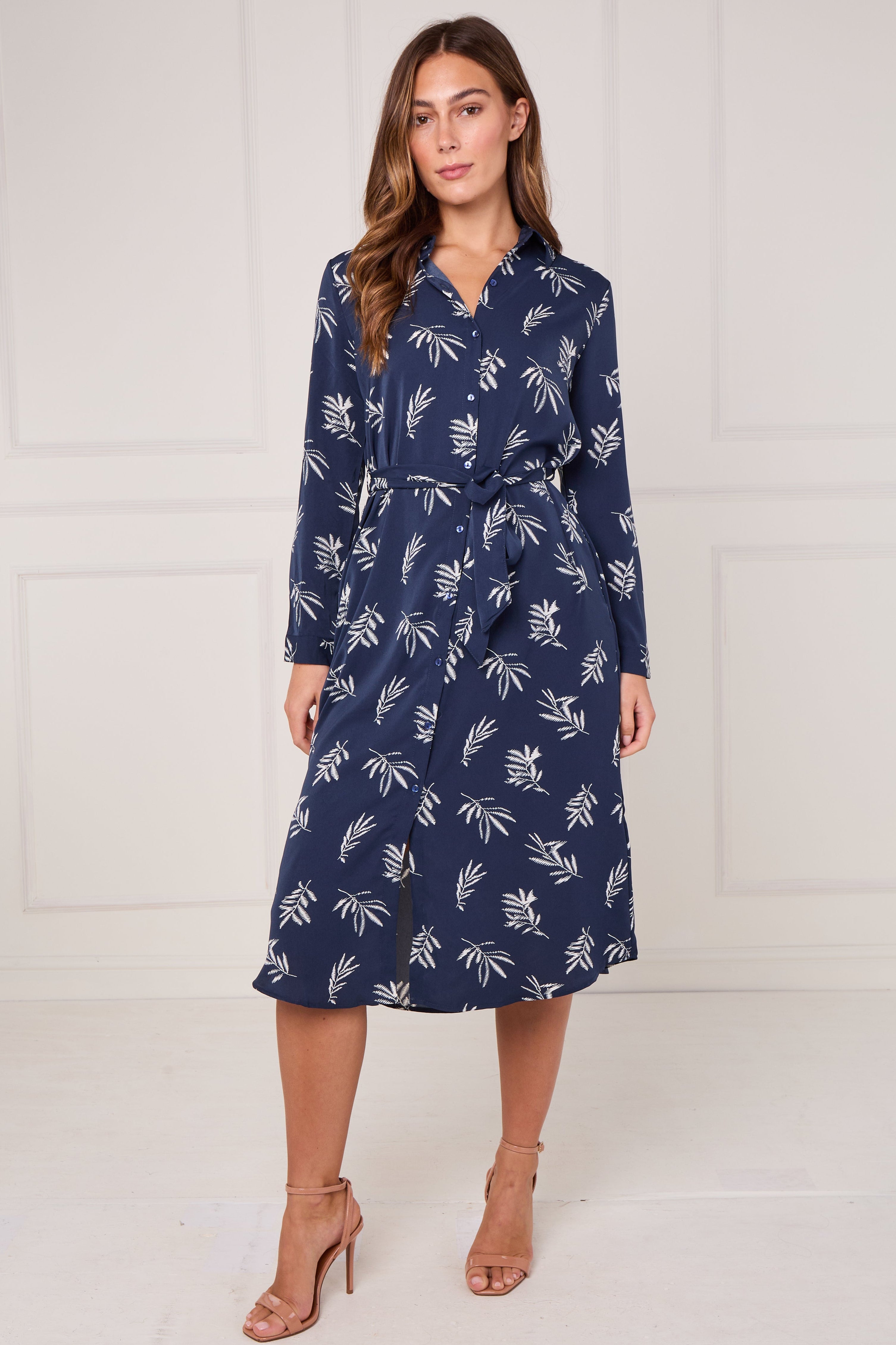 A slim-fit midi shirt dress in deep navy featuring an elegant stitched leaf effect print, crafted with a classic shirt collar, full button front, roll-up tab sleeves, practical side seam pockets and a detachable matching belt to define the waist. Effortlessly refined and versatile, this piece transitions beautifully from workdays to weekend brunch, city strolls or relaxed evening plans — polished, feminine and quietly sophisticated.