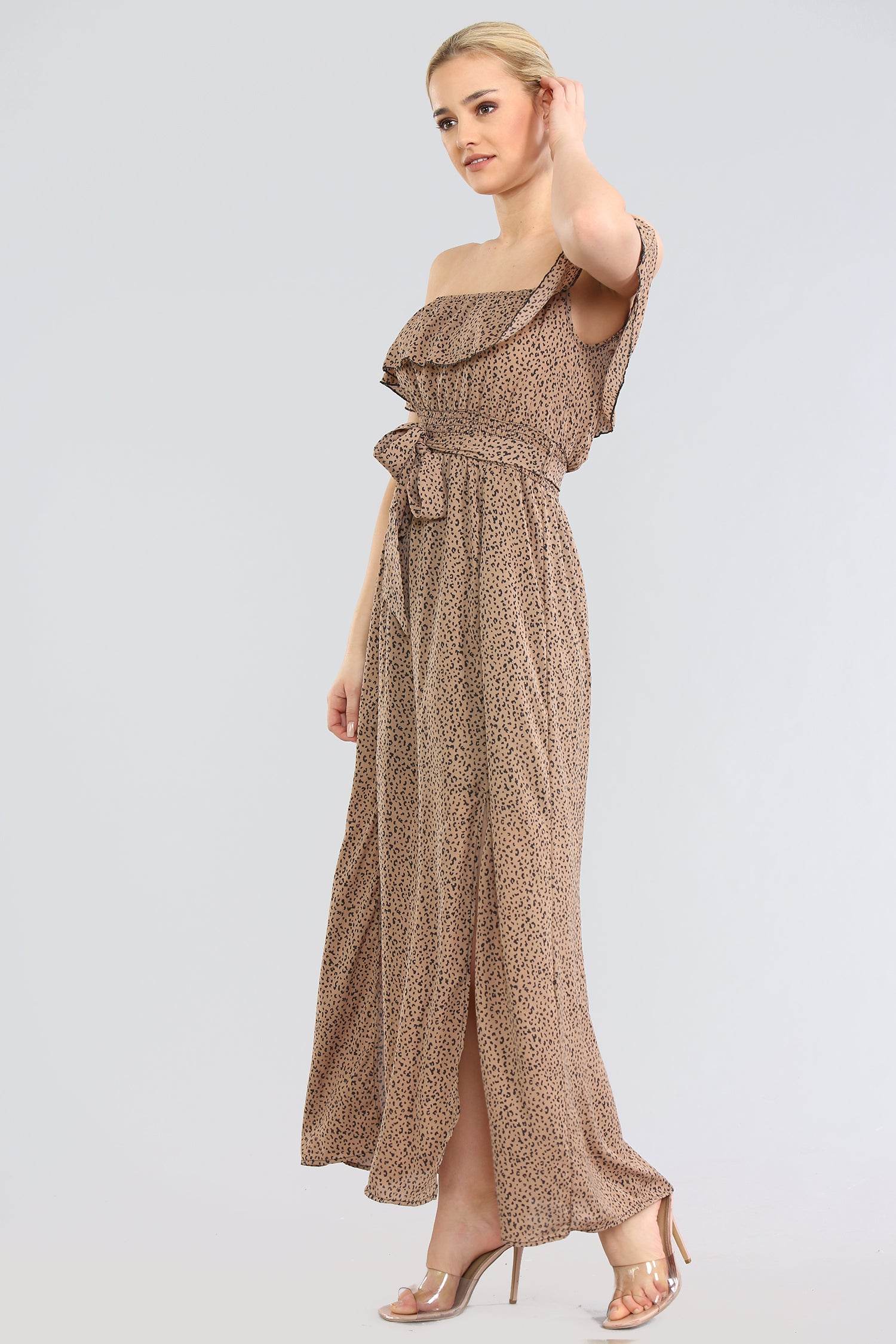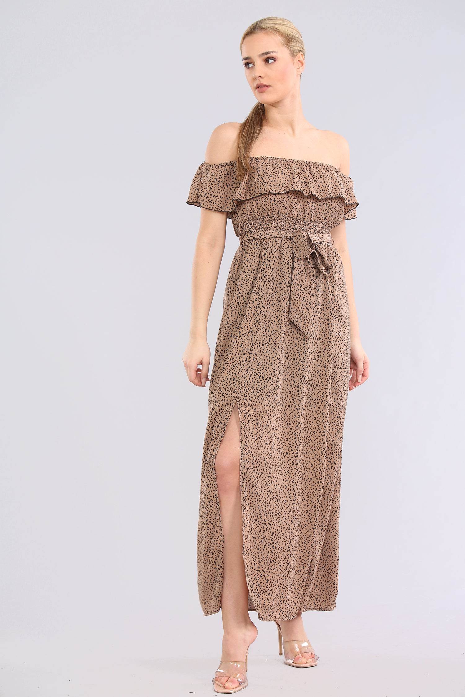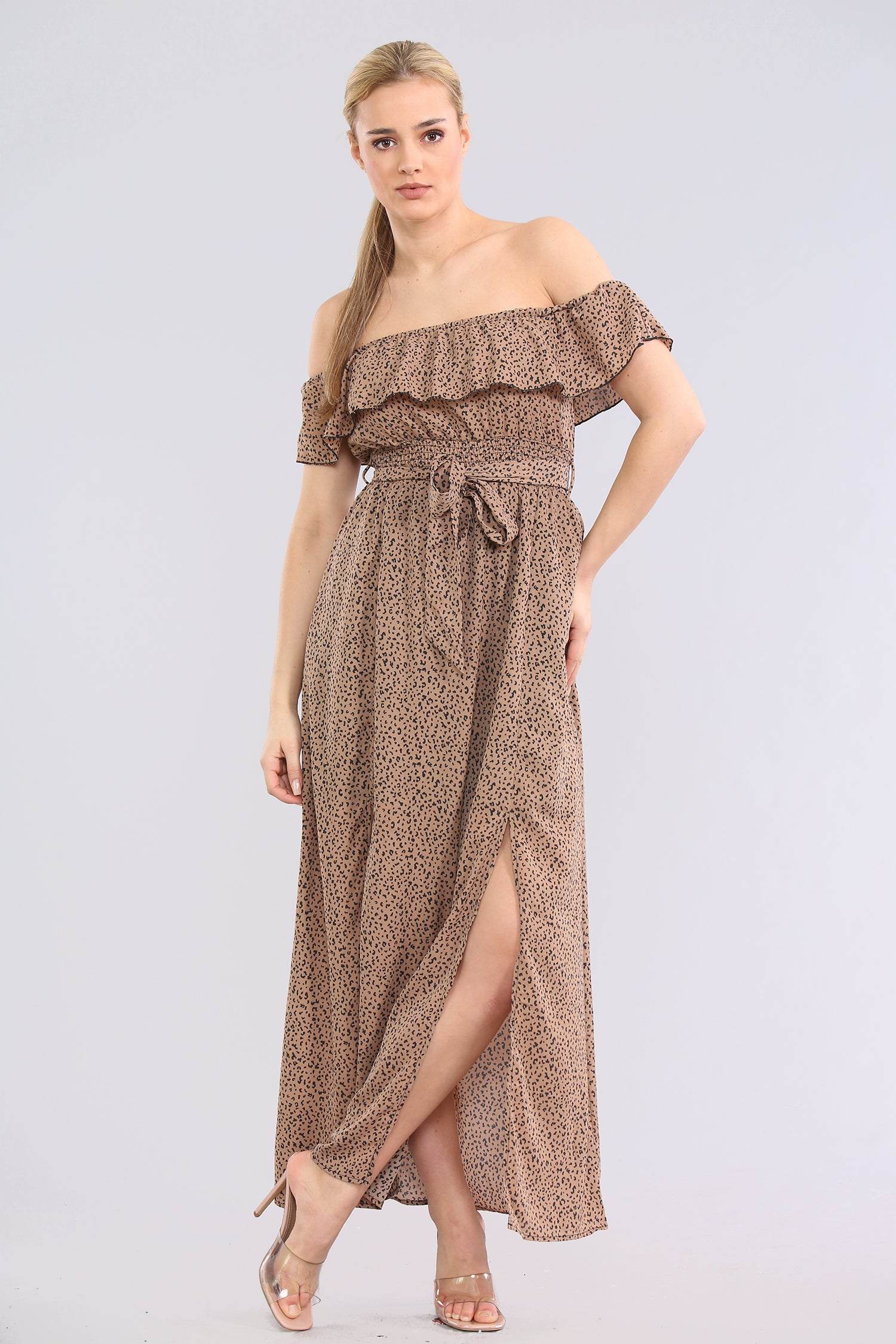 This tan maxi dress showcases a bold leopard print with a frilly bardot neckline, adding a playful yet sophisticated touch. Its long, flowing silhouette makes it perfect for summer events, garden parties, or chic beach outings. The off-shoulder design highlights the neckline, while the print adds a wild twist to this elegant ensemble.
