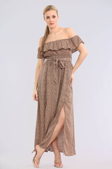 Tan Leopard Printed Frill Bardot Maxi Dress