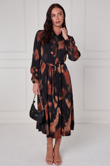 Capturing an artful, autumnal mood, this midi shirt dress showcases a rich brown abstract print with a softly washed effect that feels modern and effortless. The fabric moves beautifully with the body, while the detachable waist tie allows you to shape the silhouette as desired. Finished with a classic collar, relaxed long sleeves and discreet side pockets — a refined, expressive piece that works just as effortlessly for day plans as it does for evening.