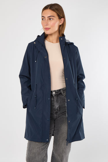 This navy parka is a classic outerwear piece that blends style with practicality. The hood is detailed with a striped lining, giving it a modern finish. Adjustable drawstrings at the waist allow for a flattering fit, while side pockets add everyday convenience. Lightweight and versatile, it¡¯s perfect for layering throughout the seasons.