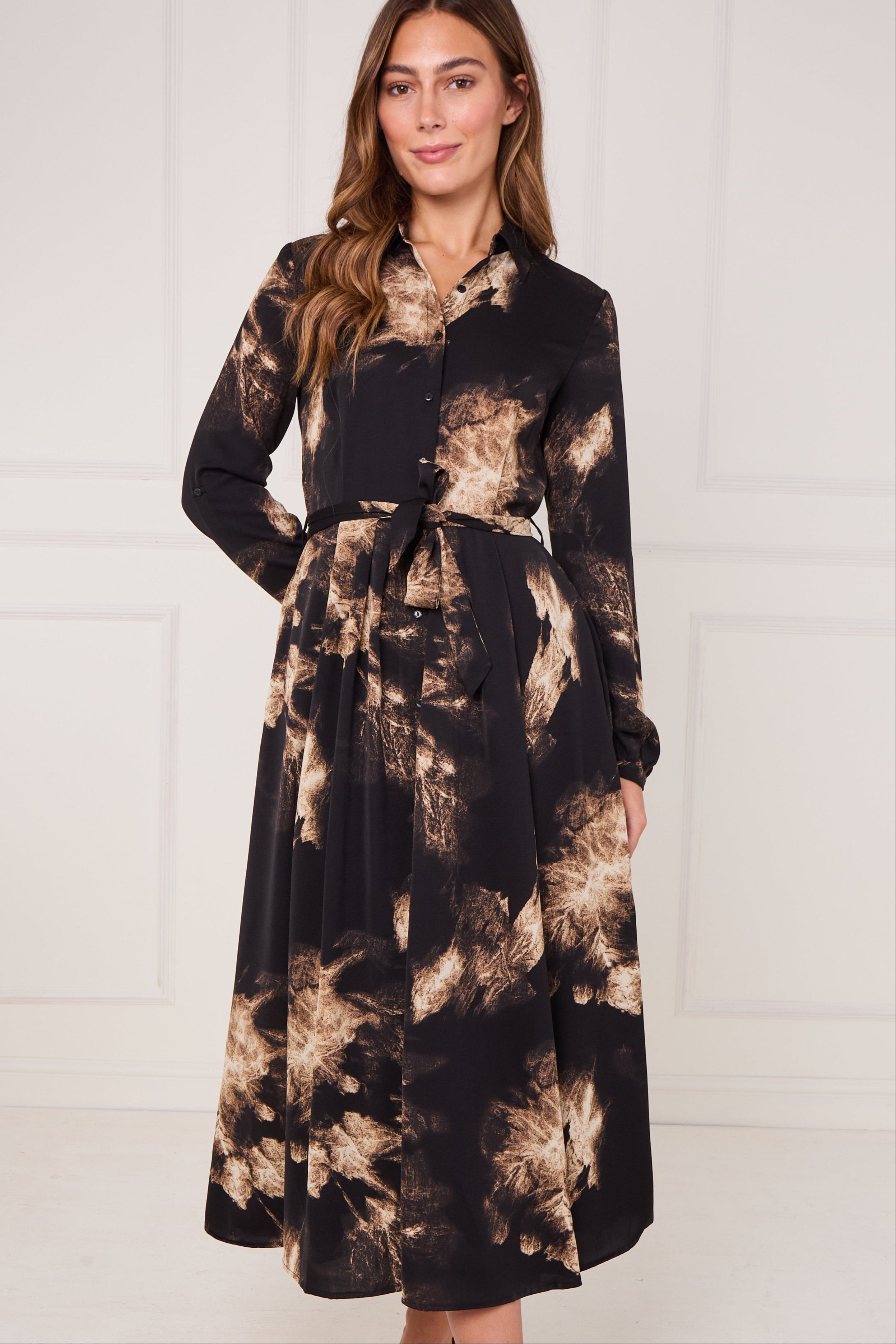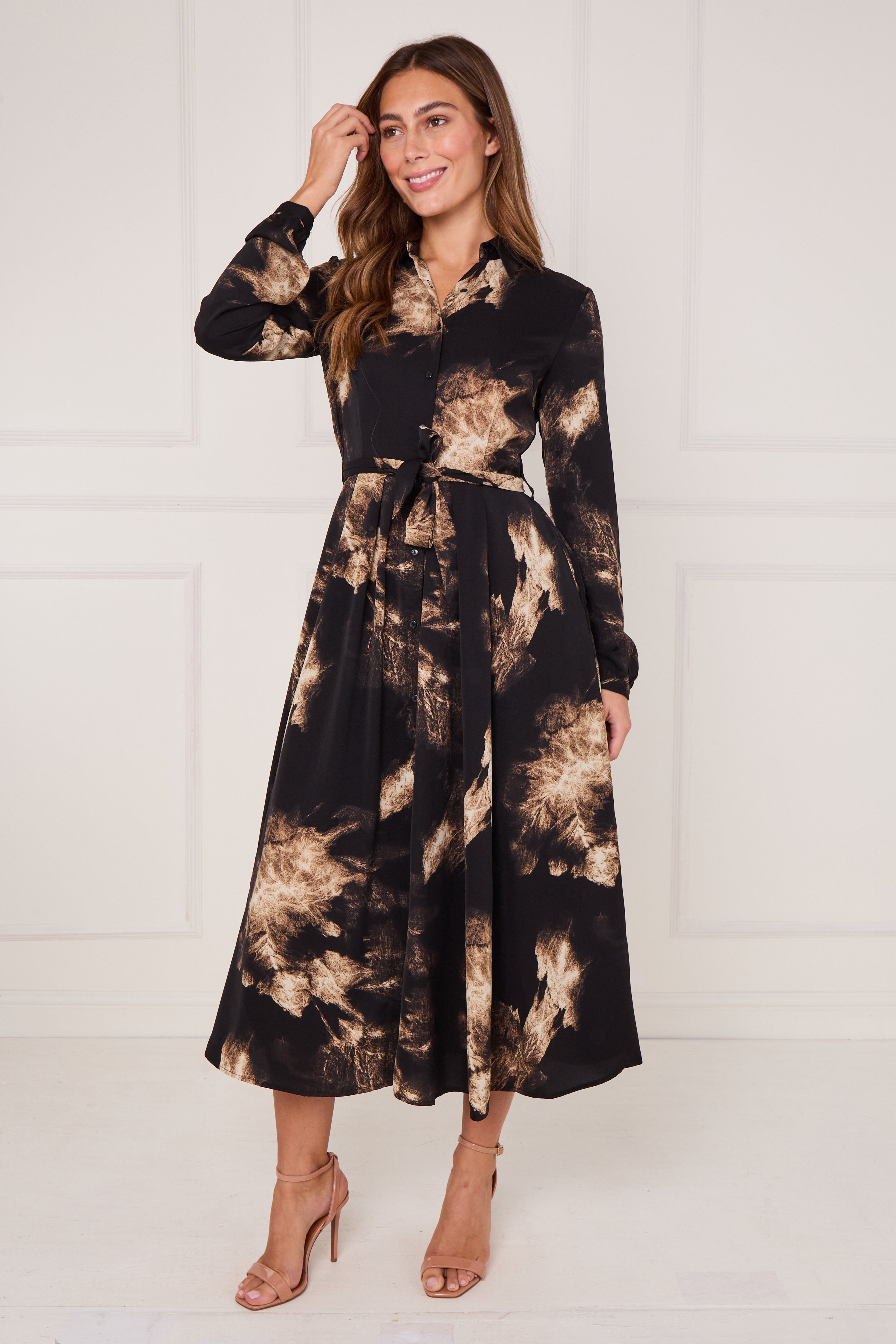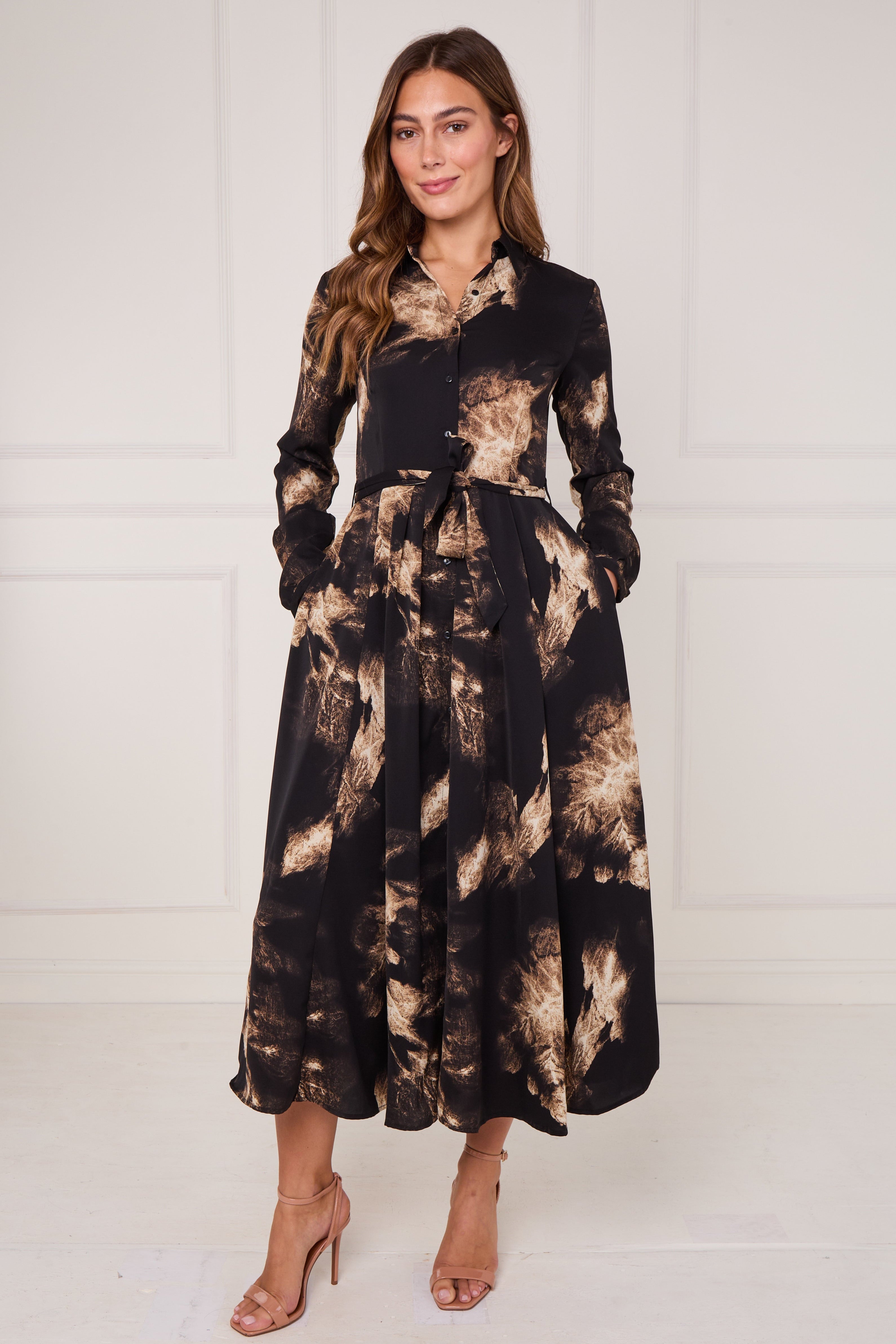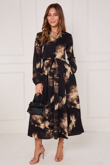 Elevate your wardrobe with our Black and Gold Tie Dye Print Maxi Shirt Dress, a statement piece that blends elegance with contemporary flair. Crafted from soft, flowing fabric, it features a classic button-through front, a self-tie belt to cinch the waist, and practical side pockets for added convenience. The striking gold tie dye pattern set against a deep black background adds a luxurious, artistic edge. Perfect for both daytime sophistication and evening occasions, this maxi dress pairs beautifully with heels and a sleek handbag. A timeless choice for effortless glamour and modern femininity.