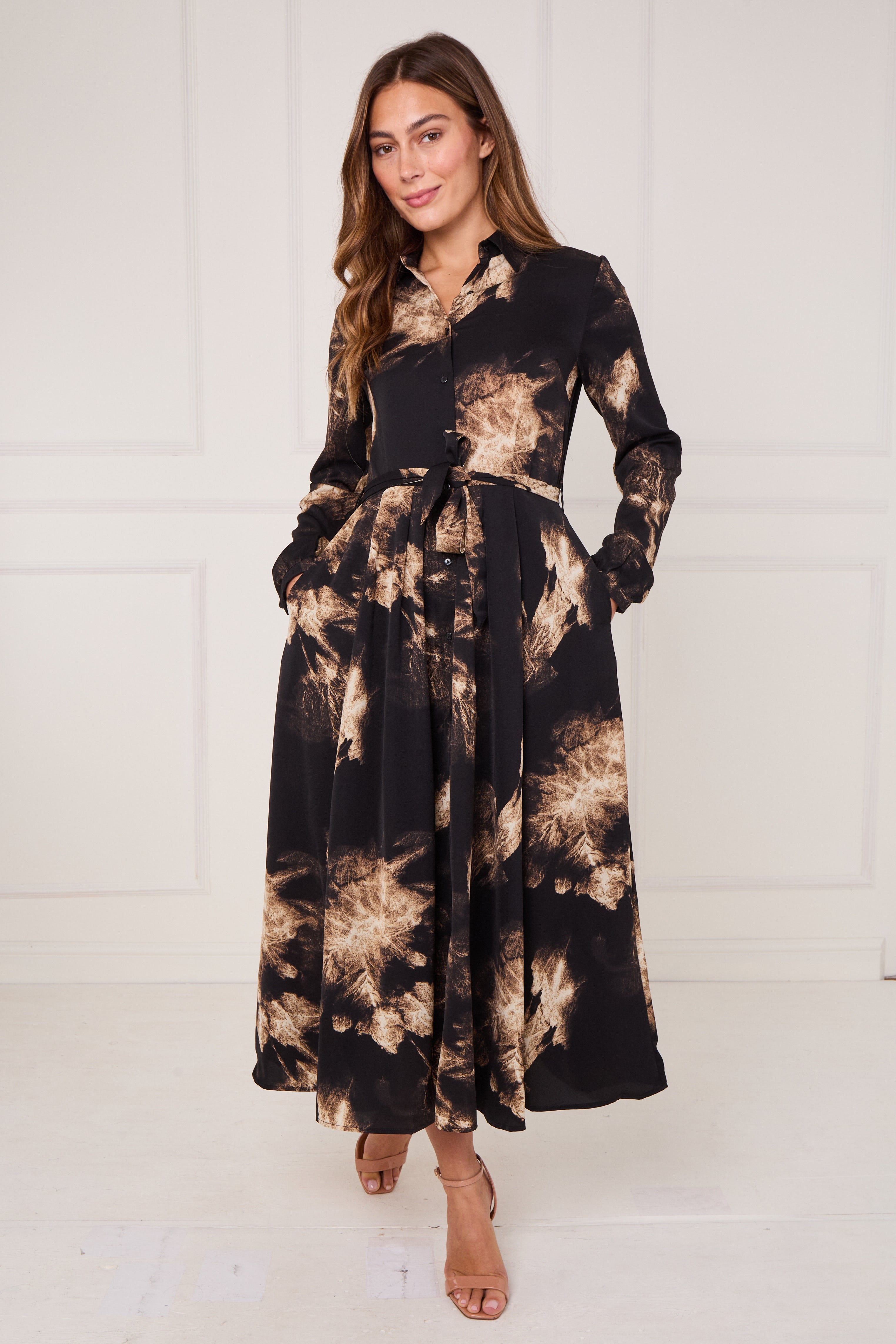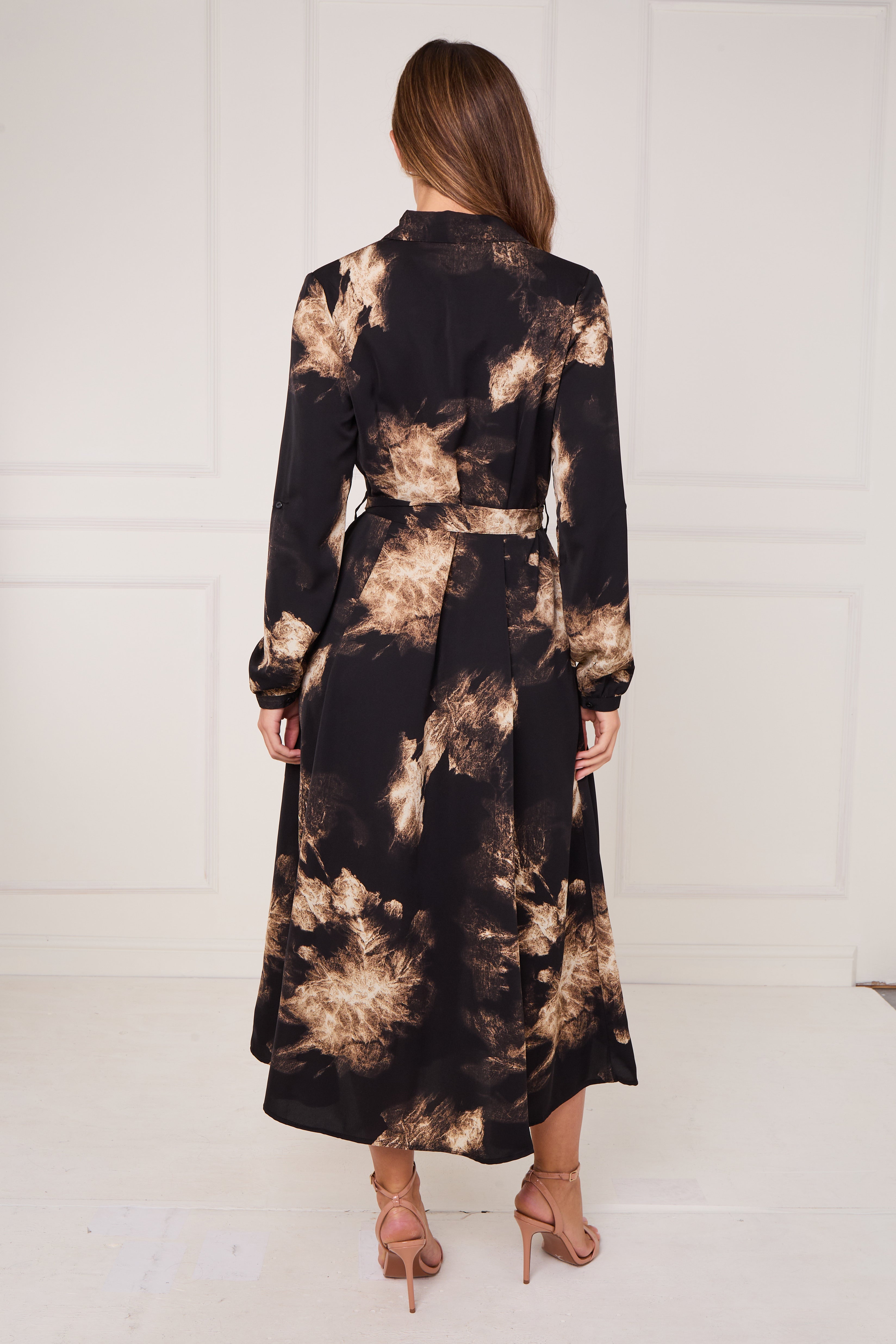 Black and Gold Tie Dye Print Maxi Shirt Dress