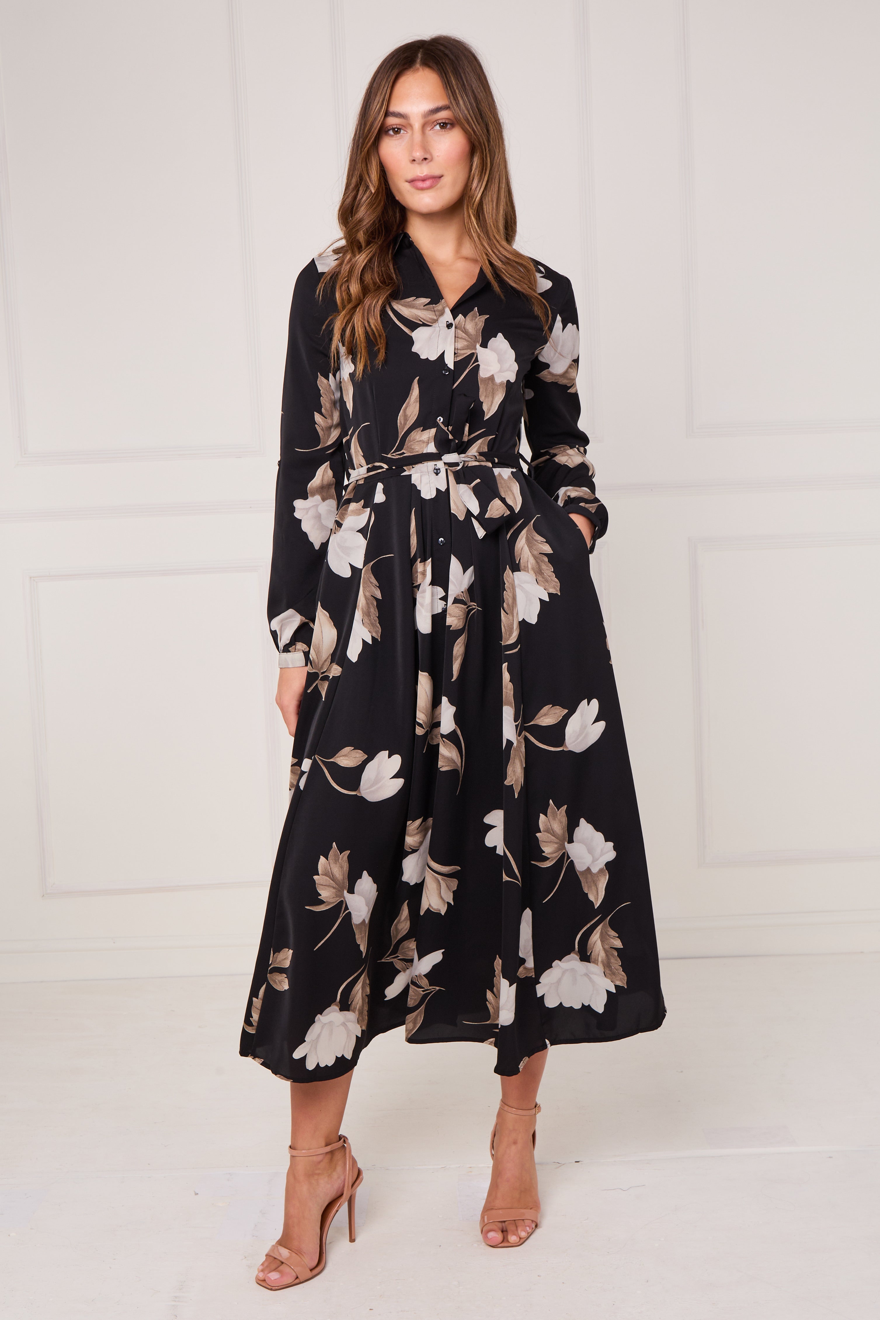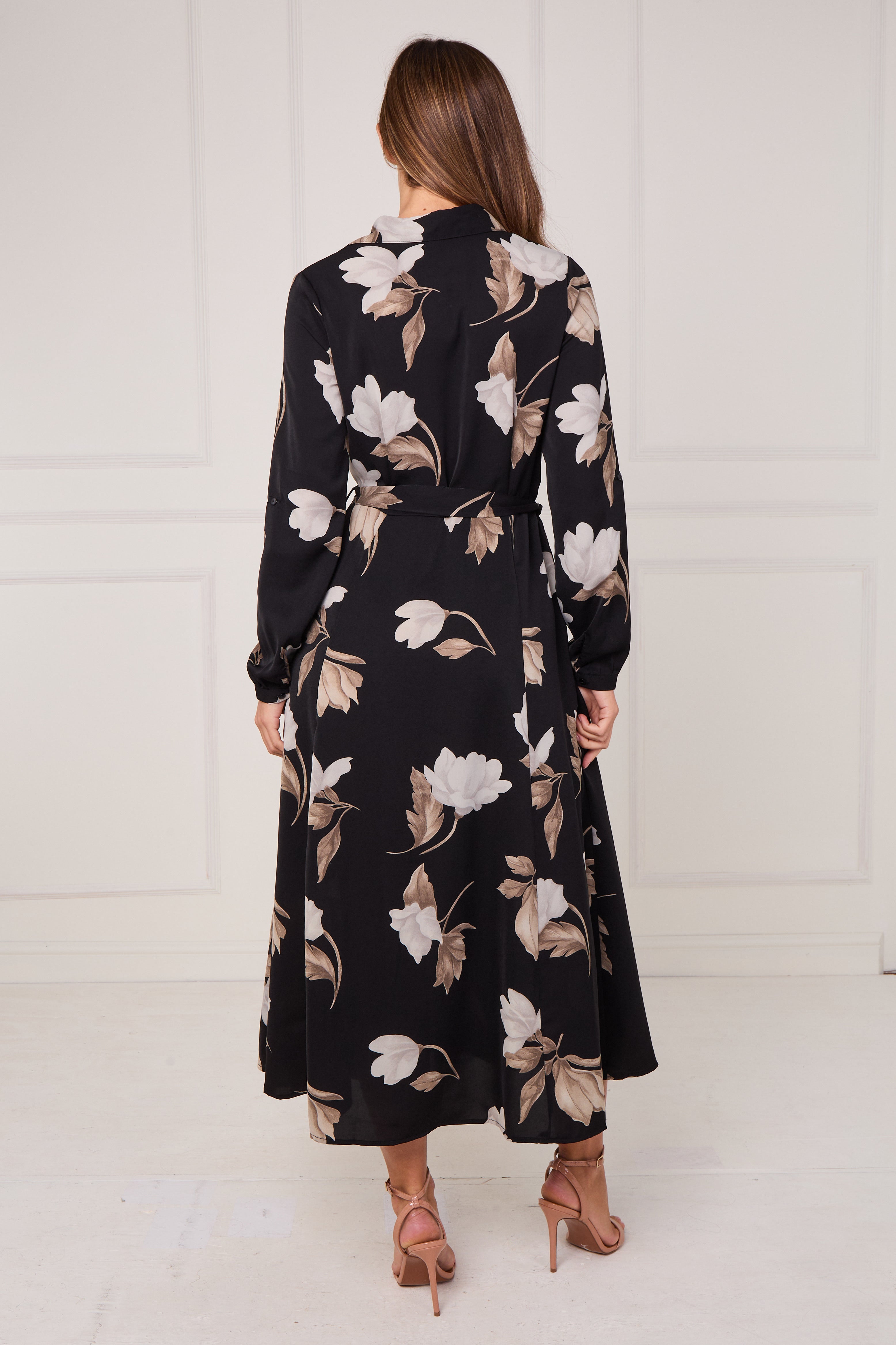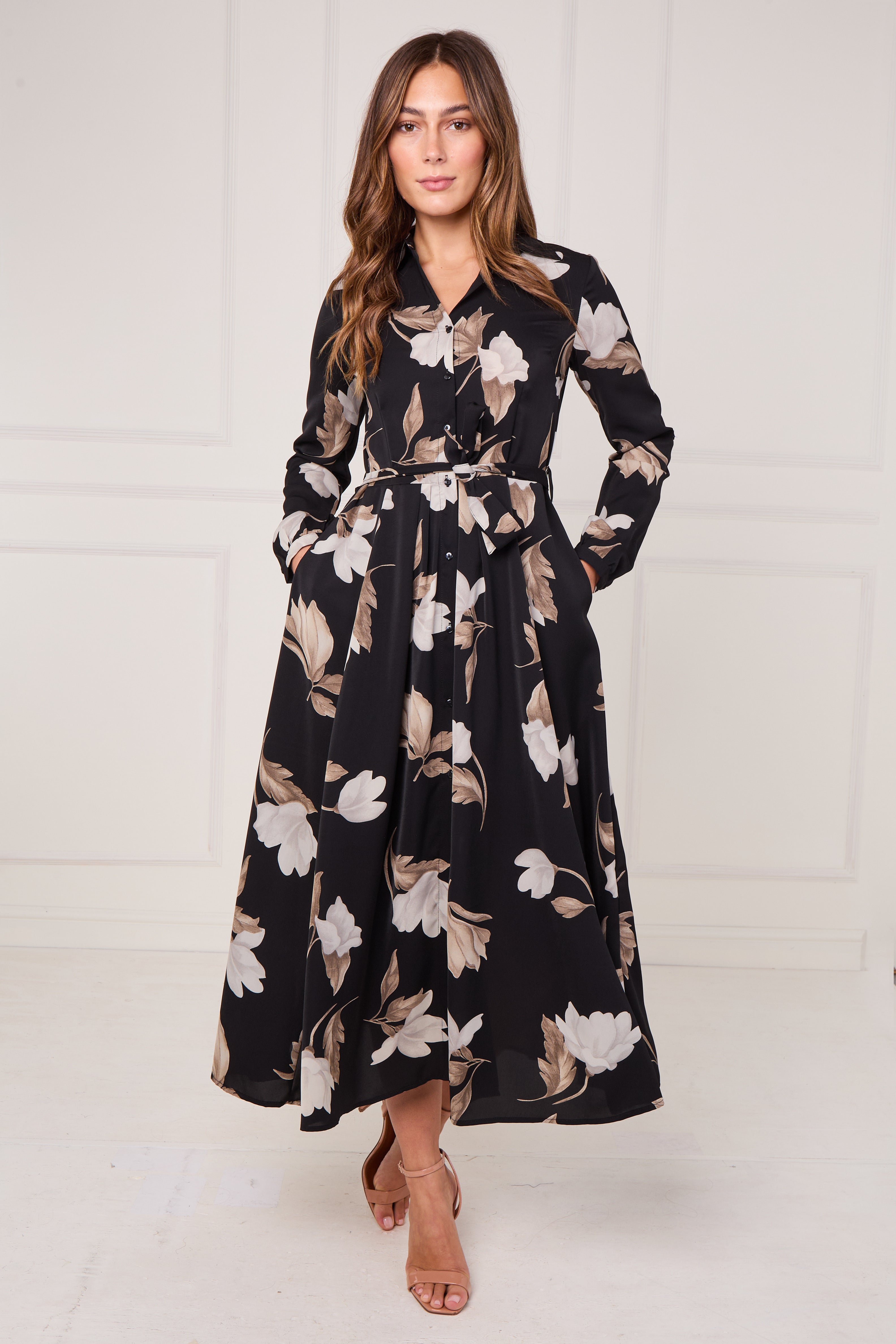 Bring timeless elegance to your wardrobe with our Black and Taupe Magnolia Print Maxi Shirt Dress, a refined choice for both casual and special occasions. Made from a soft, flowing fabric, it features a full button-through front, a waist-defining self-tie belt, and handy side pockets for everyday ease. The bold magnolia print in taupe and ivory tones stands out beautifully against the deep black background, creating a chic and feminine aesthetic. Perfect for work, brunch, or evening events, this dress transitions effortlessly from day to night. Pair with heels and a structured handbag for a polished, sophisticated finish.