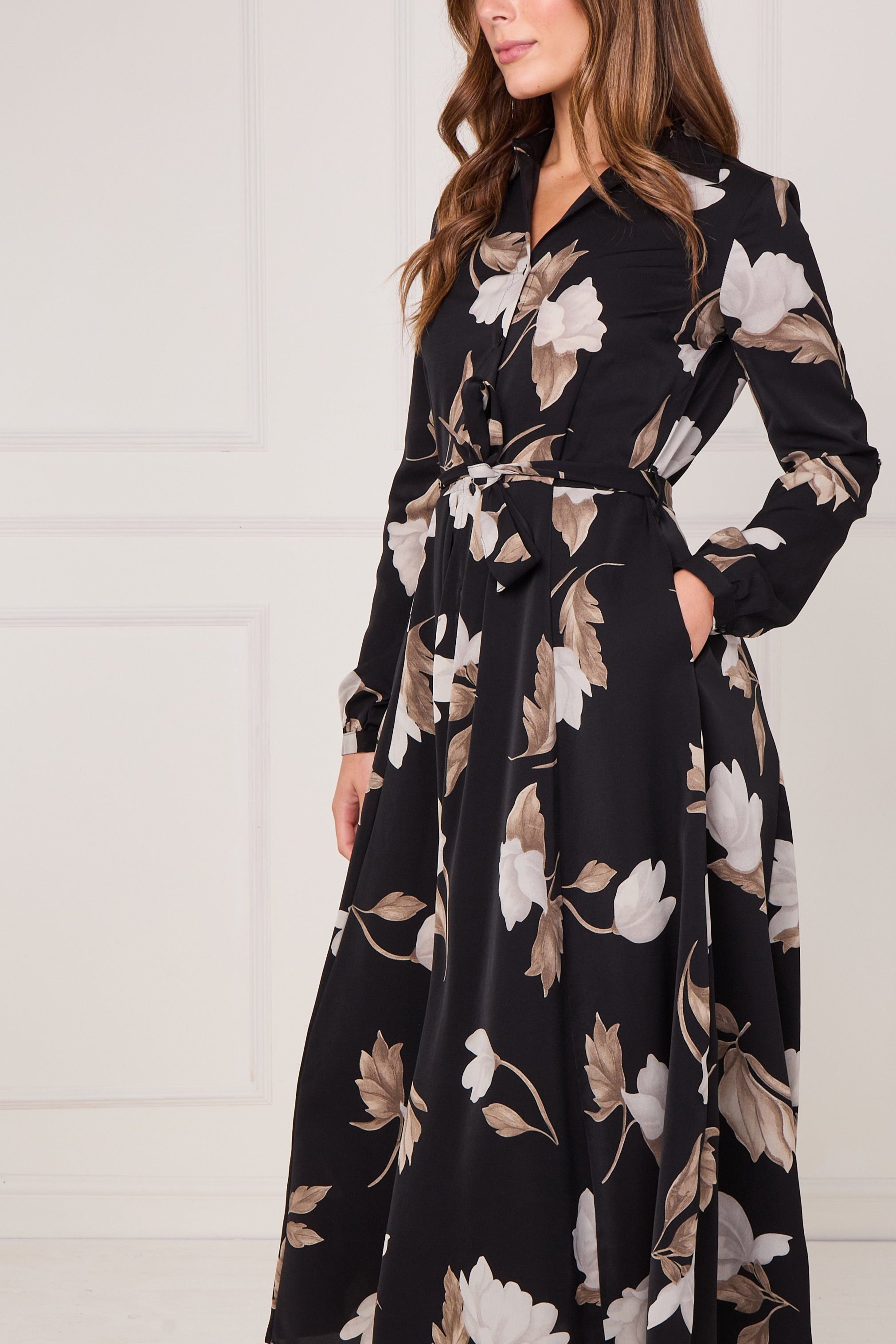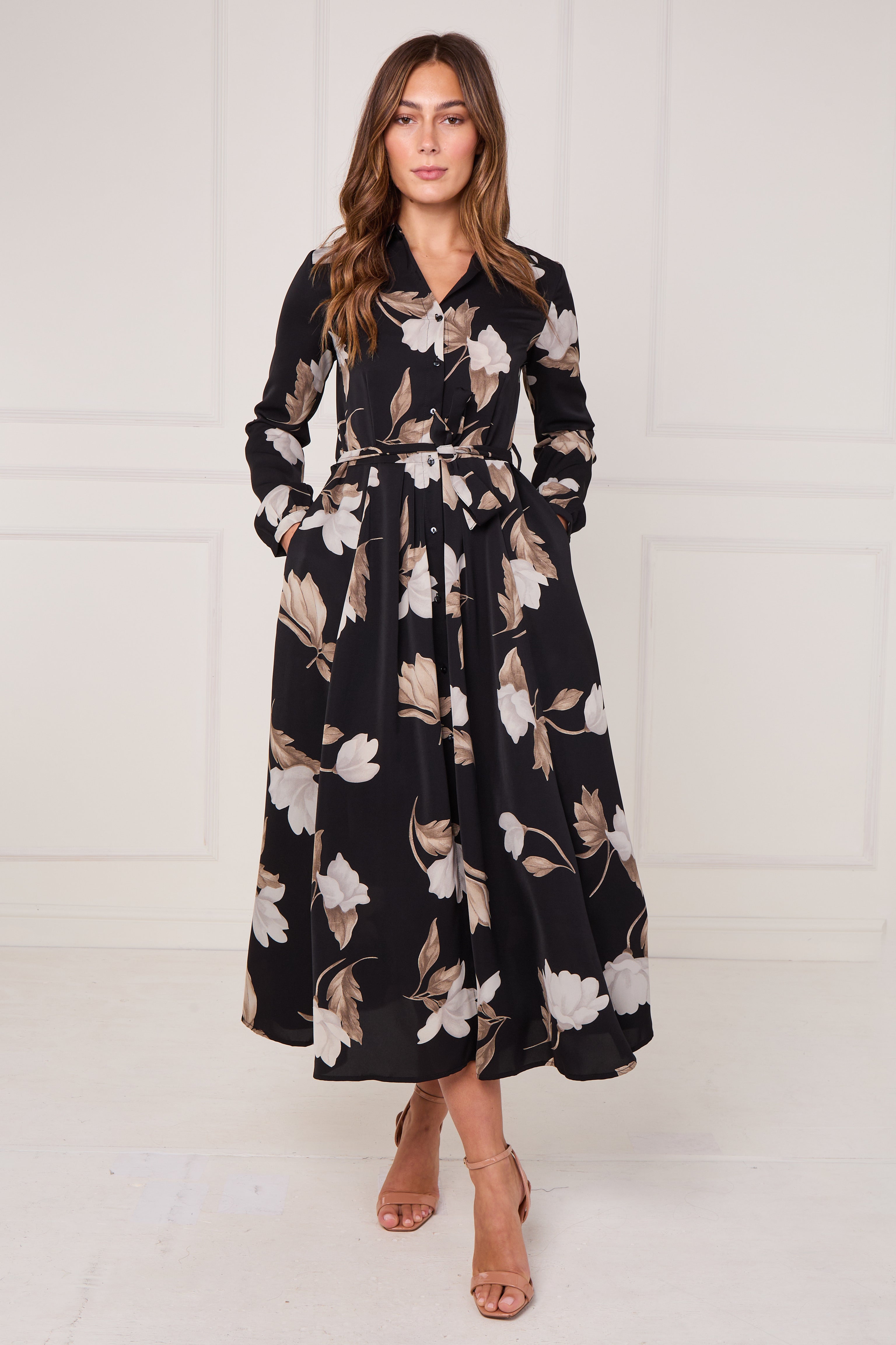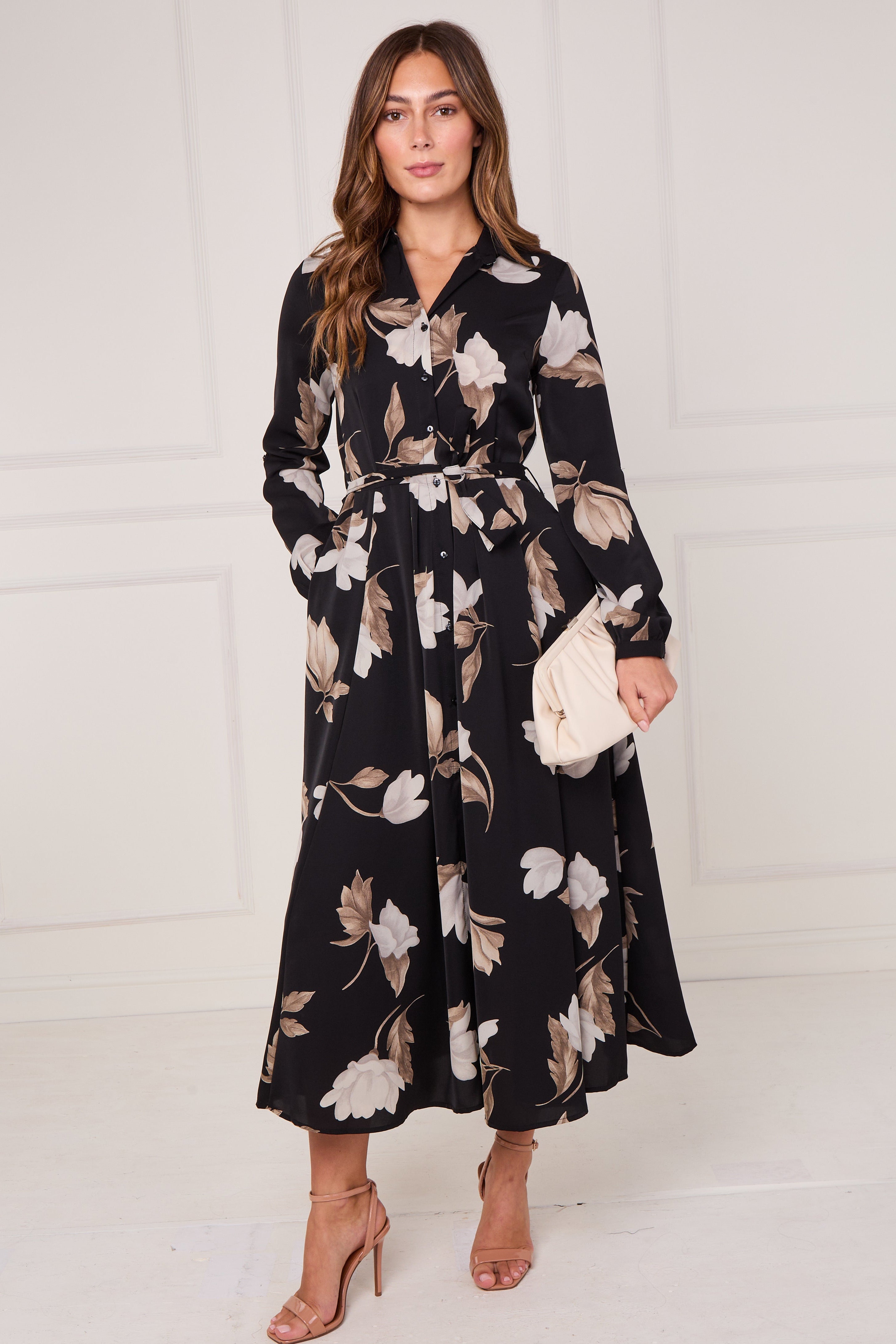 Bring timeless elegance to your wardrobe with our Black and Taupe Magnolia Print Maxi Shirt Dress, a refined choice for both casual and special occasions. Made from a soft, flowing fabric, it features a full button-through front, a waist-defining self-tie belt, and handy side pockets for everyday ease. The bold magnolia print in taupe and ivory tones stands out beautifully against the deep black background, creating a chic and feminine aesthetic. Perfect for work, brunch, or evening events, this dress transitions effortlessly from day to night. Pair with heels and a structured handbag for a polished, sophisticated finish.