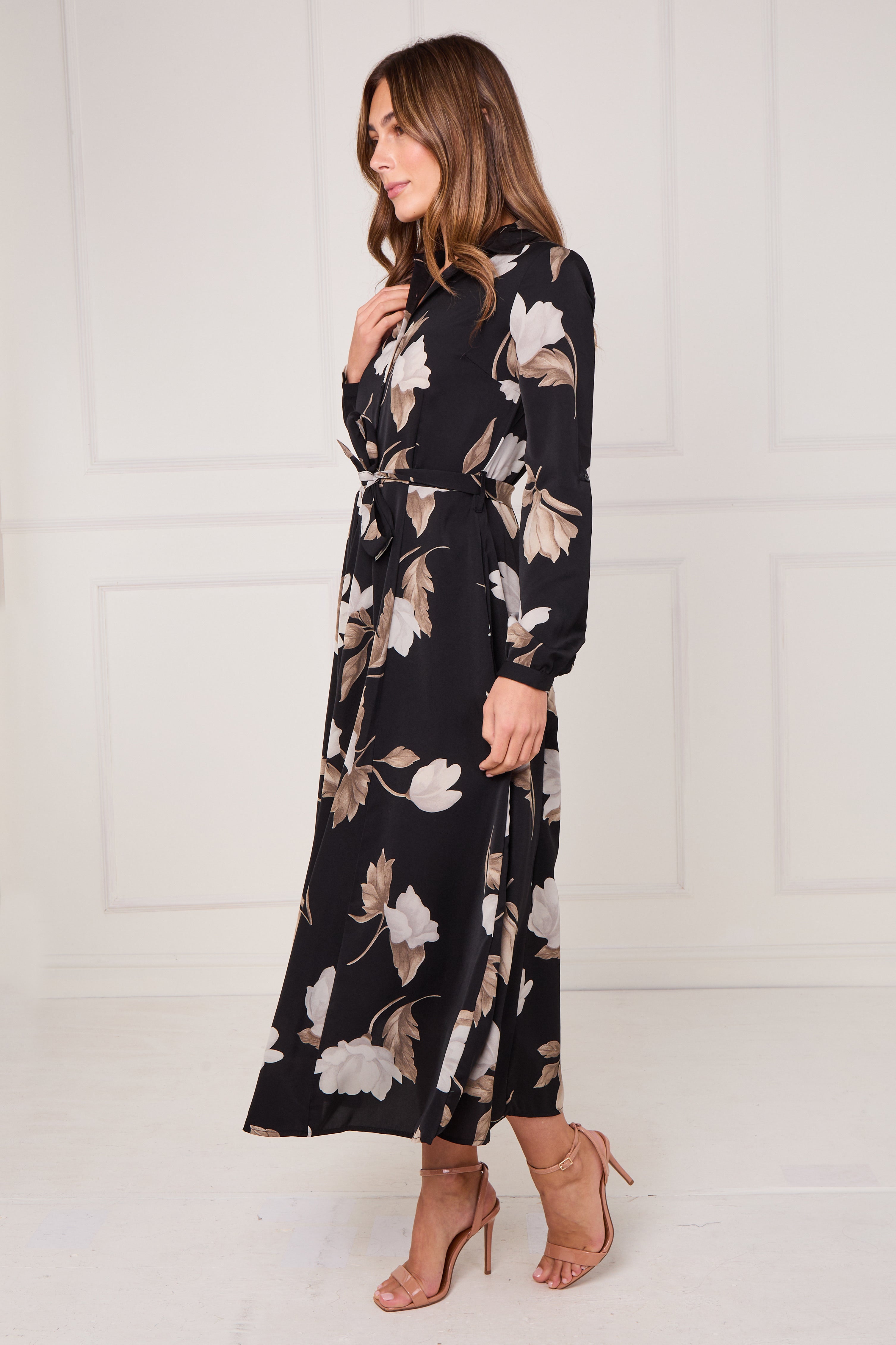 Black and Taupe Magnolia Print Maxi Shirt Dress