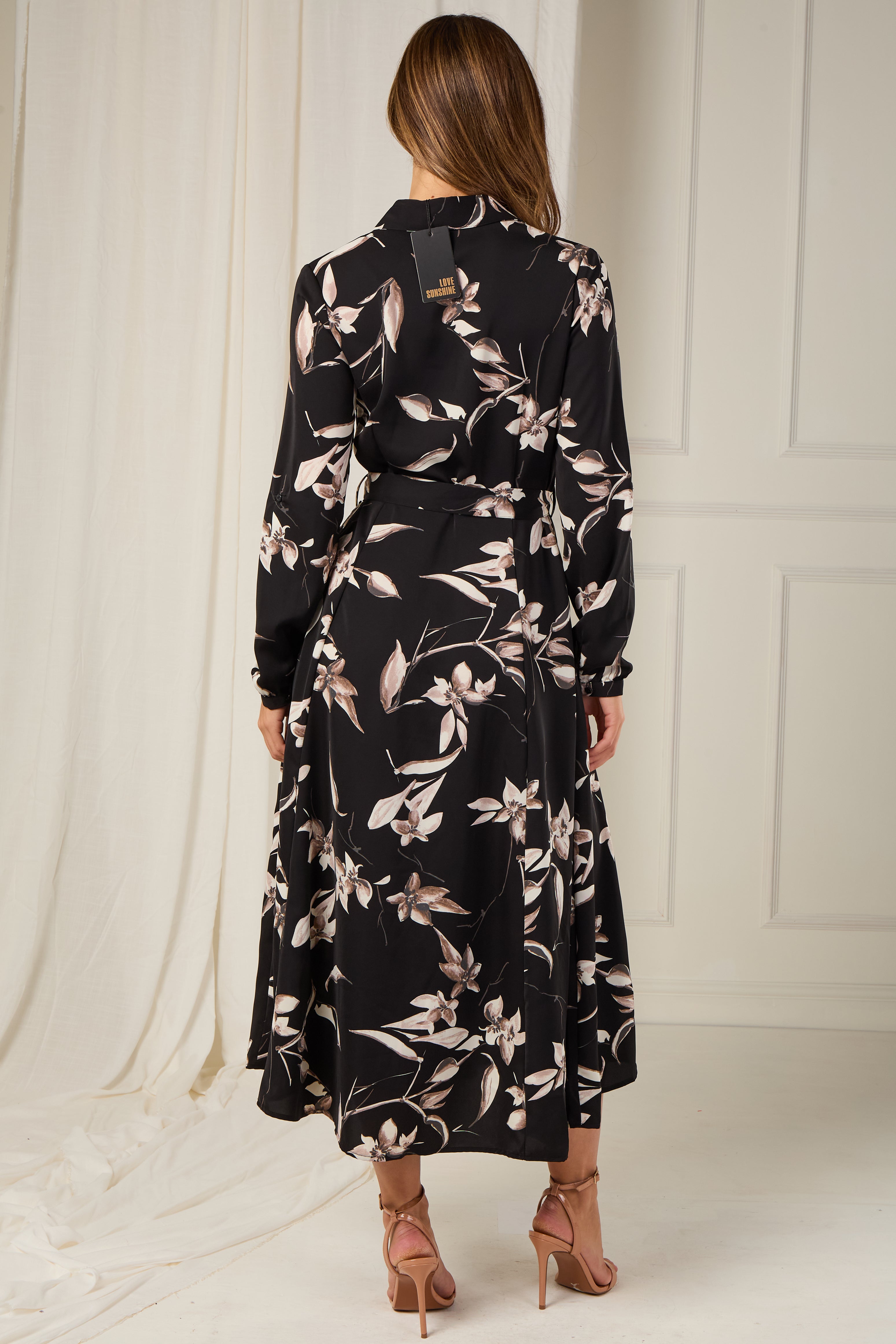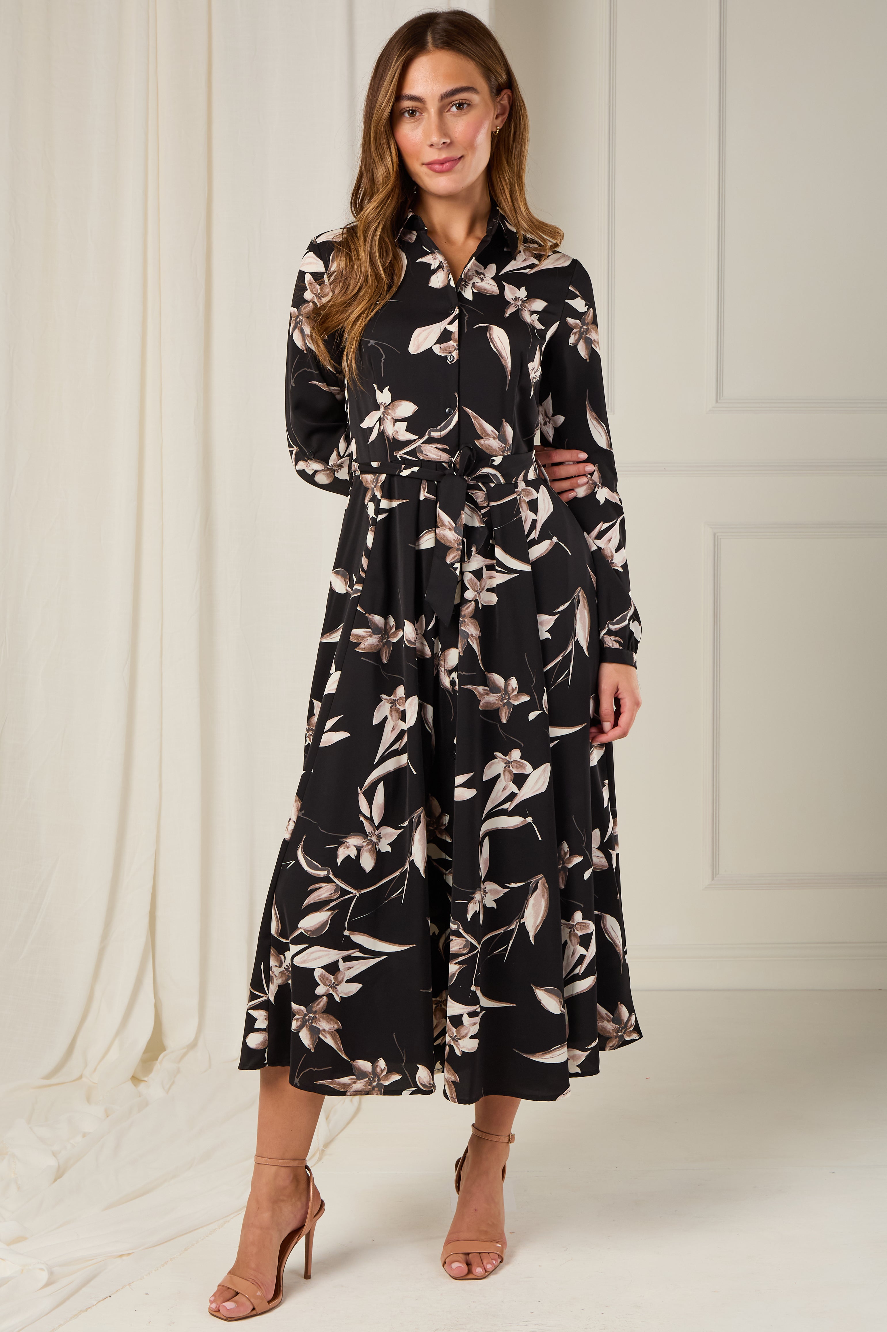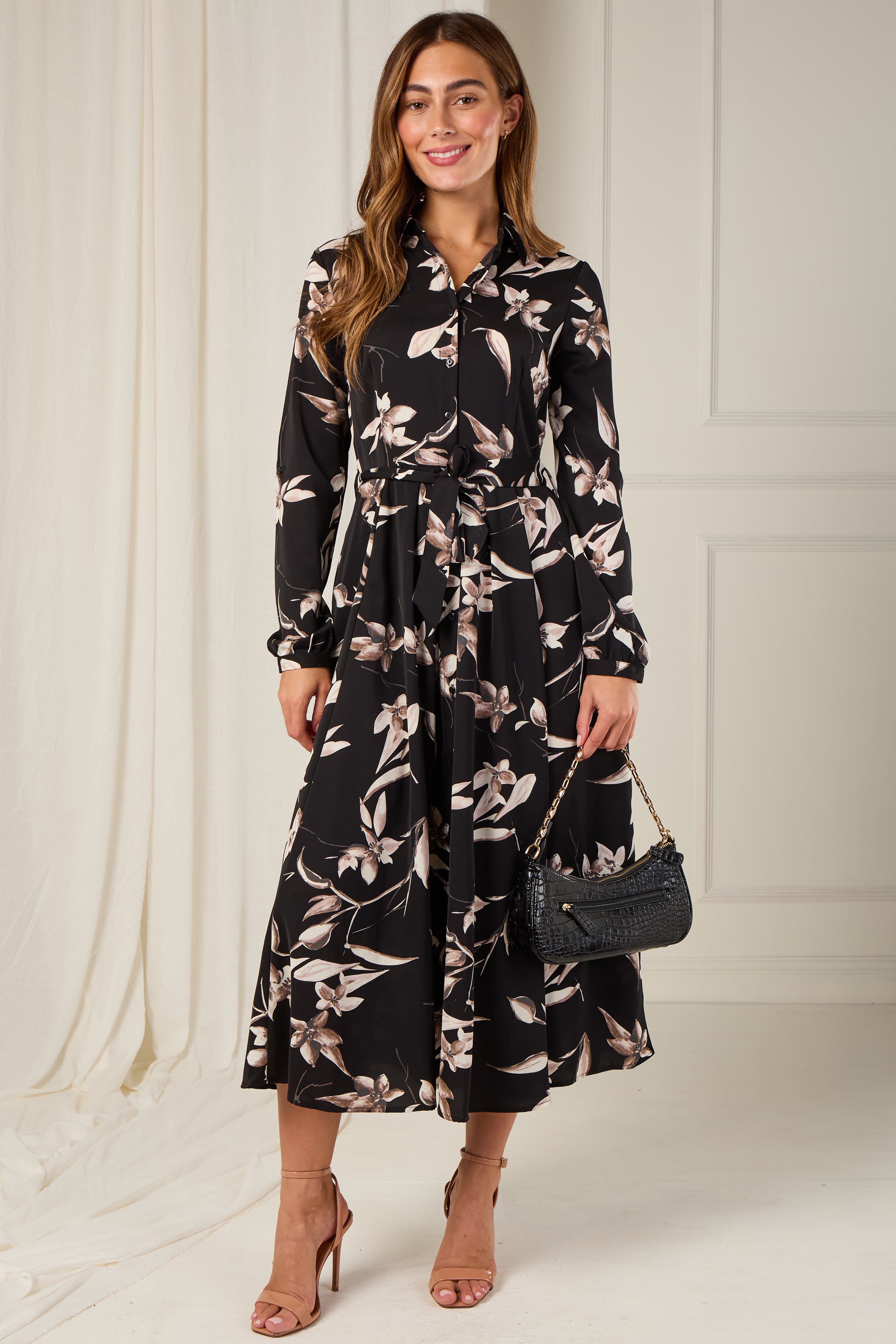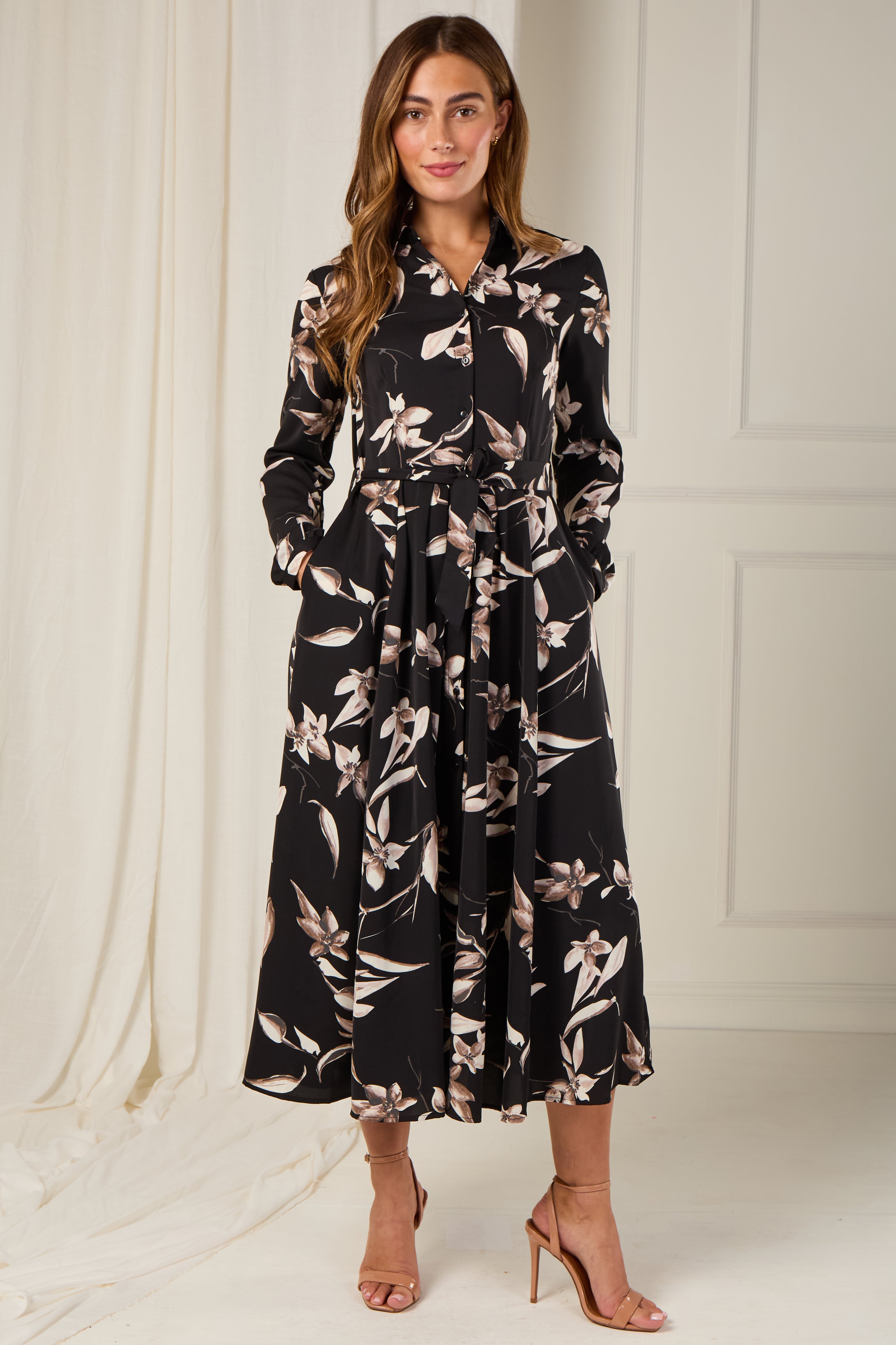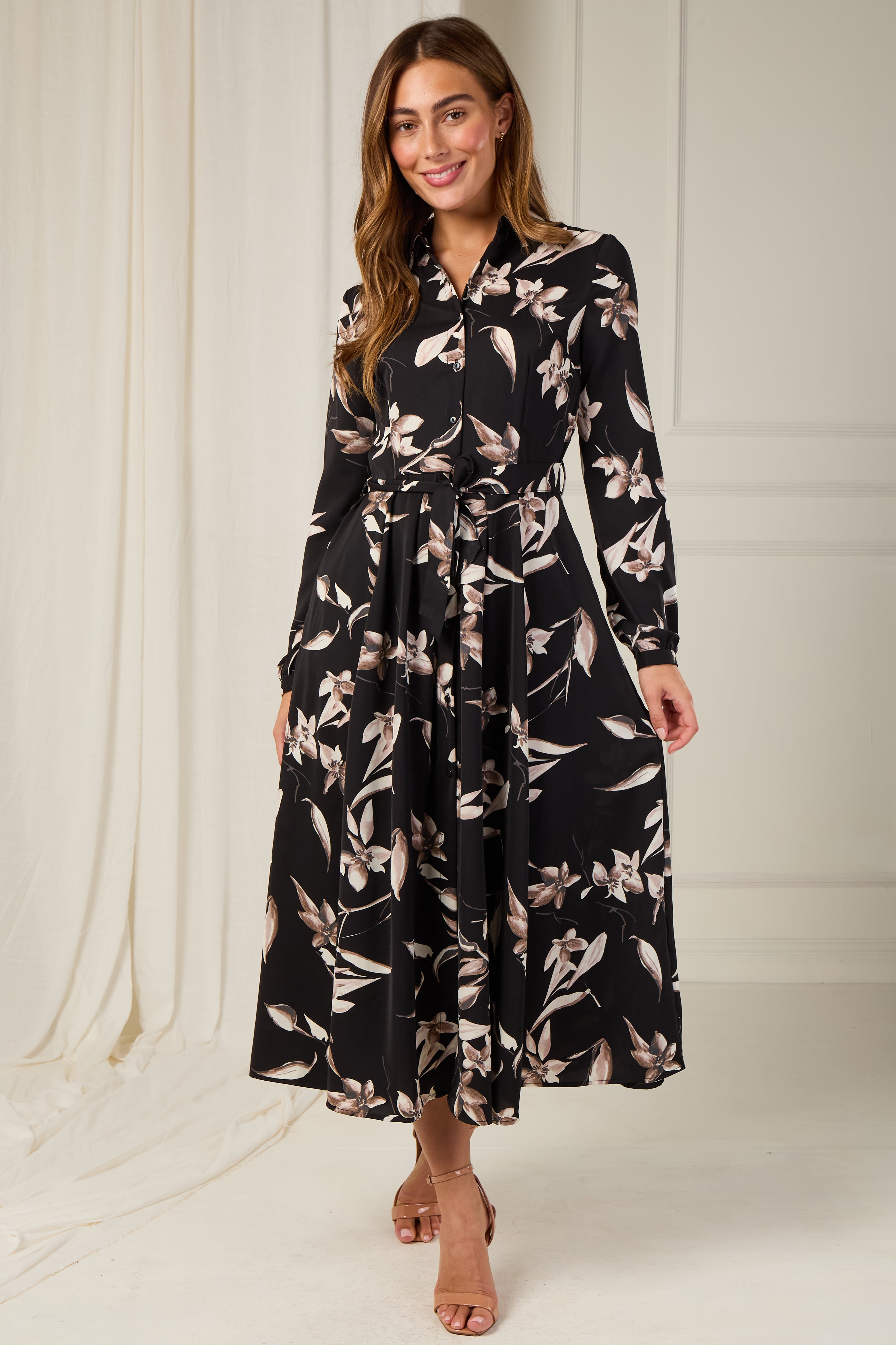 Bring effortless elegance to your wardrobe with our Black and Taupe Orchid Print Maxi Shirt Dress, a timeless piece that combines femininity with modern sophistication. Crafted from soft, flowing fabric, it features a button-through front, waist-cinching self-tie belt, and practical side pockets for a flattering yet functional fit. The delicate orchid floral print in taupe and cream tones stands out beautifully against the black base, adding a graceful touch of contrast. Perfect for workdays, brunches, or evening occasions, this versatile maxi dress transitions seamlessly from day to night. Pair with nude heels and gold accessories for a polished, refined look.