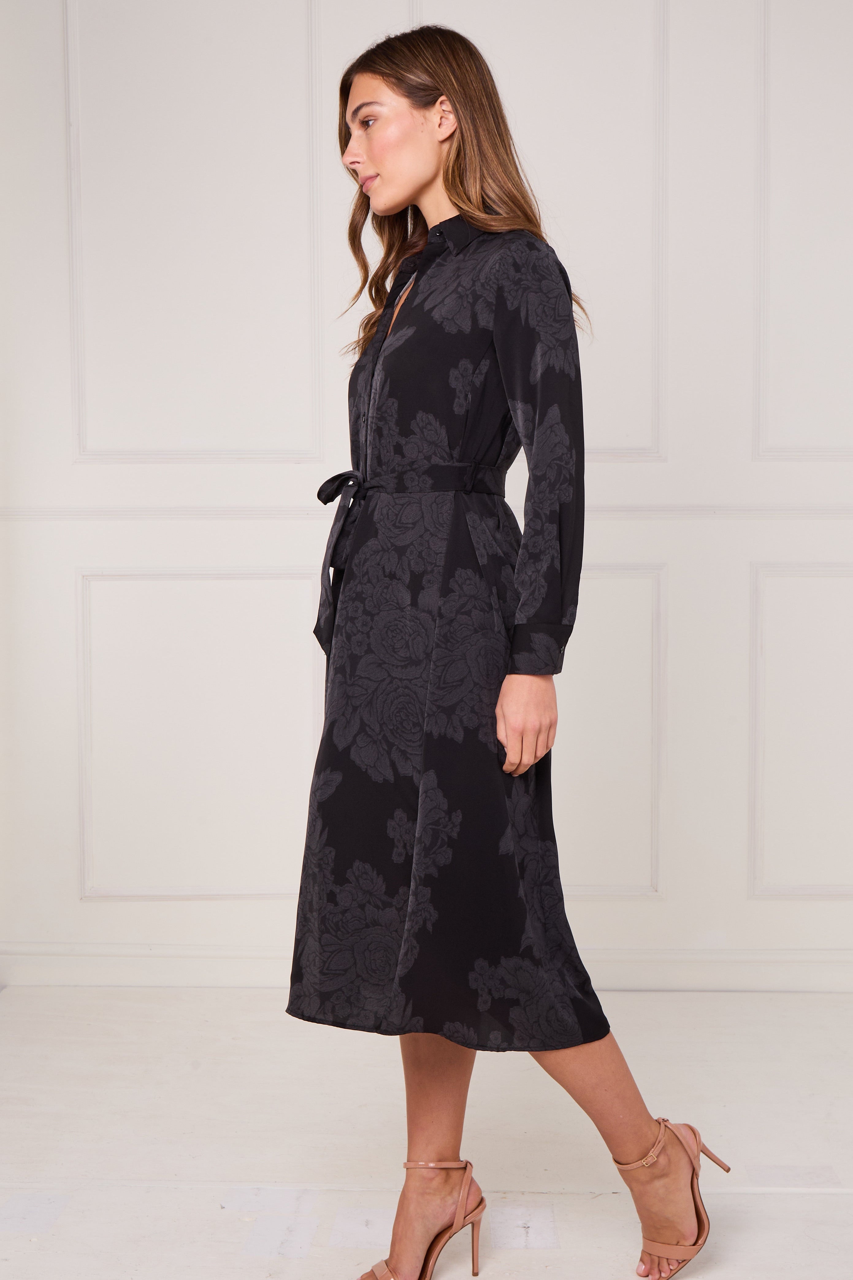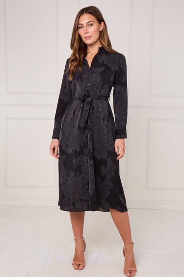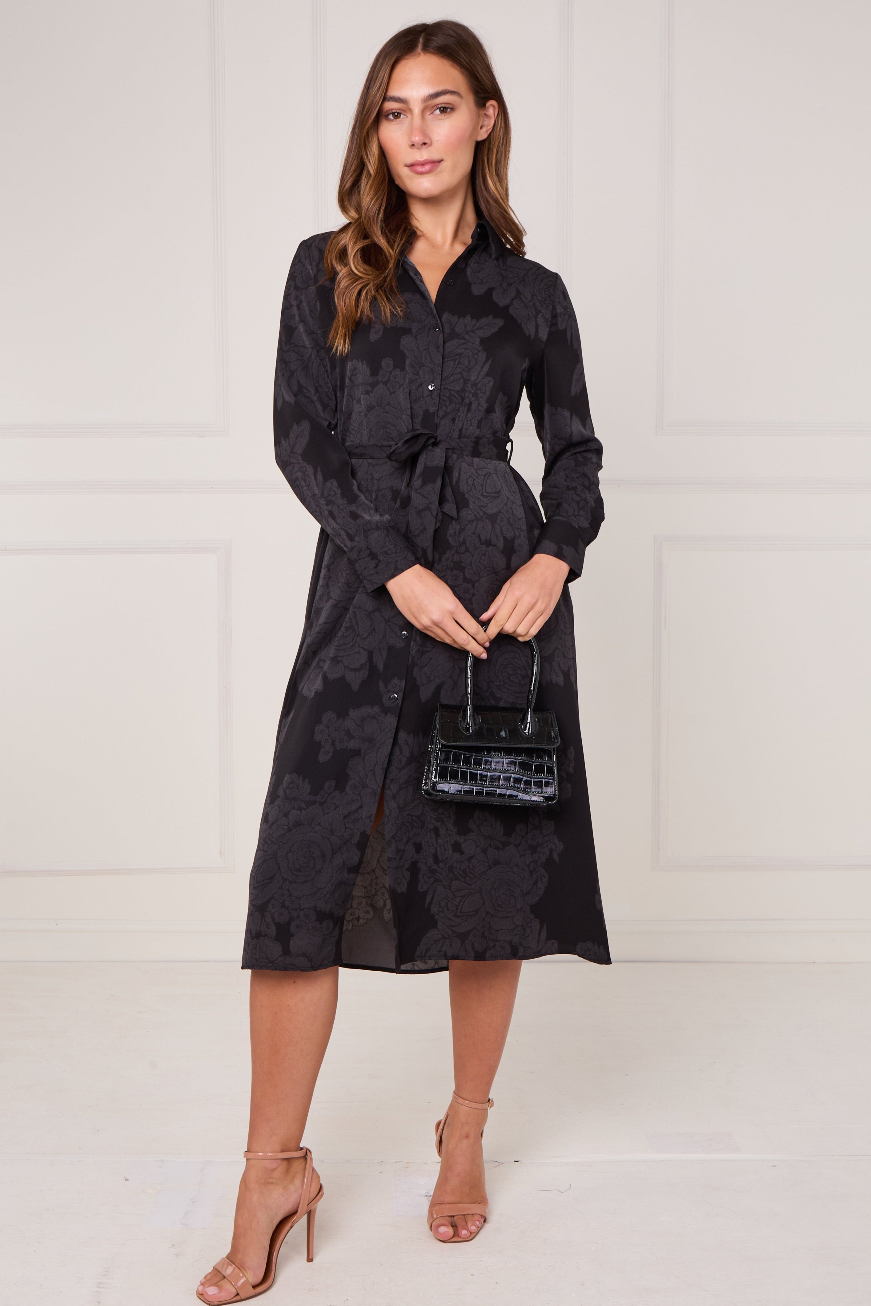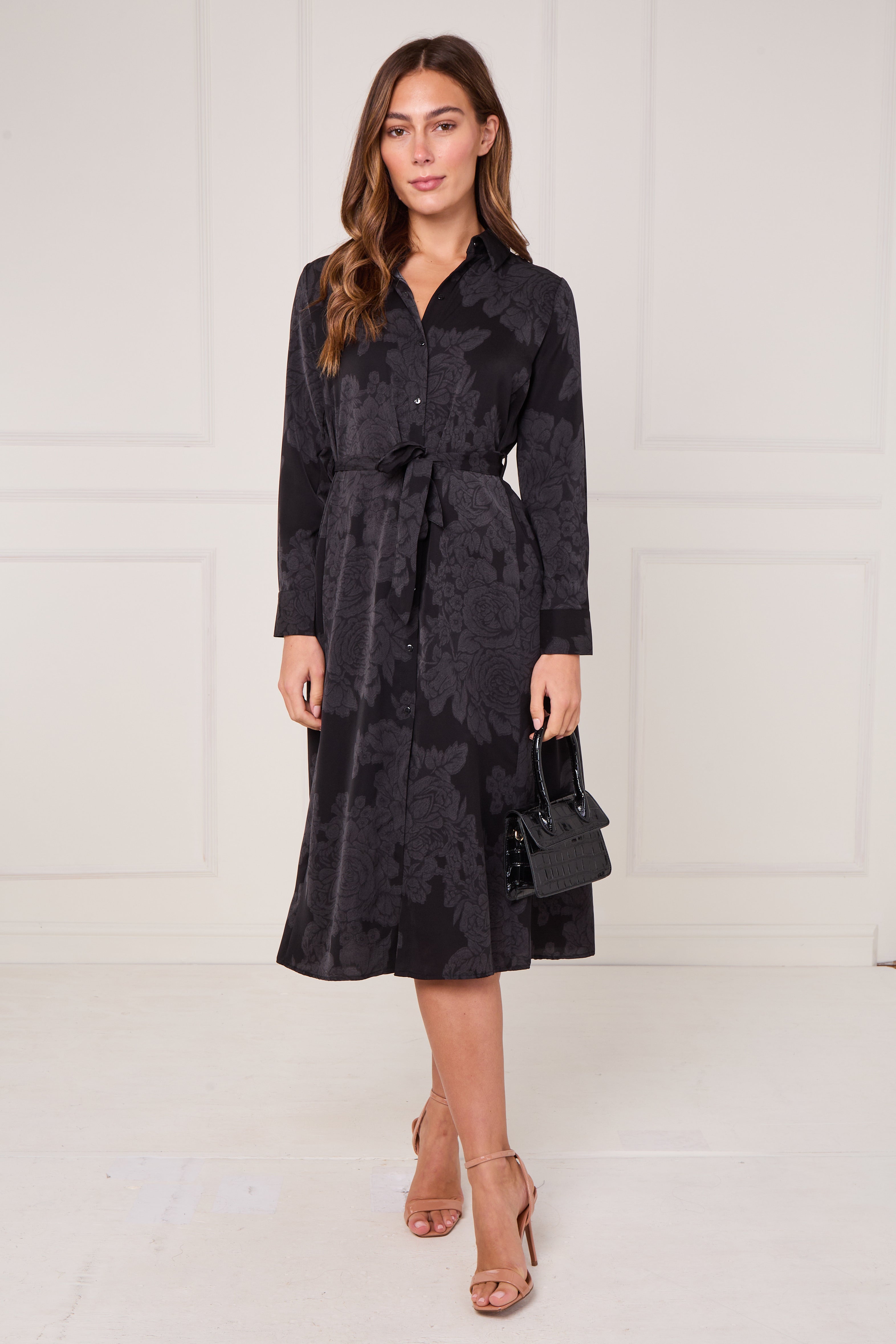Understated yet elegant, our Black Tonal Floral Print Midi Shirt Dress is a versatile piece perfect for both day and evening occasions. Crafted from soft, flowing fabric, it features a subtle all-over floral print in tonal shades of black, creating a beautifully refined look. The classic button-through front, waist-defining self-tie belt, and practical side pockets make it as functional as it is stylish. Ideal for work, dinner, or weekend outings, this midi dress offers effortless sophistication for any setting. Pair with heels and a sleek handbag for a timeless, polished finish.