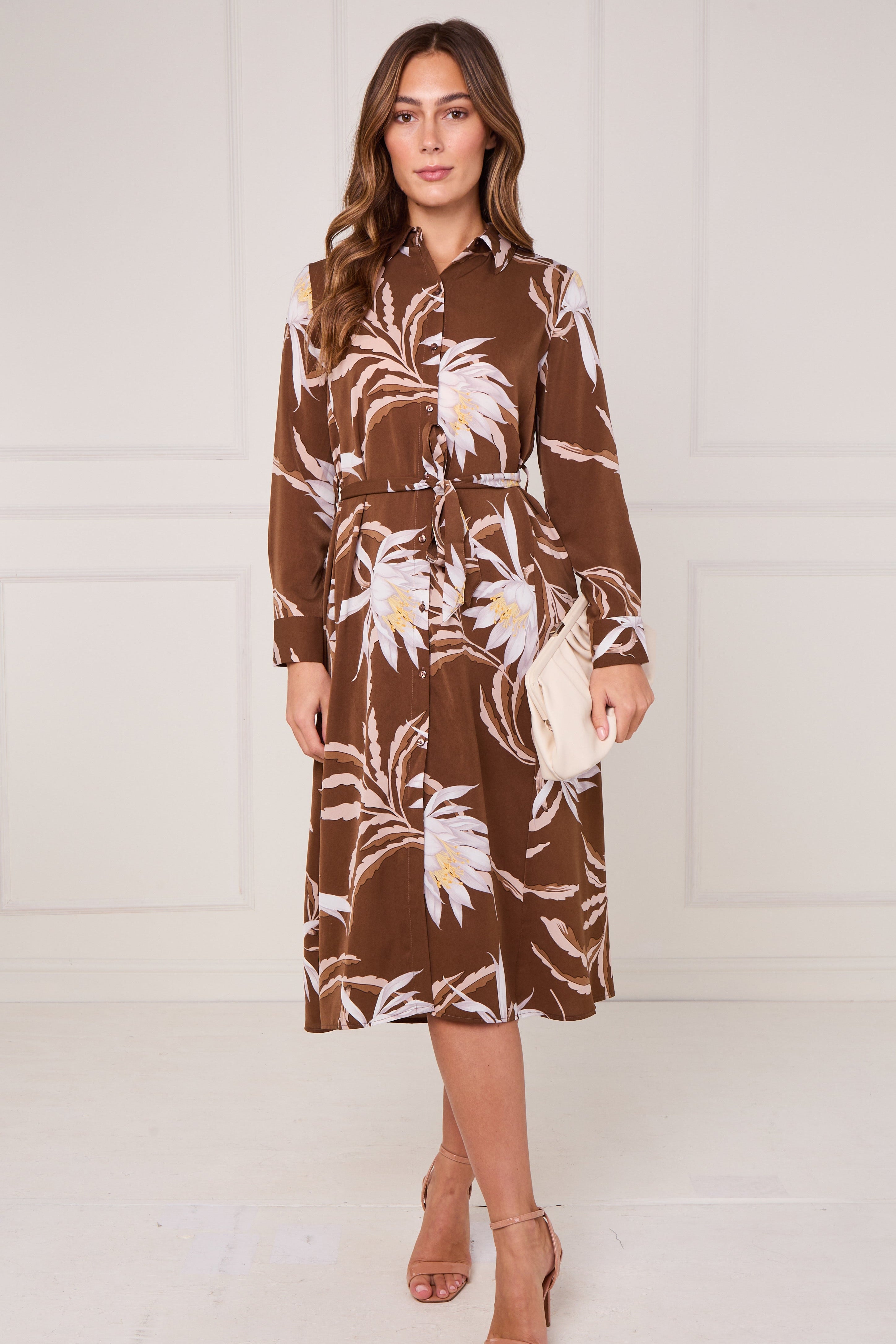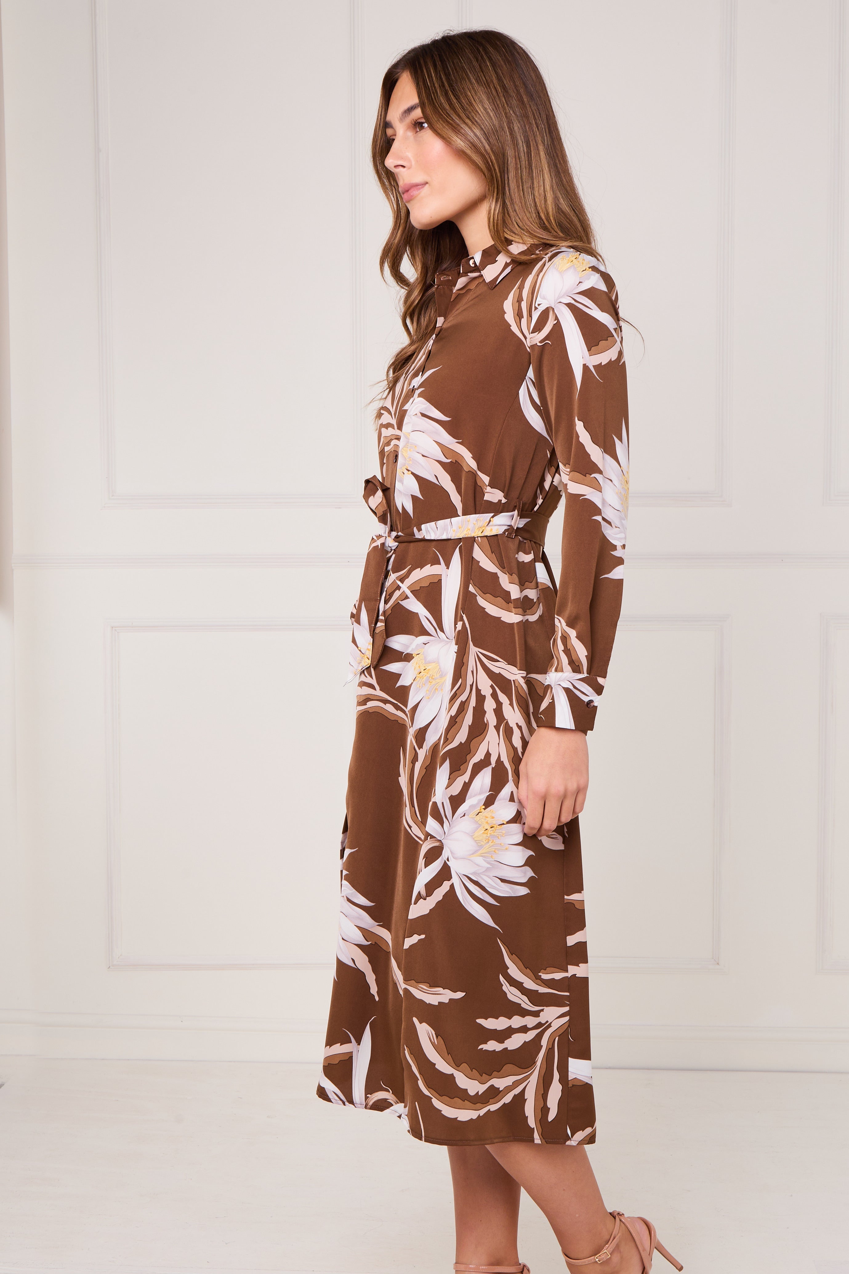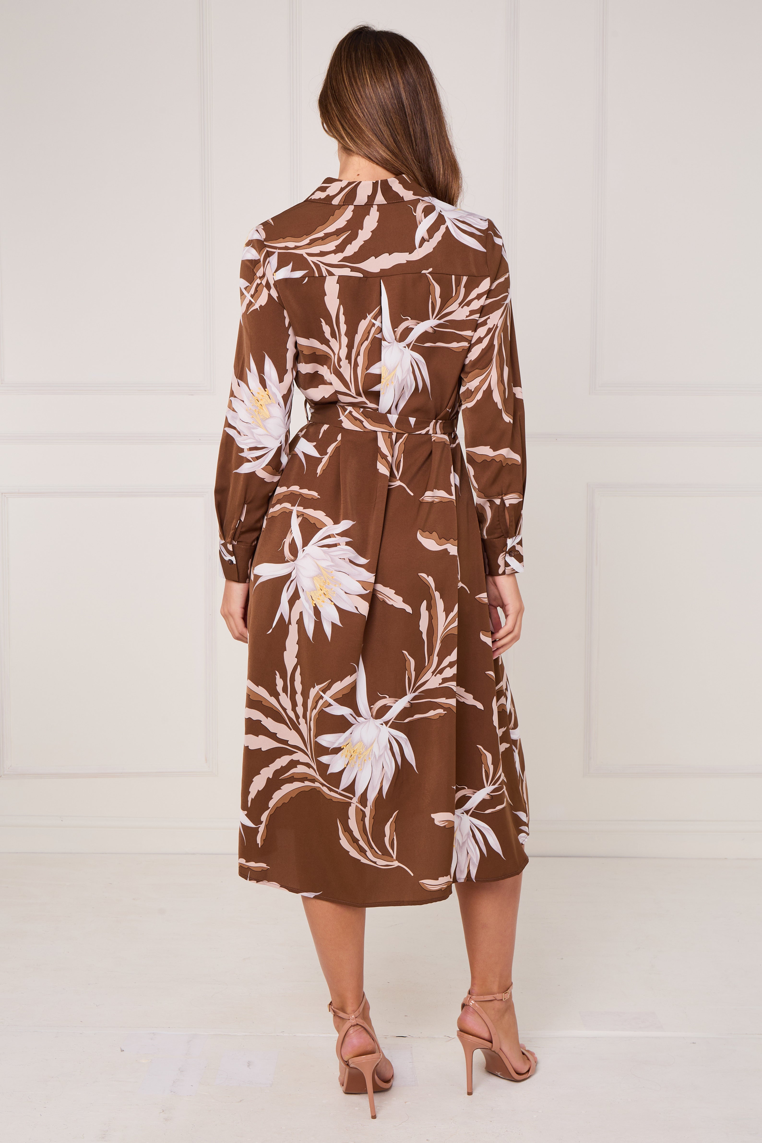 Brown and Ivory Botanical Floral Print Midi Shirt Dress