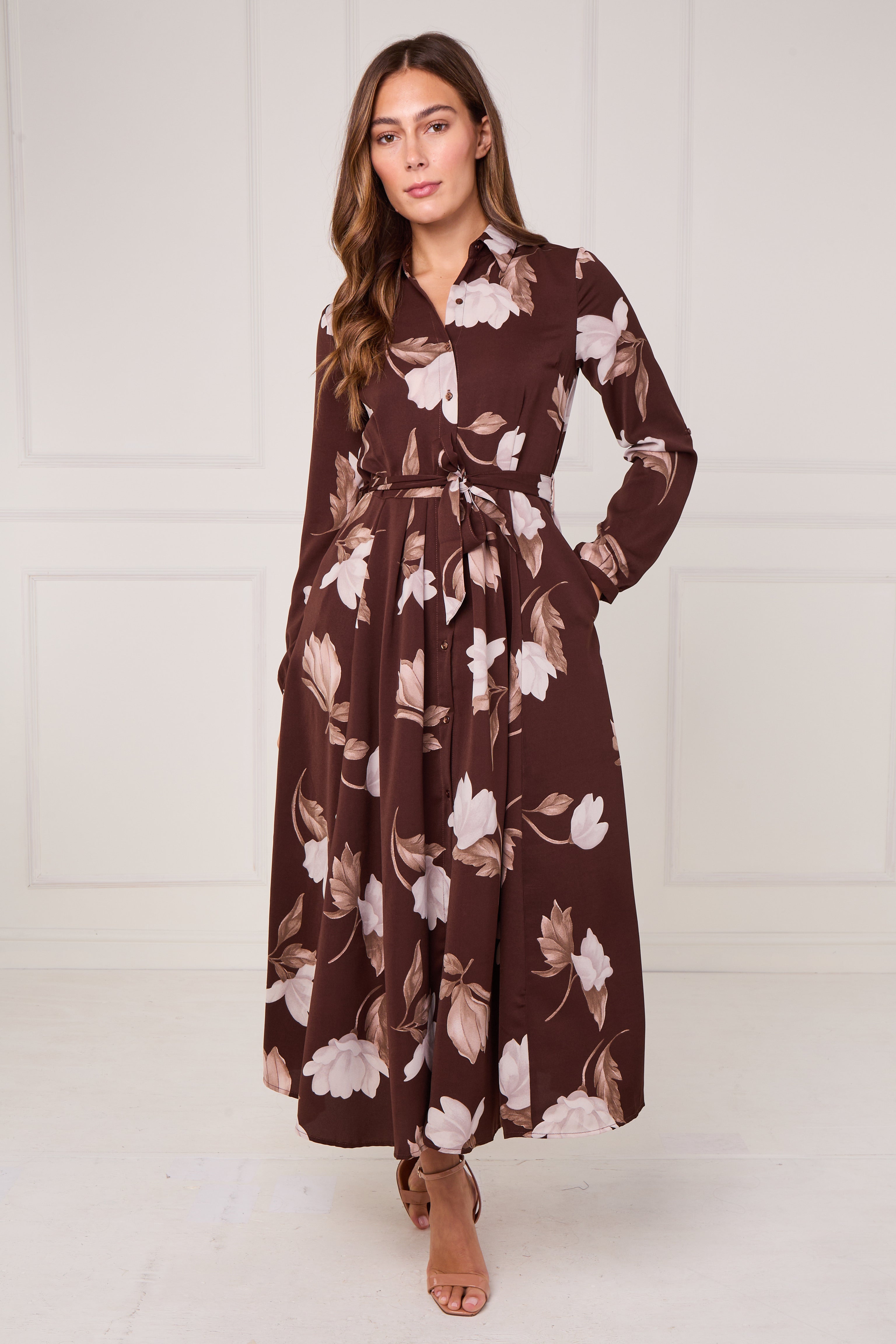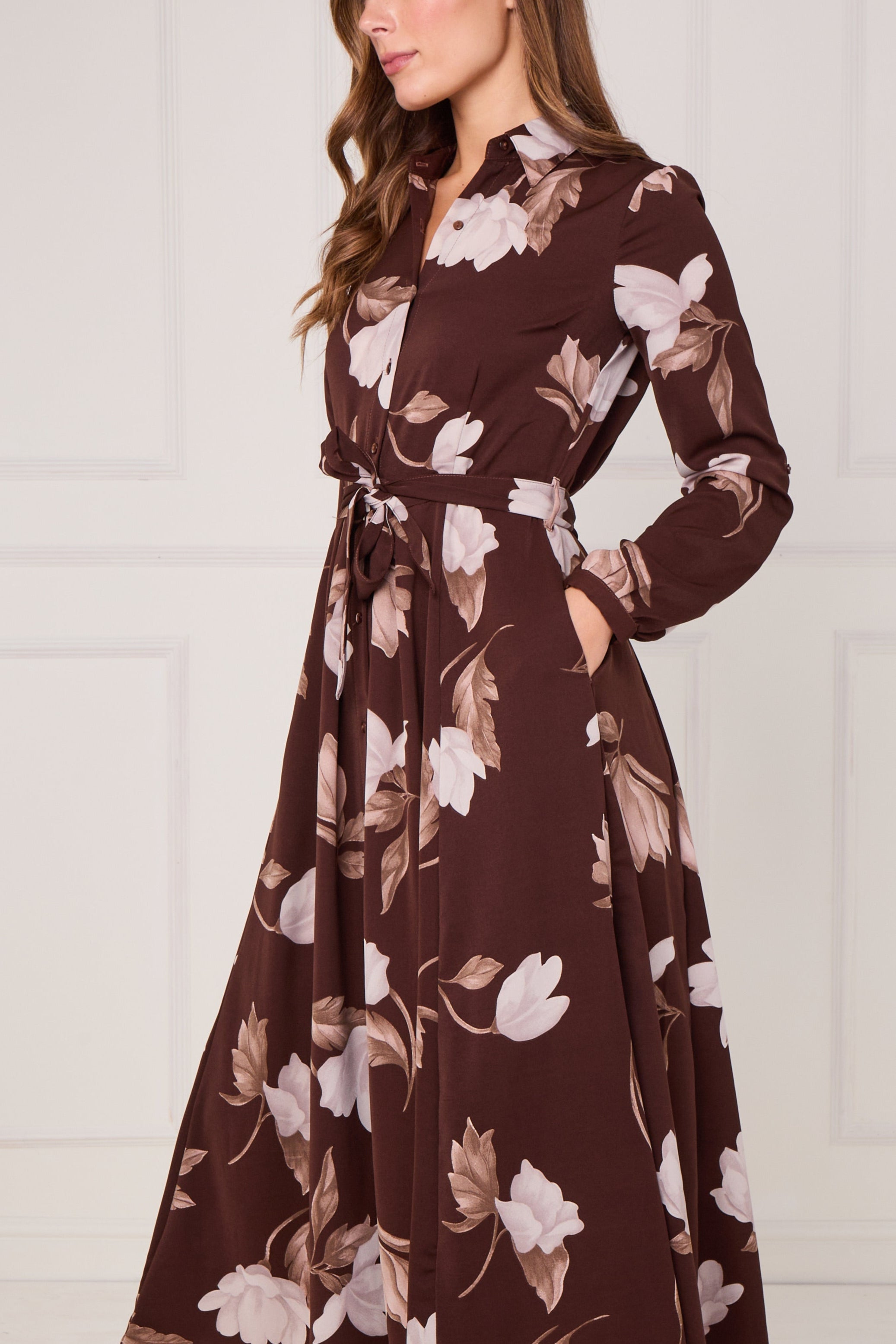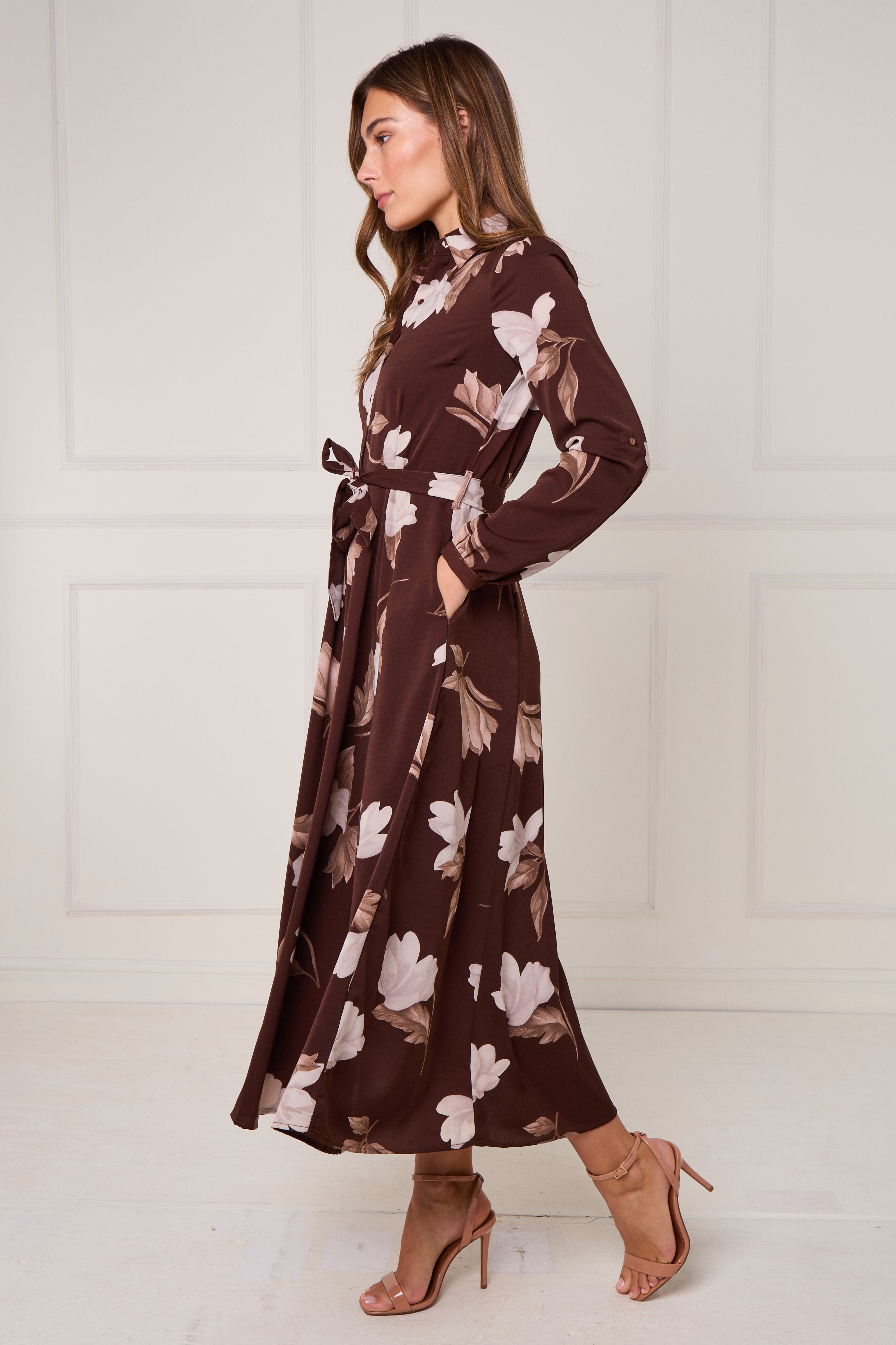 Chocolate and Cream Magnolia Print Maxi Shirt Dress