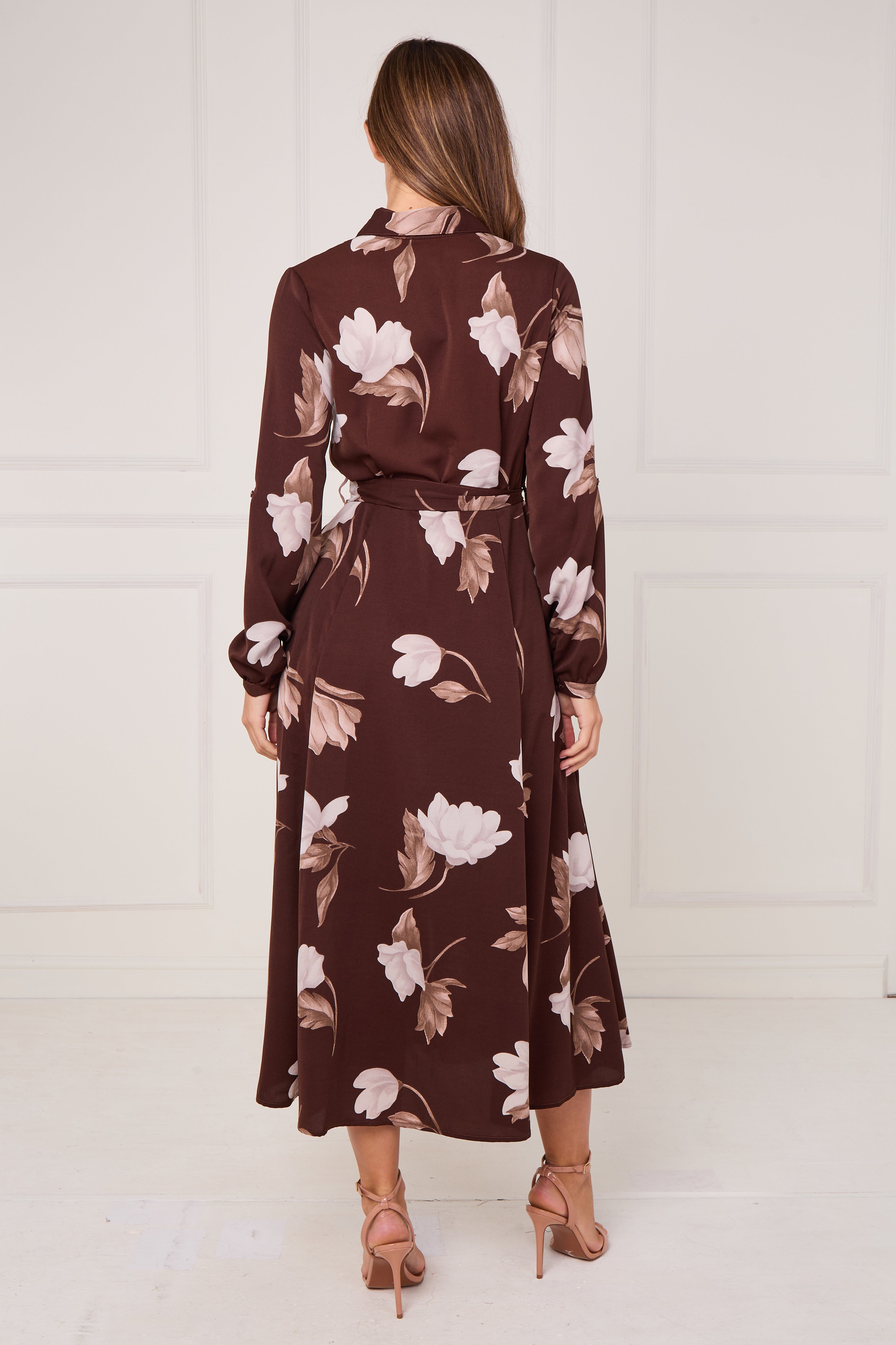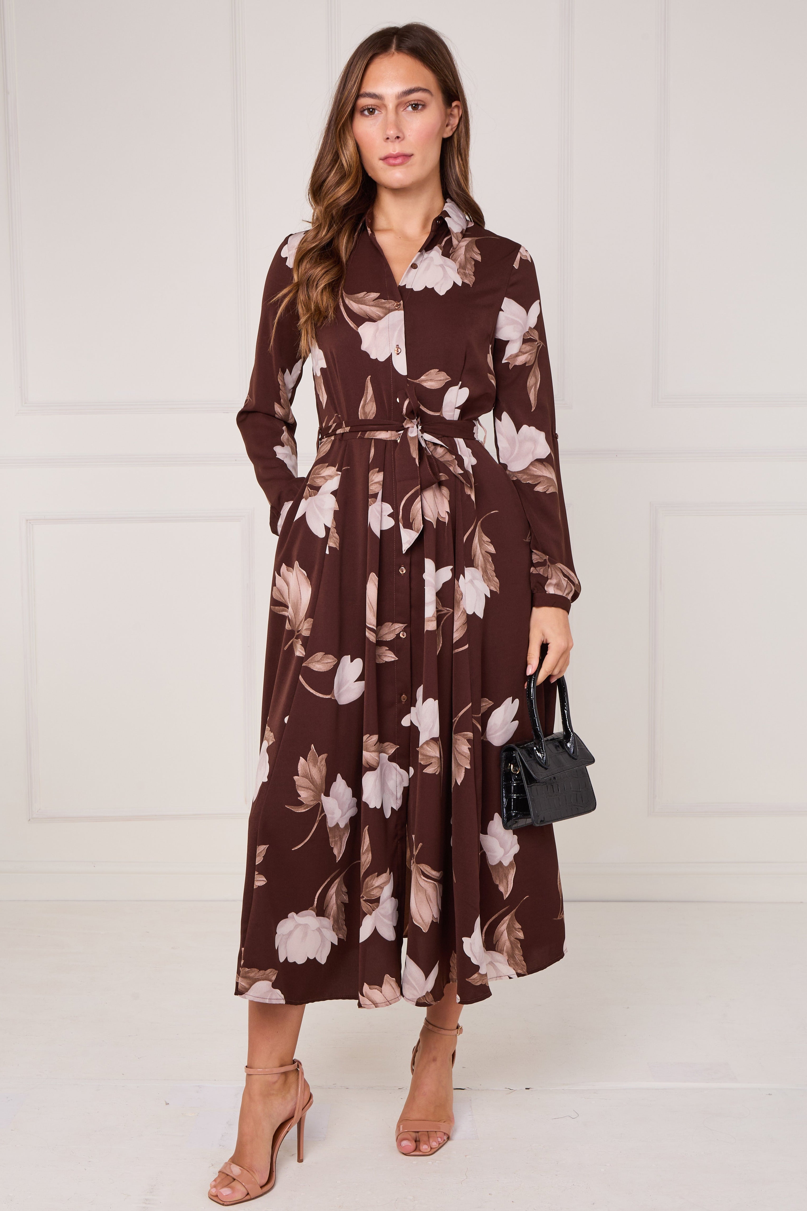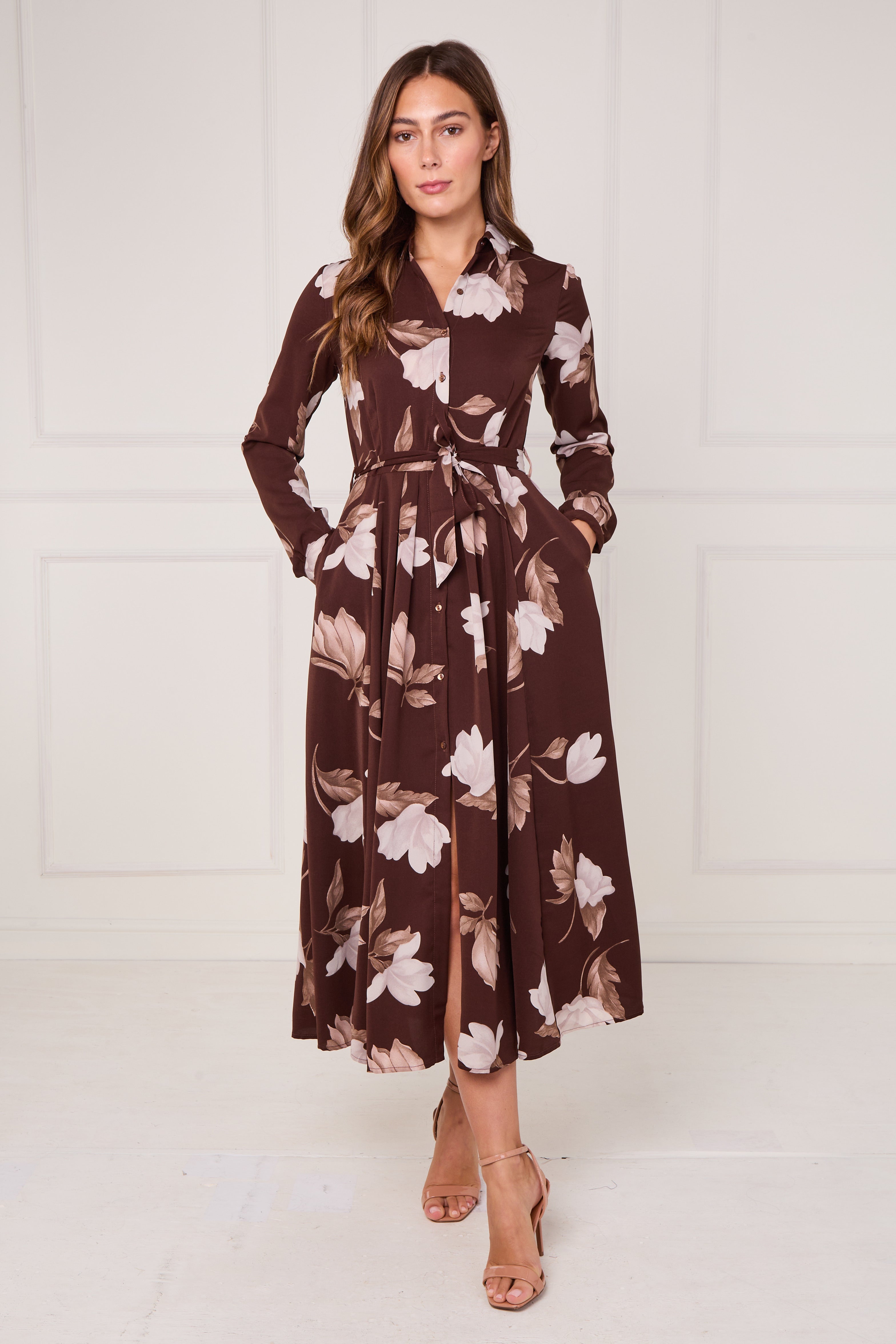 Chocolate and Cream Magnolia Print Maxi Shirt Dress