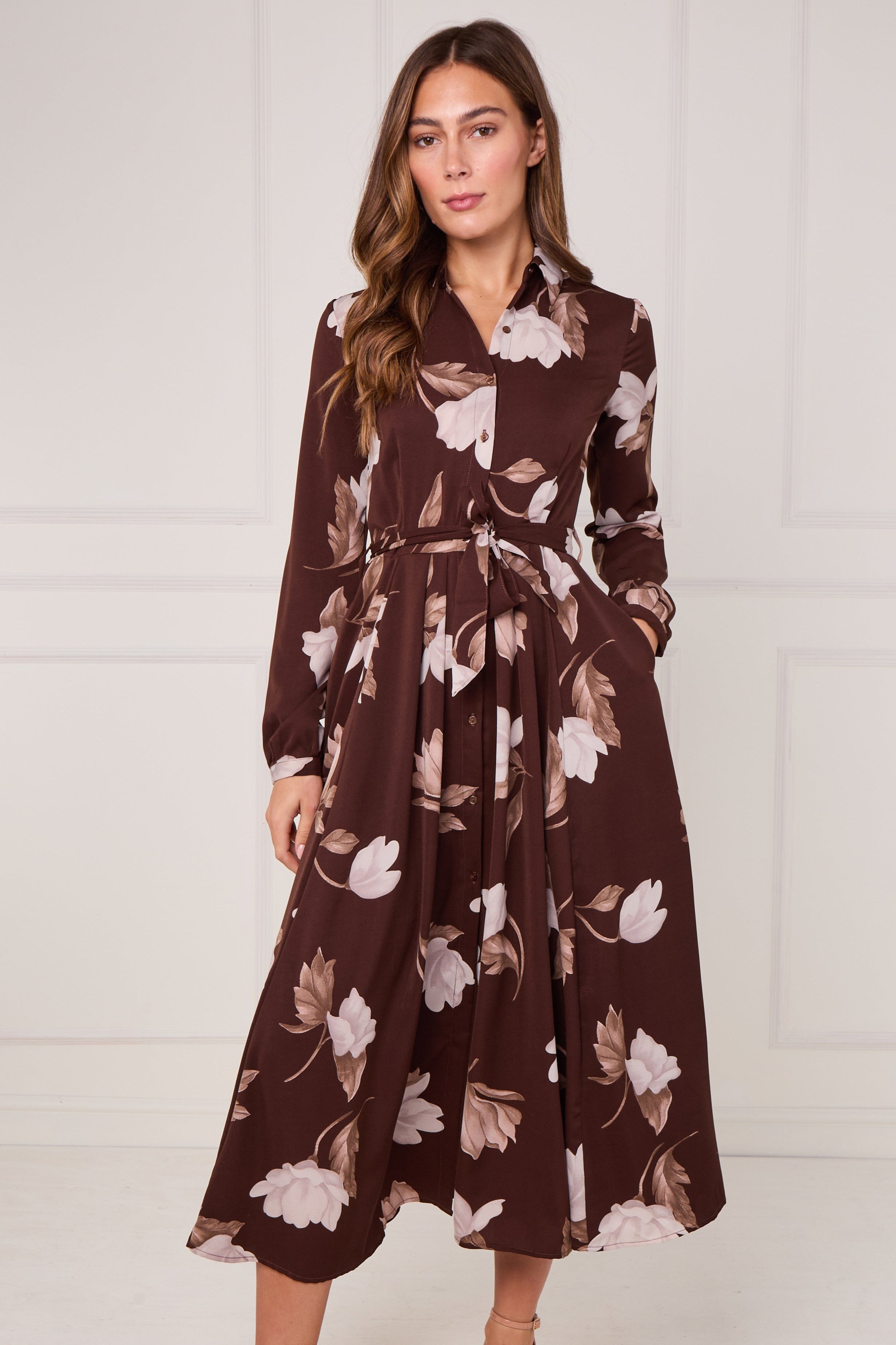 Add a touch of refined elegance to your wardrobe with our Chocolate and Cream Magnolia Print Maxi Shirt Dress, a timeless piece designed for both comfort and style. Made from soft, flowing fabric, it features a classic button-through front, flattering tie belt, and practical side pockets for a polished yet effortless look. The rich chocolate brown base is beautifully complemented by soft cream floral motifs, creating a feminine and sophisticated aesthetic. Perfect for workdays, lunches, or evening occasions, this maxi dress transitions seamlessly from day to night. Pair with neutral heels and a chic handbag for an effortlessly graceful finish.
