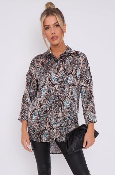 This black paisley print oversized shirt exudes an effortlessly chic vibe, perfect for adding a touch of bohemian elegance to any outfit. Made from smooth satin, the shirt features a detailed paisley pattern in subtle hues that contrast beautifully against the black background. Its layered design adds a unique texture and depth to the piece, while the oversized fit provides a comfortable, breezy feel. The shirt includes classic elements like a pointed collar and button-down front, coupled with long sleeves that enhance its laid-back luxury. Ideal for dressing up or down, this satin shirt is a versatile addition to your wardrobe, suitable for a variety of occasions.