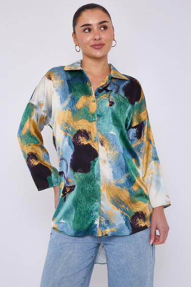 The Emerald and Mustard Watercolour Print Shirt features a bold, painterly design in vivid emerald, mustard, teal, and soft blue tones. Crafted from smooth satin fabric, this oversized shirt has a relaxed fit, classic collar, and dipped hem for effortless drape. The abstract print brings an artistic edge, making it a standout piece for any wardrobe. Style with denim for a casual look or dress it up with tailored trousers for creative workdays or evening plans.