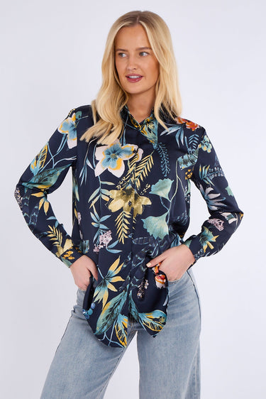 A timeless piece with a luxe feel. Crafted from bubble satin, this shirt features a sophisticated floral print in deep navy tones. The classic button-down design and soft, flowing fabric offer both comfort and elegance. Perfect for work, evening outings, or a polished everyday look—pair with tailored trousers or denim for versatile styling.