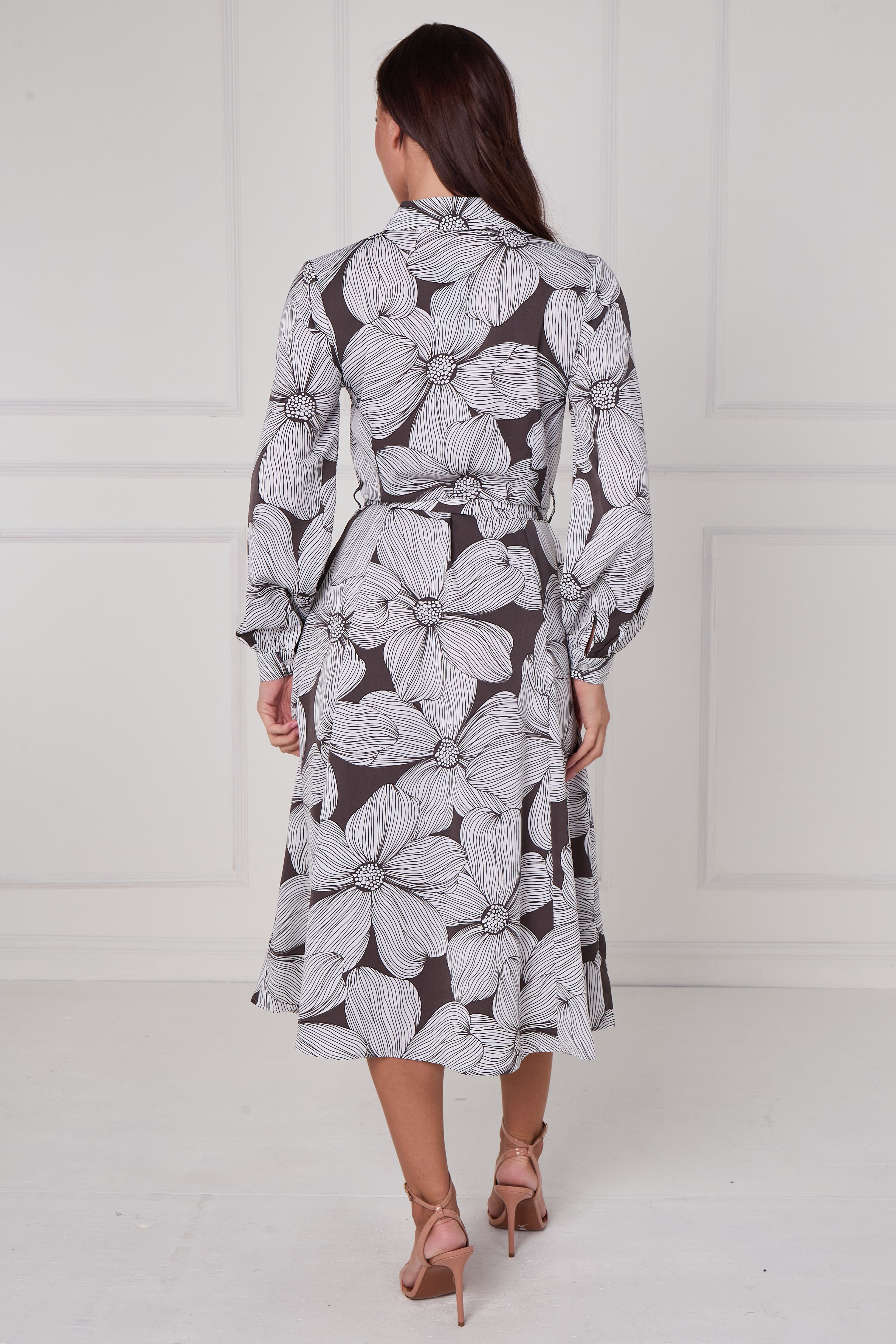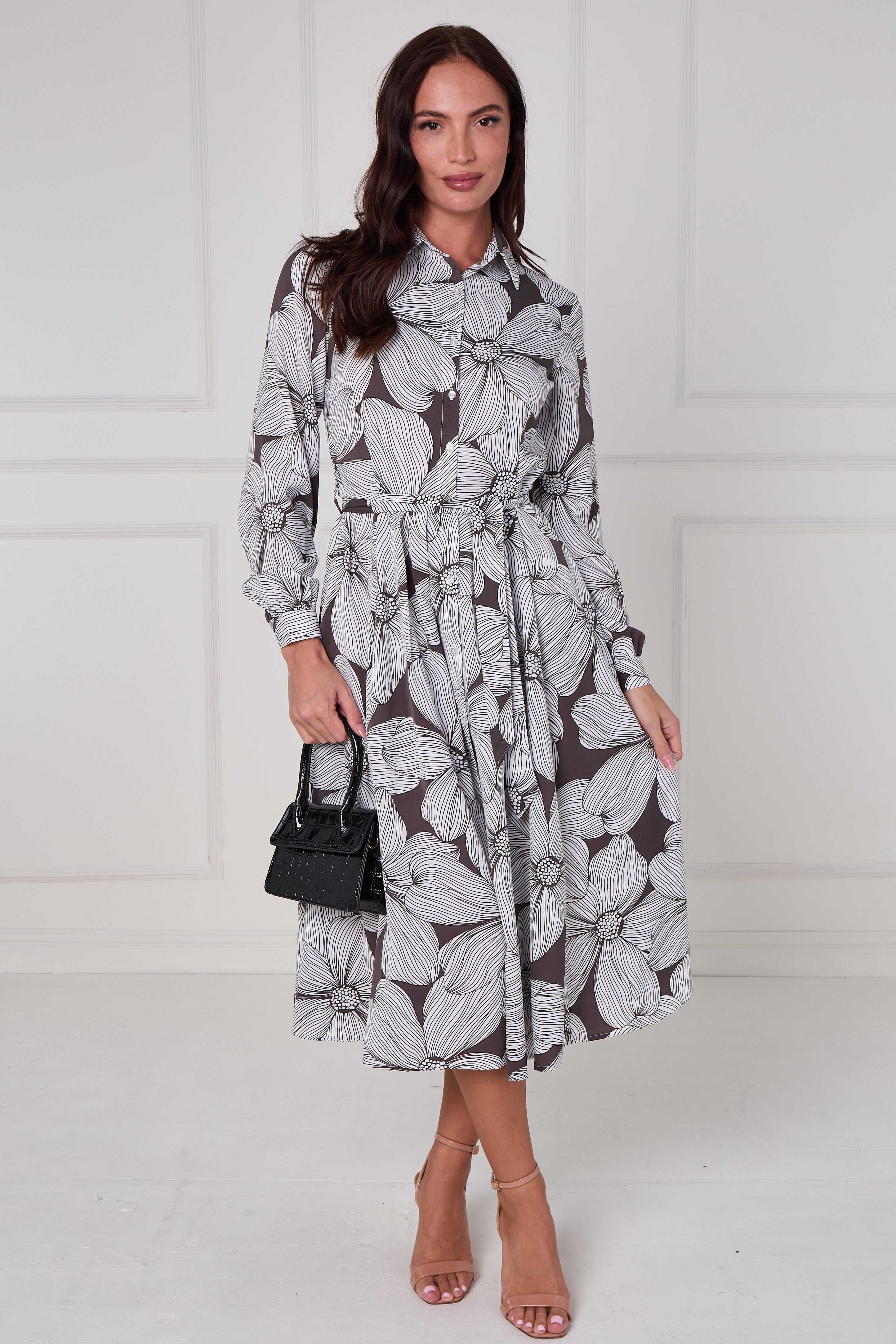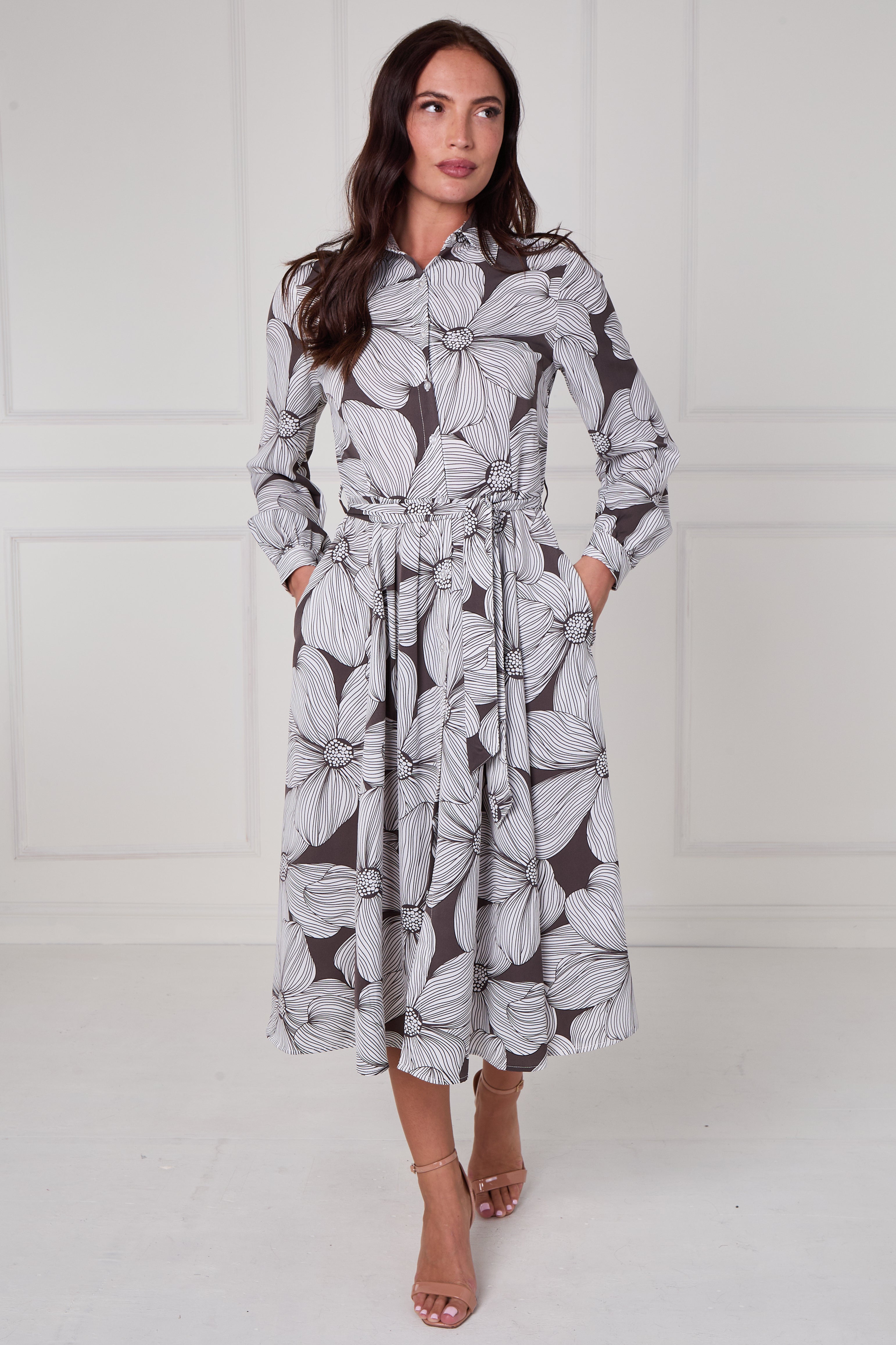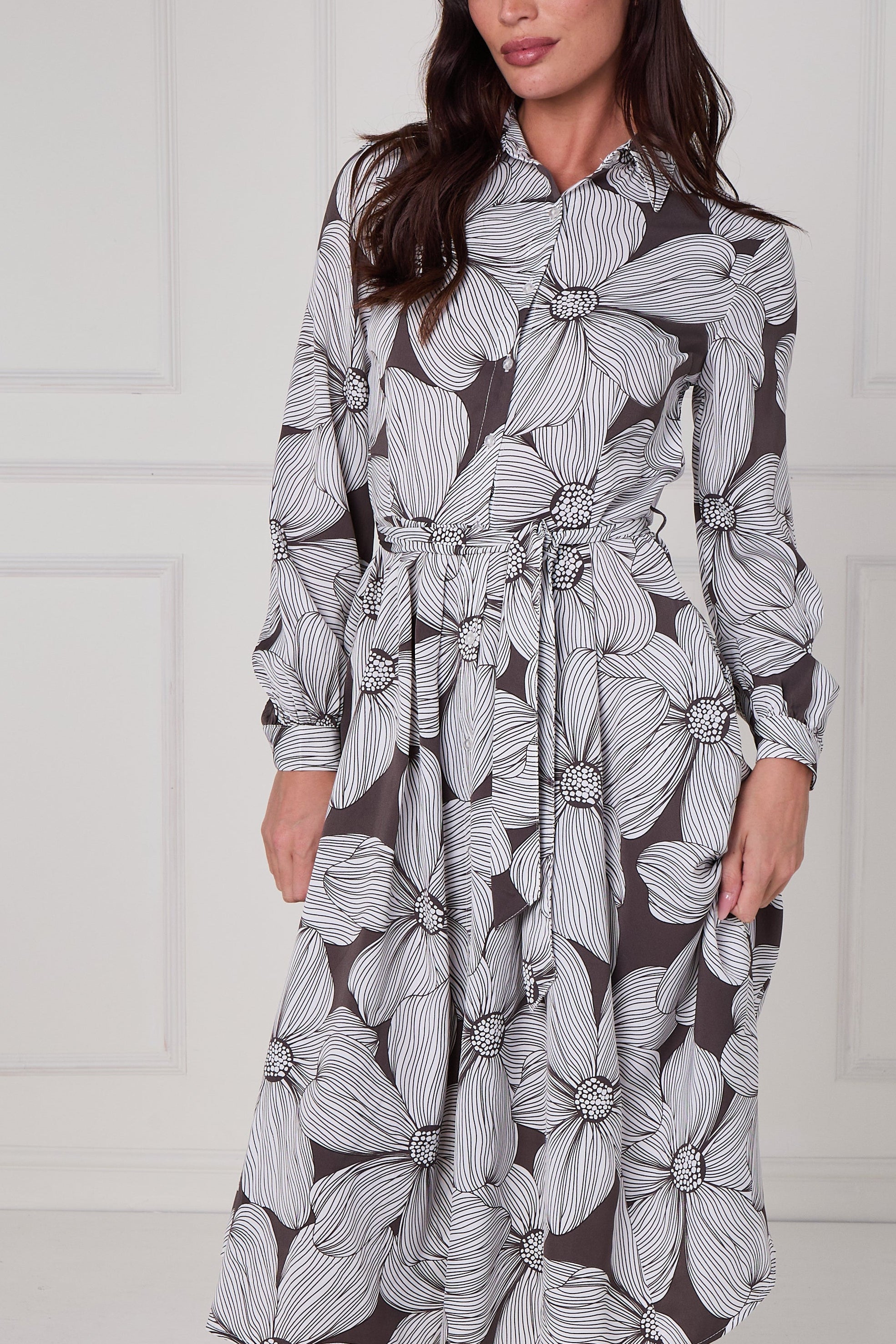 A standout yet easy-to-wear midi shirt dress featuring an oversized floral line print in soft taupe and ivory tones. The silhouette flows beautifully with a relaxed drape, balanced by a detachable belt to shape the waist as desired. Designed with a classic shirt collar, button-through front, long sleeves and discreet side pockets for everyday comfort. Elegant, artistic and effortlessly striking — perfect for work, brunch or any occasion that calls for effortless impact.