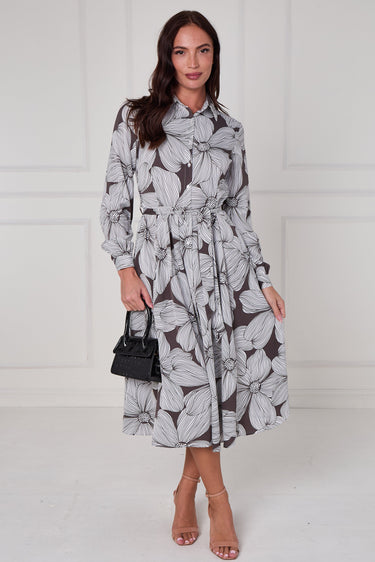 Taupe Oversized Floral Line Print Midi Shirt Dress