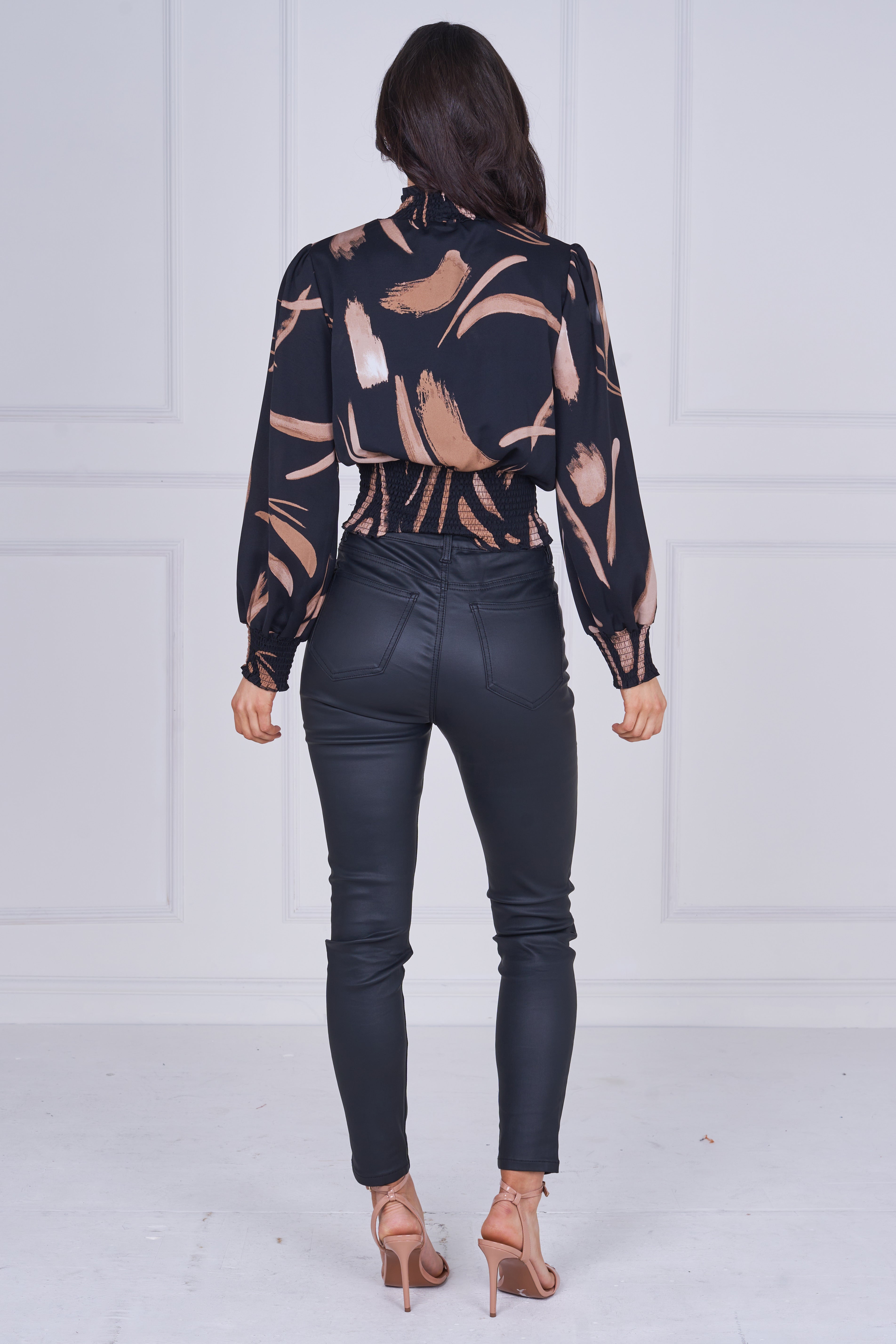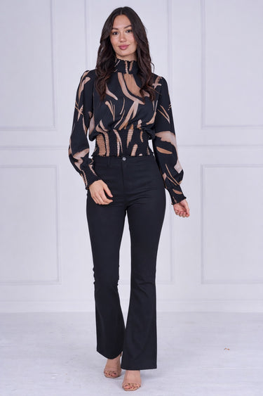 This Black Brushstroke Smocked High Neck Blouse features an abstract brushstroke print in warm neutral tones set against a black base for a bold yet refined look. Designed with a smocked high neckline, long sleeves, and smocked cuffs, it offers an elegant, feminine silhouette. The elasticated smocked waist enhances the shape while providing comfortable all-day wear. Lightweight and fluid, this blouse pairs effortlessly with trousers, skirts, or denim, making it a versatile choice for workwear, evening styling, or polished everyday looks.