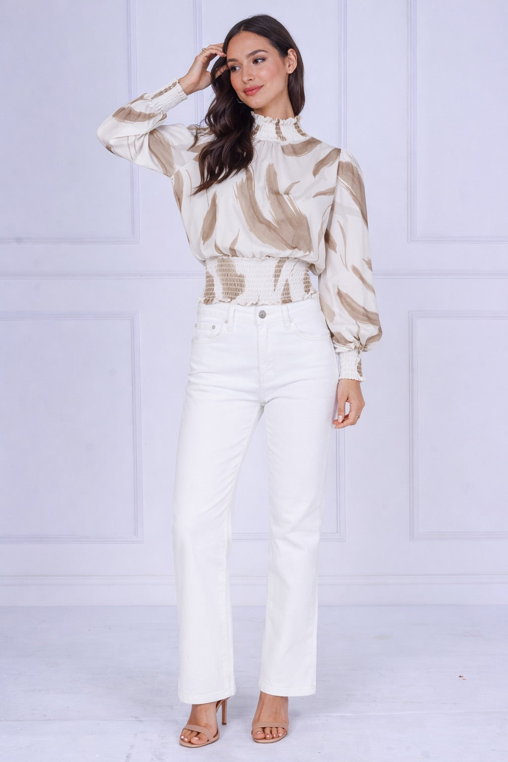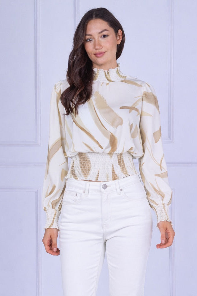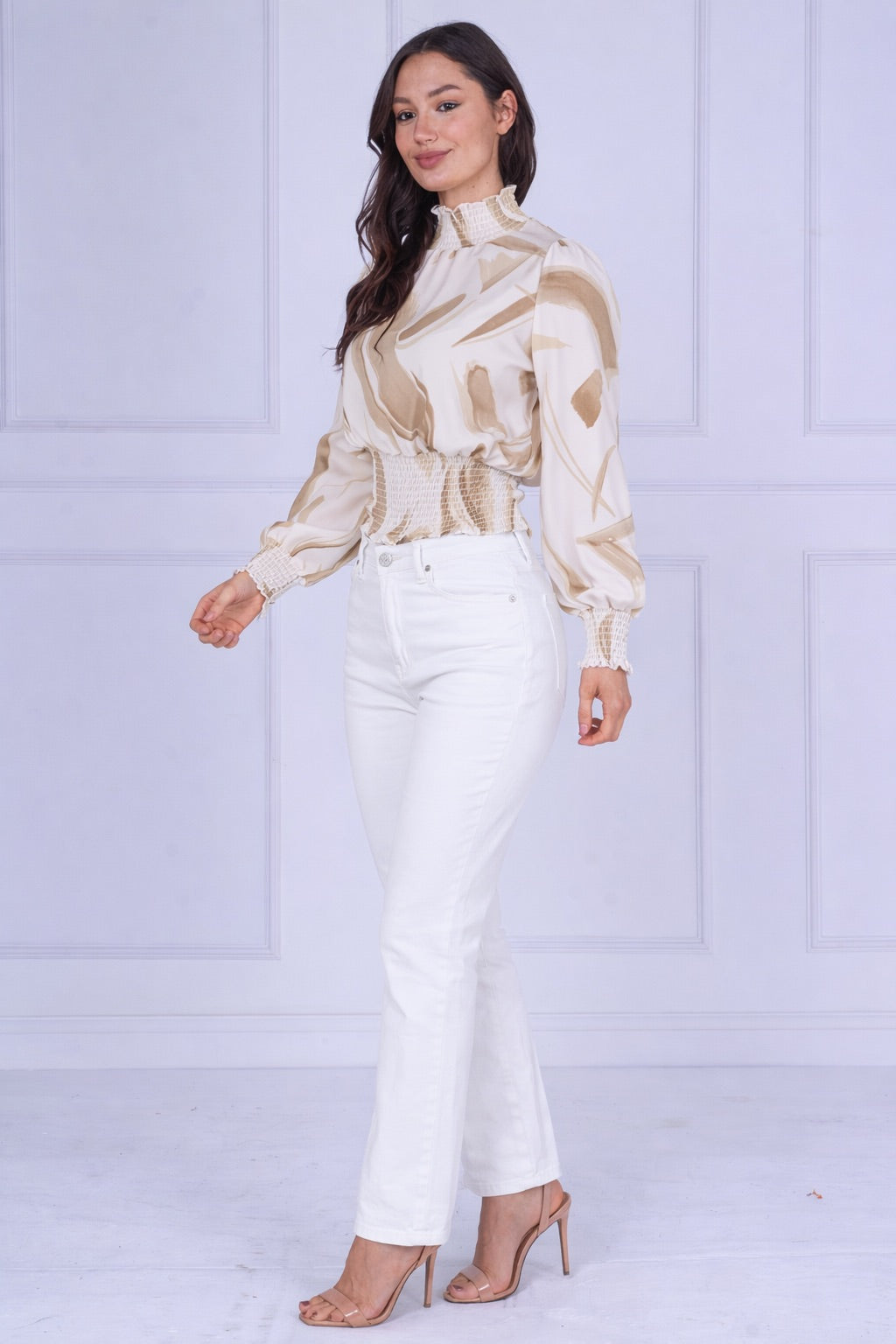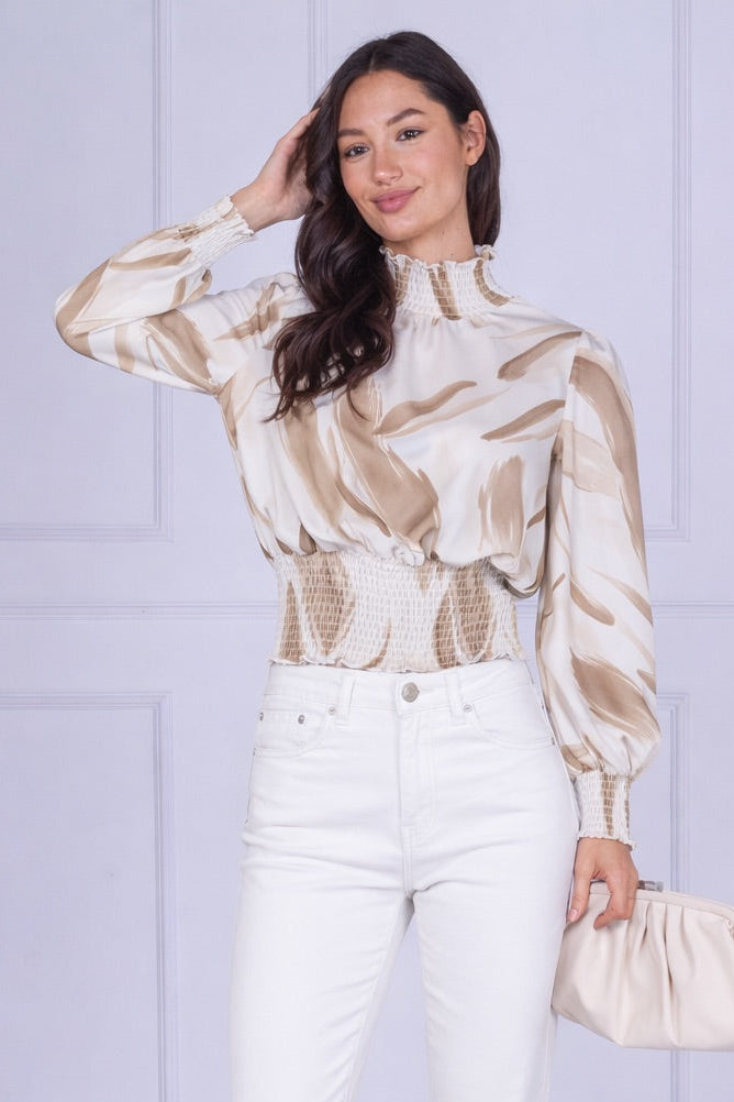 This Sand Brushstroke Smocked Blouse features a soft abstract brushstroke print in warm sand and neutral tones, designed with a refined smocked high neckline, long sleeves, and smocked cuffs for an elegant finish. The elasticated smocked waist creates a flattering silhouette while offering comfortable wear throughout the day. Lightweight and fluid, this blouse is easy to style with trousers, skirts, or denim, making it a versatile choice for spring styling, workwear, or polished everyday looks.