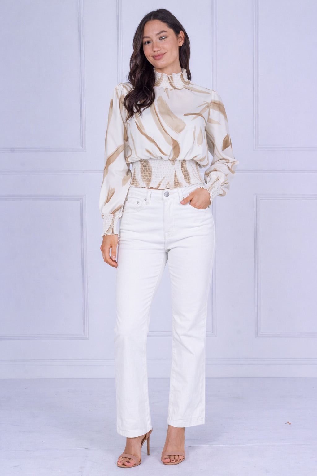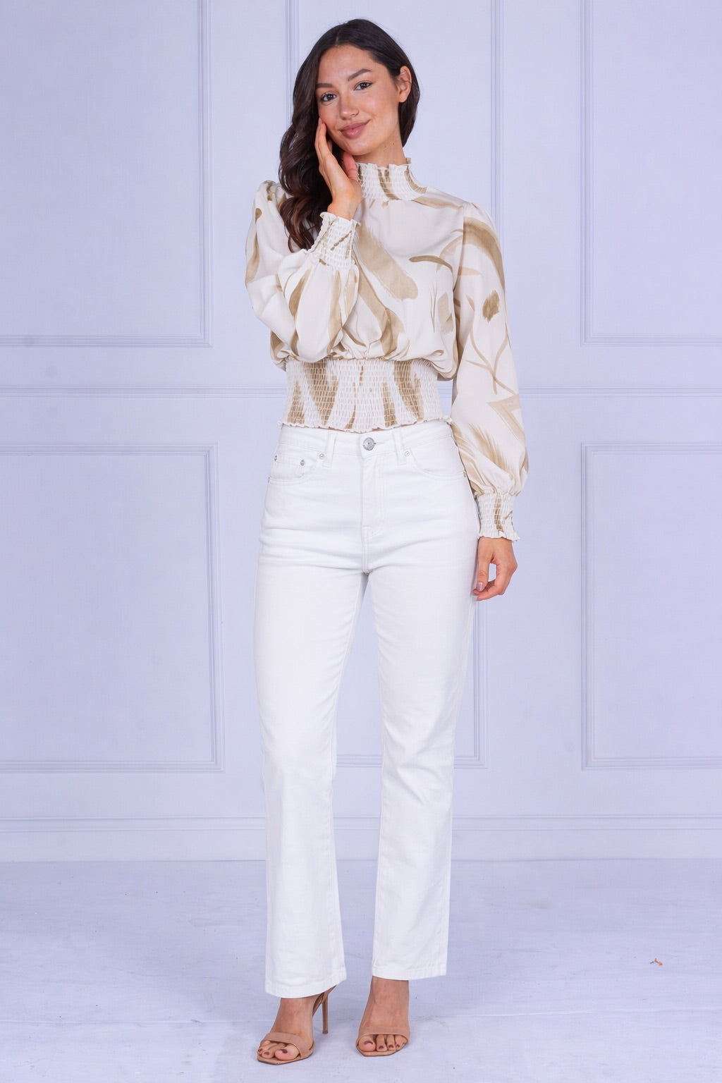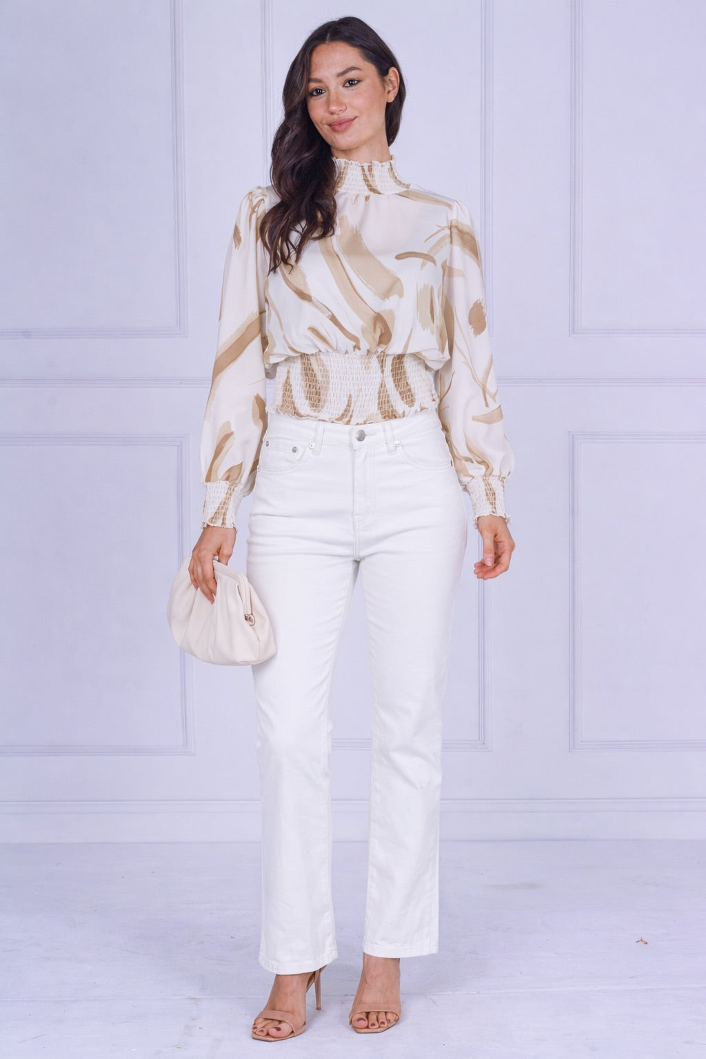 This Sand Brushstroke Smocked Blouse features a soft abstract brushstroke print in warm sand and neutral tones, designed with a refined smocked high neckline, long sleeves, and smocked cuffs for an elegant finish. The elasticated smocked waist creates a flattering silhouette while offering comfortable wear throughout the day. Lightweight and fluid, this blouse is easy to style with trousers, skirts, or denim, making it a versatile choice for spring styling, workwear, or polished everyday looks.