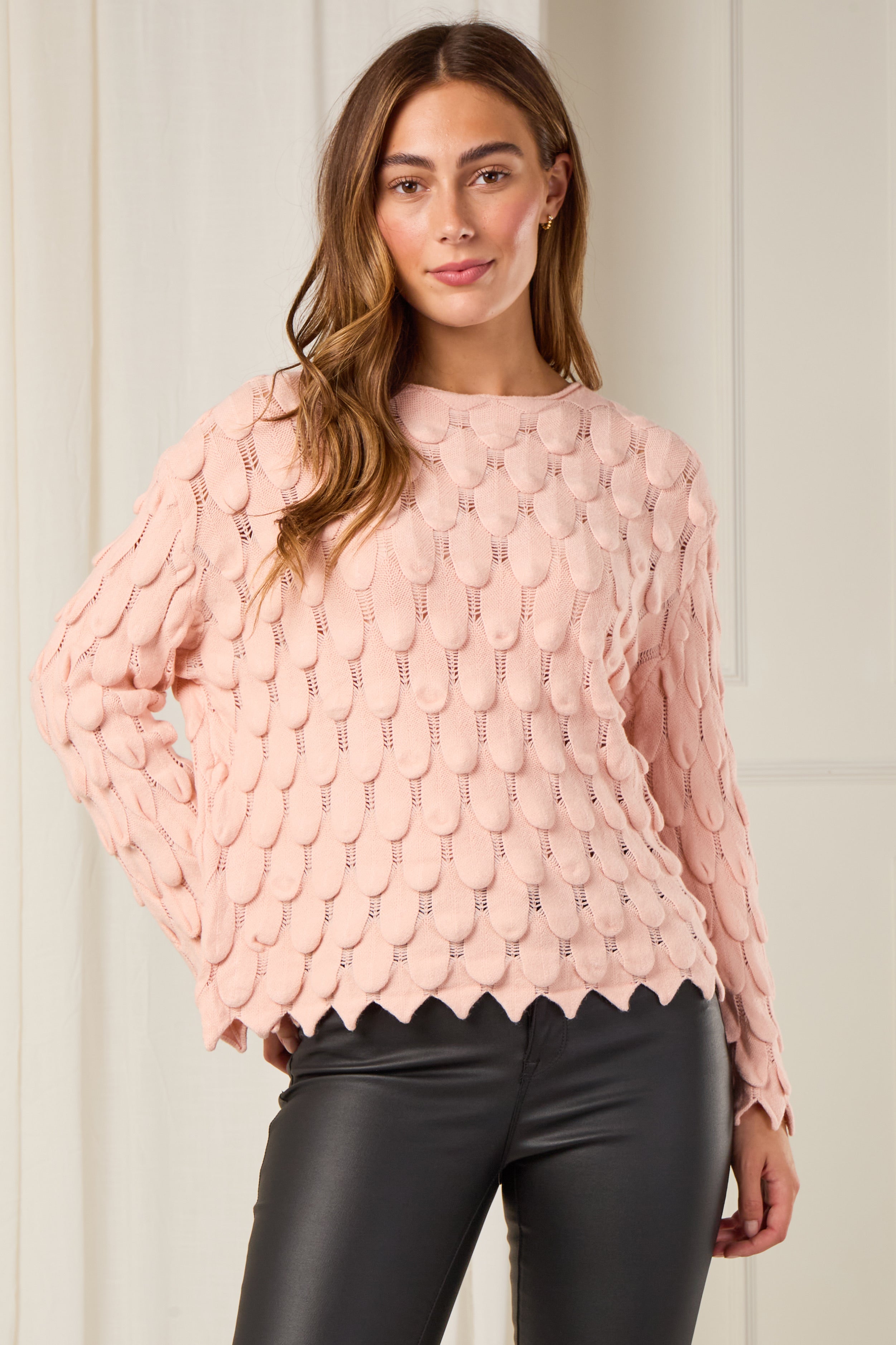 Bring soft sophistication to your wardrobe with this blush knit top, designed with a unique 3D petal texture for a beautifully tactile finish. The gently scalloped hem and cuffs add a subtle statement, while the round neckline and relaxed silhouette keep it effortlessly wearable. Its lightweight yet cosy handle makes it perfect for transitioning between seasons, pairing easily with tailored pieces or leather separates. Ideal for chic daytime looks, weekend brunches, or adding a touch of feminine texture to an evening outfit.