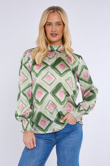 Green Mosaic Print Shirred Neck Satin Top