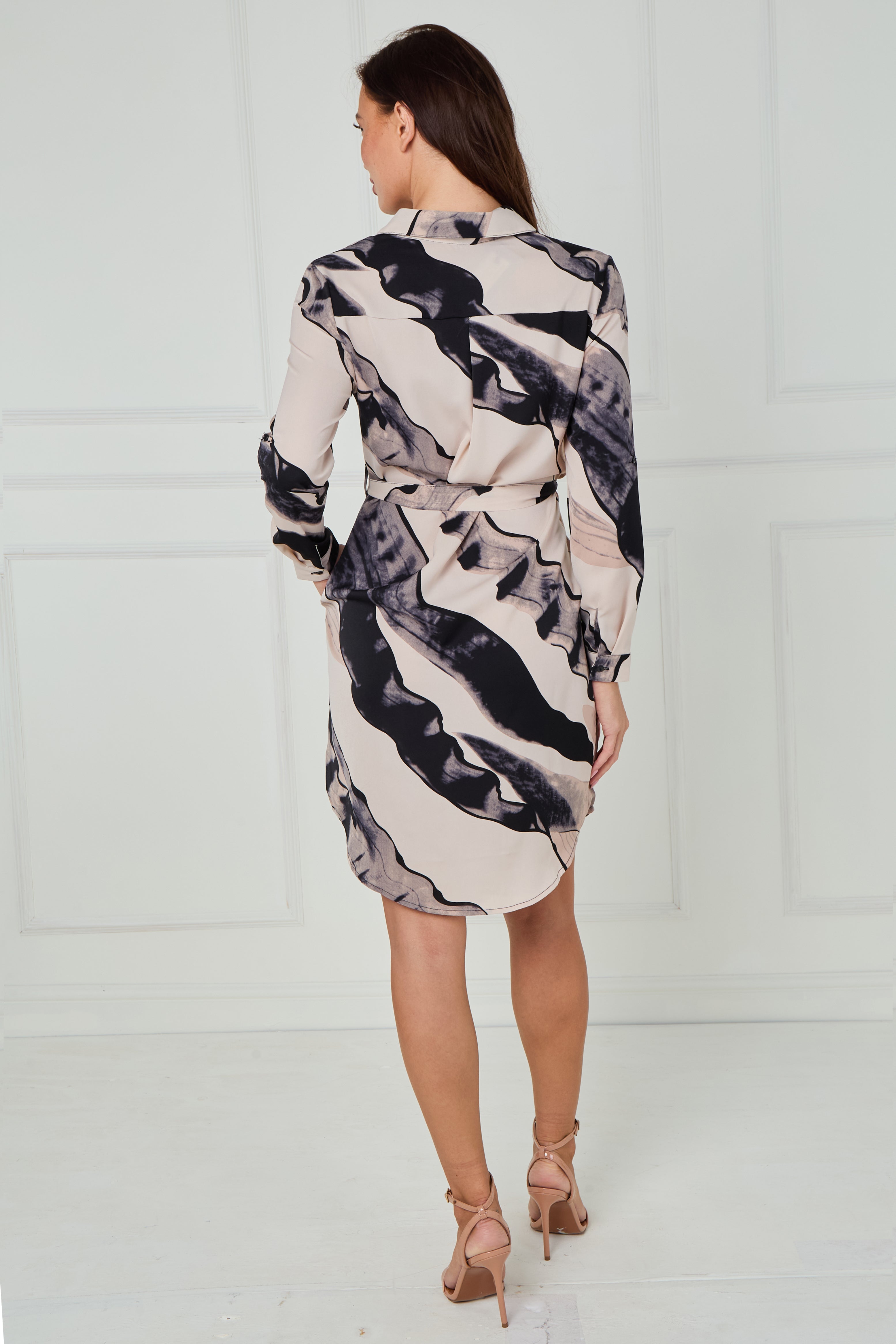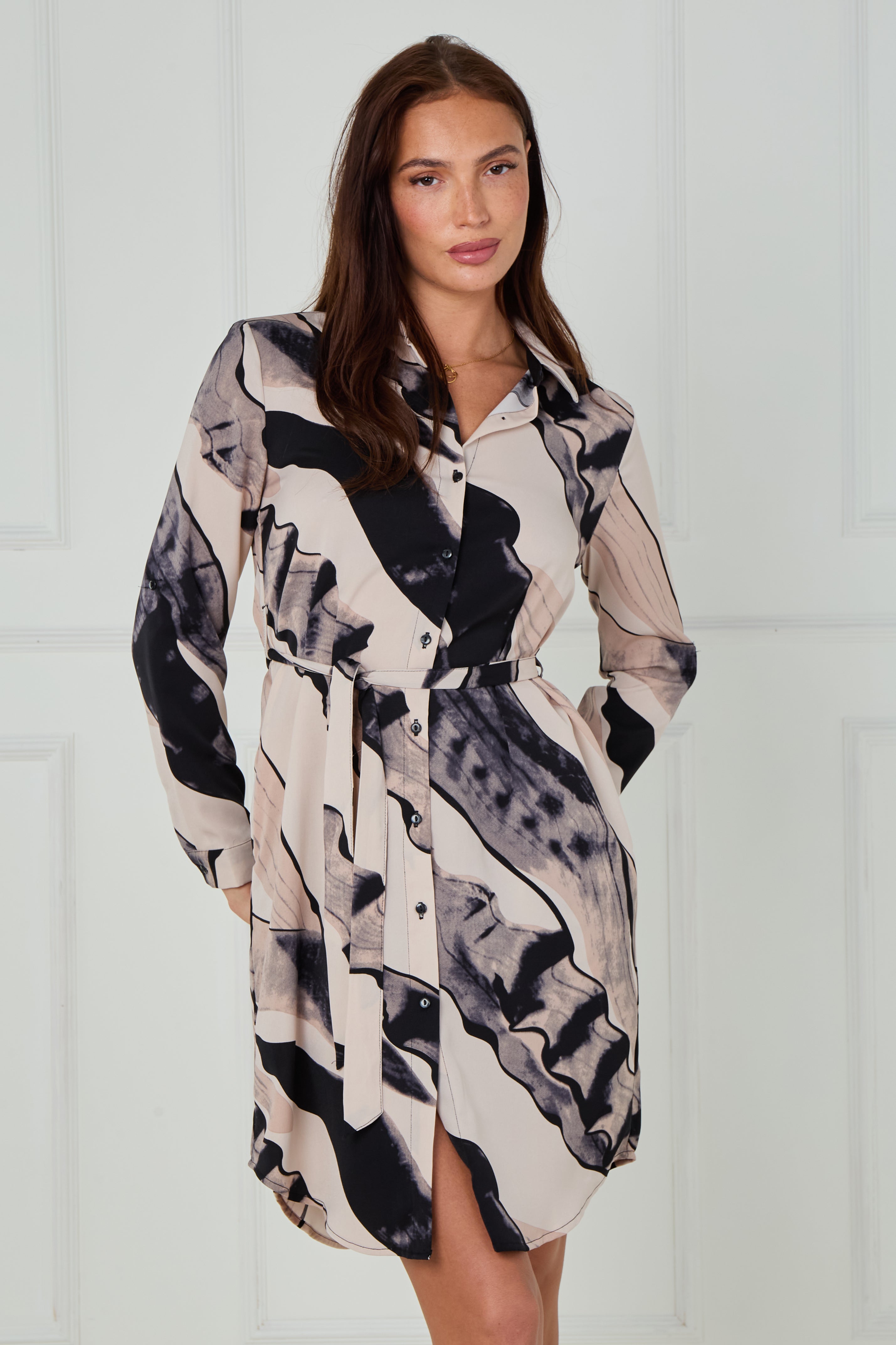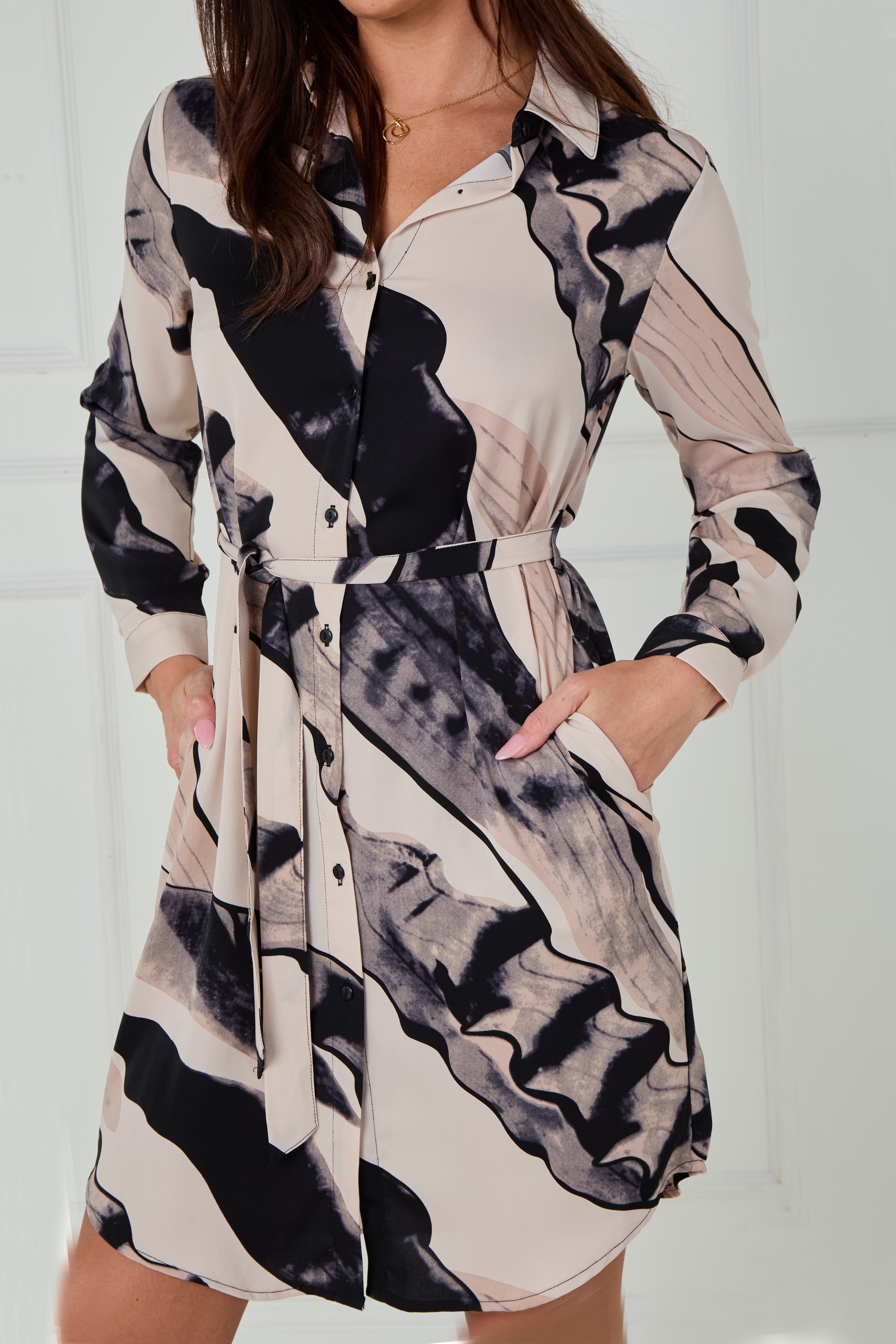 Elevate your everyday style with our Beige and Black Abstract Brushstroke Print Mini Shirt Dress, a striking blend of modern artistry and classic design. Crafted from a soft, fluid fabric, it features bold black brushstroke detailing across a chic beige base for a sophisticated yet effortless look. The button-through front, smart shirt collar, and self-tie belt create a flattering silhouette, while the long sleeves with buttoned cuffs and curved hemline add a refined touch. Complete with practical side pockets, this versatile mini dress transitions seamlessly from day to night—pair with heels for a polished evening outfit or boots for understated daytime elegance.