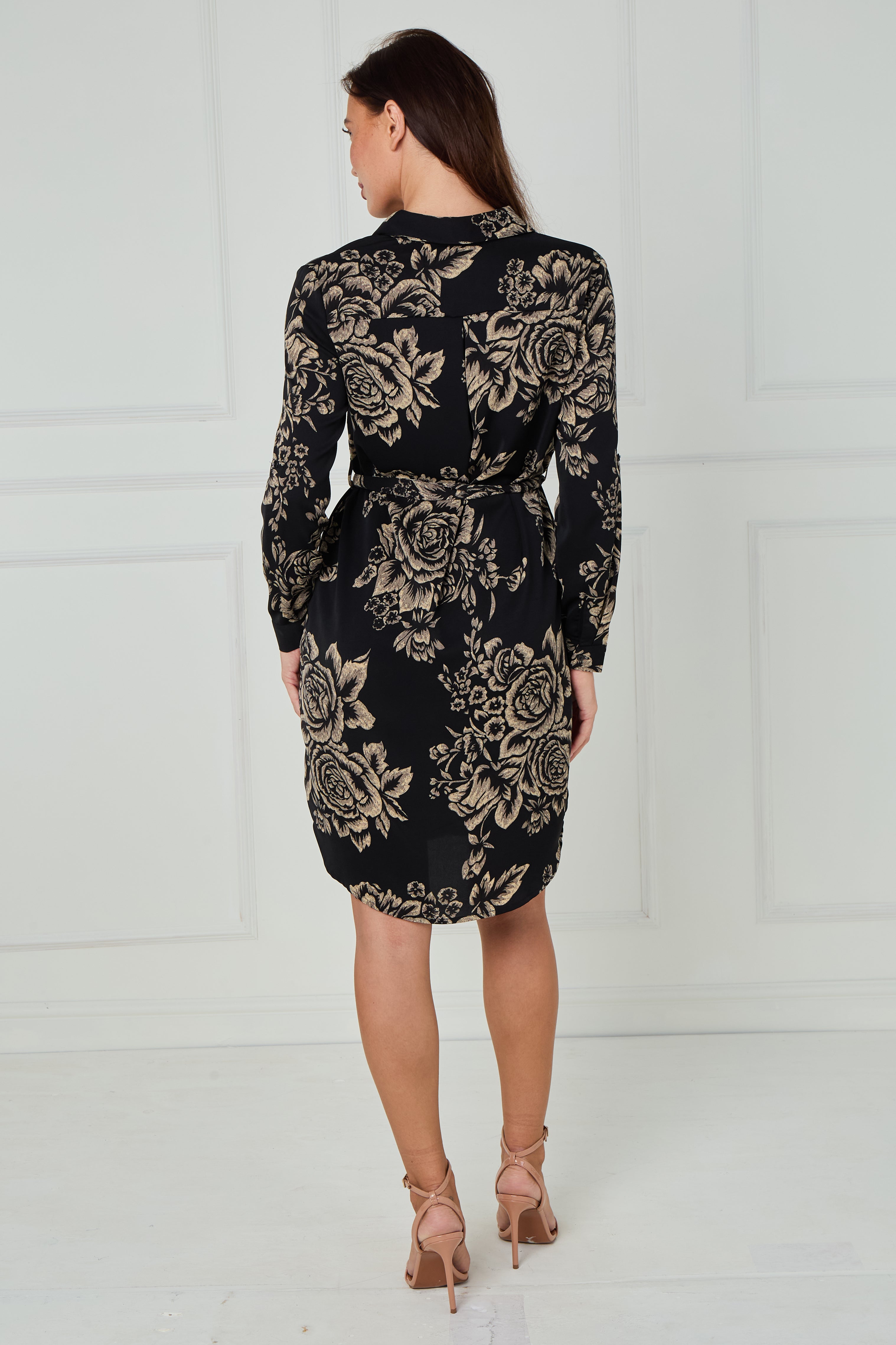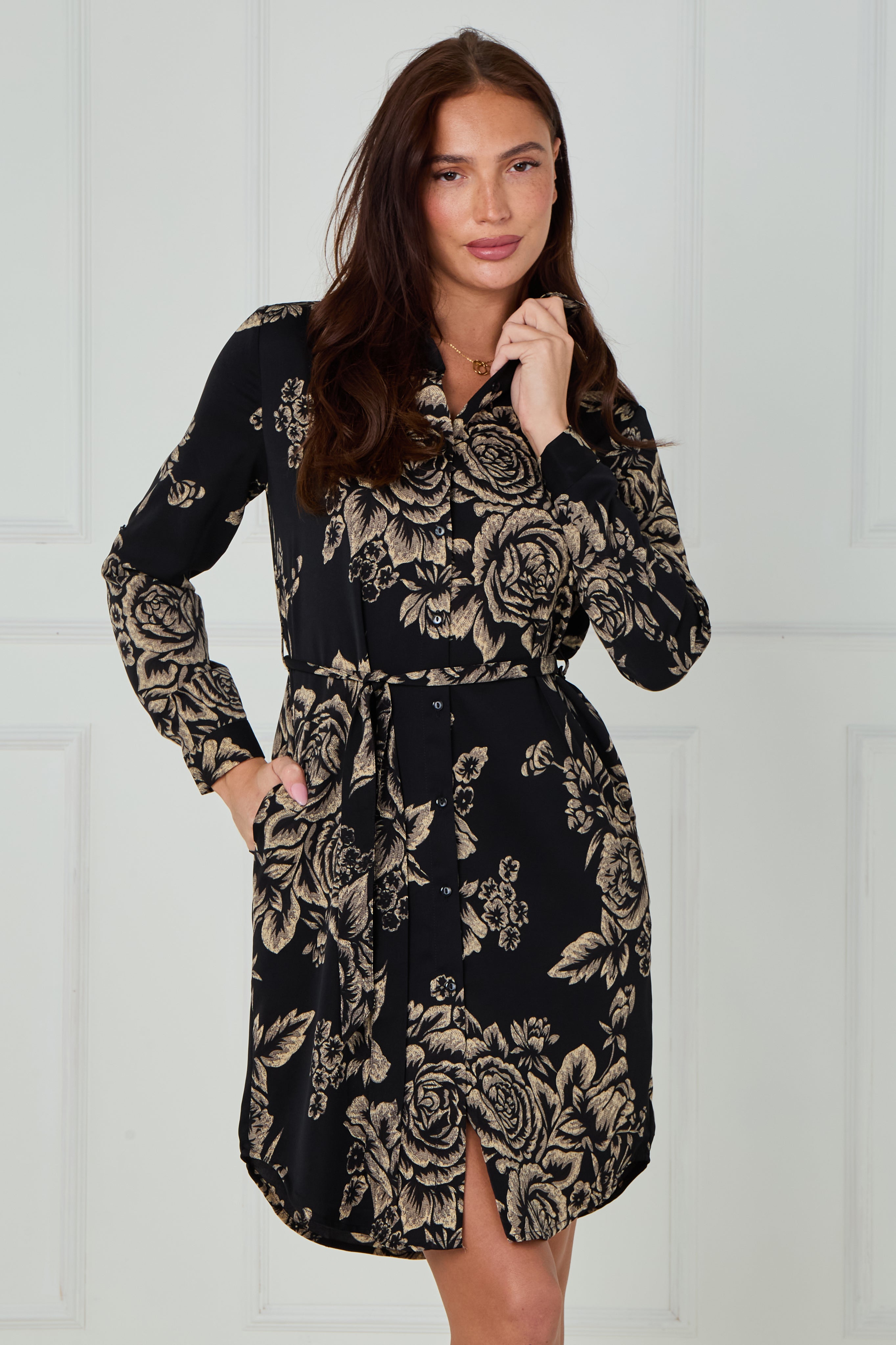 Exude timeless elegance in our Black and Beige Rose Print Mini Shirt Dress, crafted from a soft, drapey fabric that flatters every silhouette. Featuring an all-over rose print in delicate beige tones against a chic black background, this dress offers a perfect balance of sophistication and versatility. The button-through front, classic shirt collar, and self-tie belt define the waist for a feminine shape, while the long sleeves with buttoned cuffs and subtle curved hemline complete the look. Finished with handy side pockets, this effortlessly stylish piece transitions seamlessly from day to night—pair with heels for a polished evening outfit or boots for relaxed daytime charm.