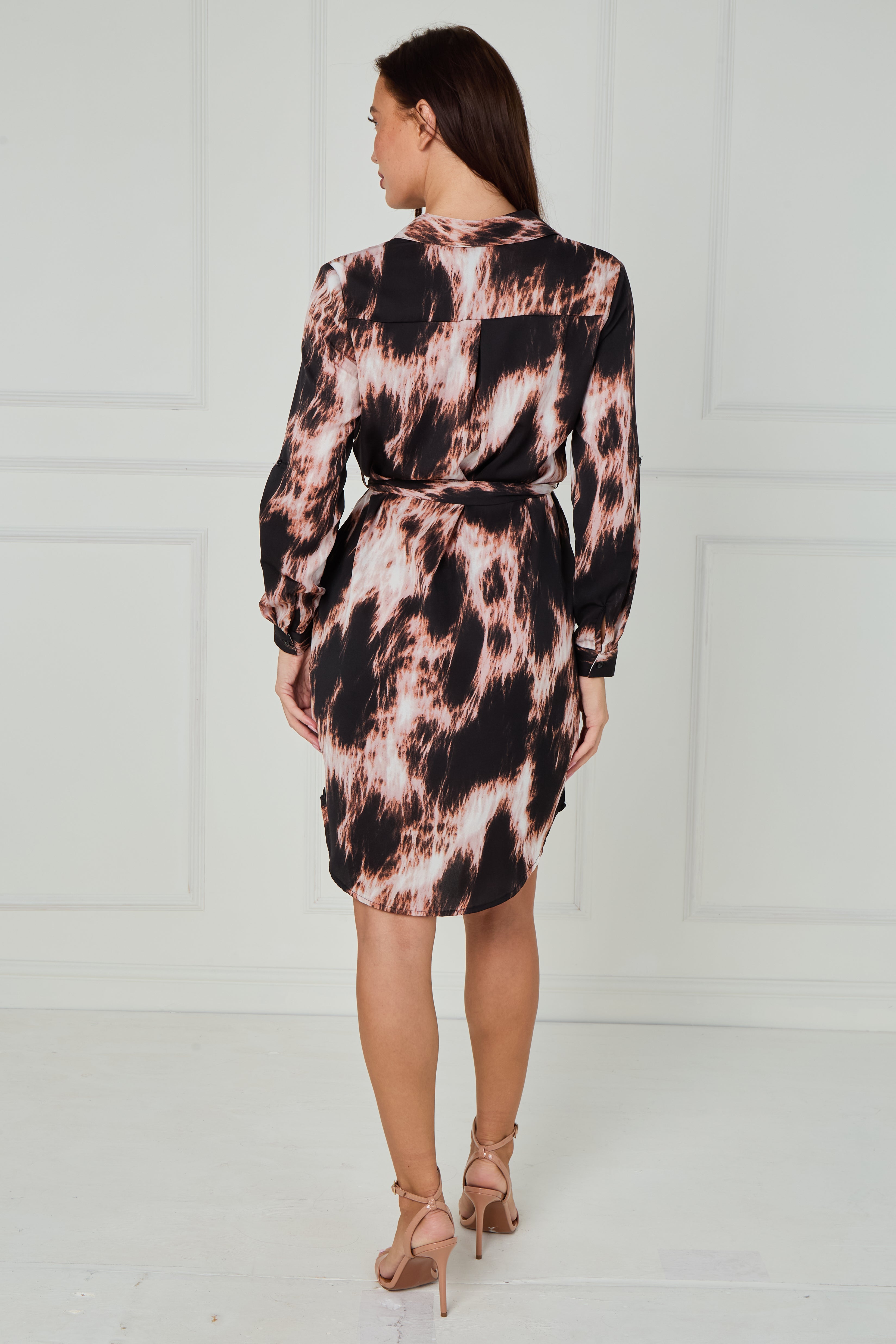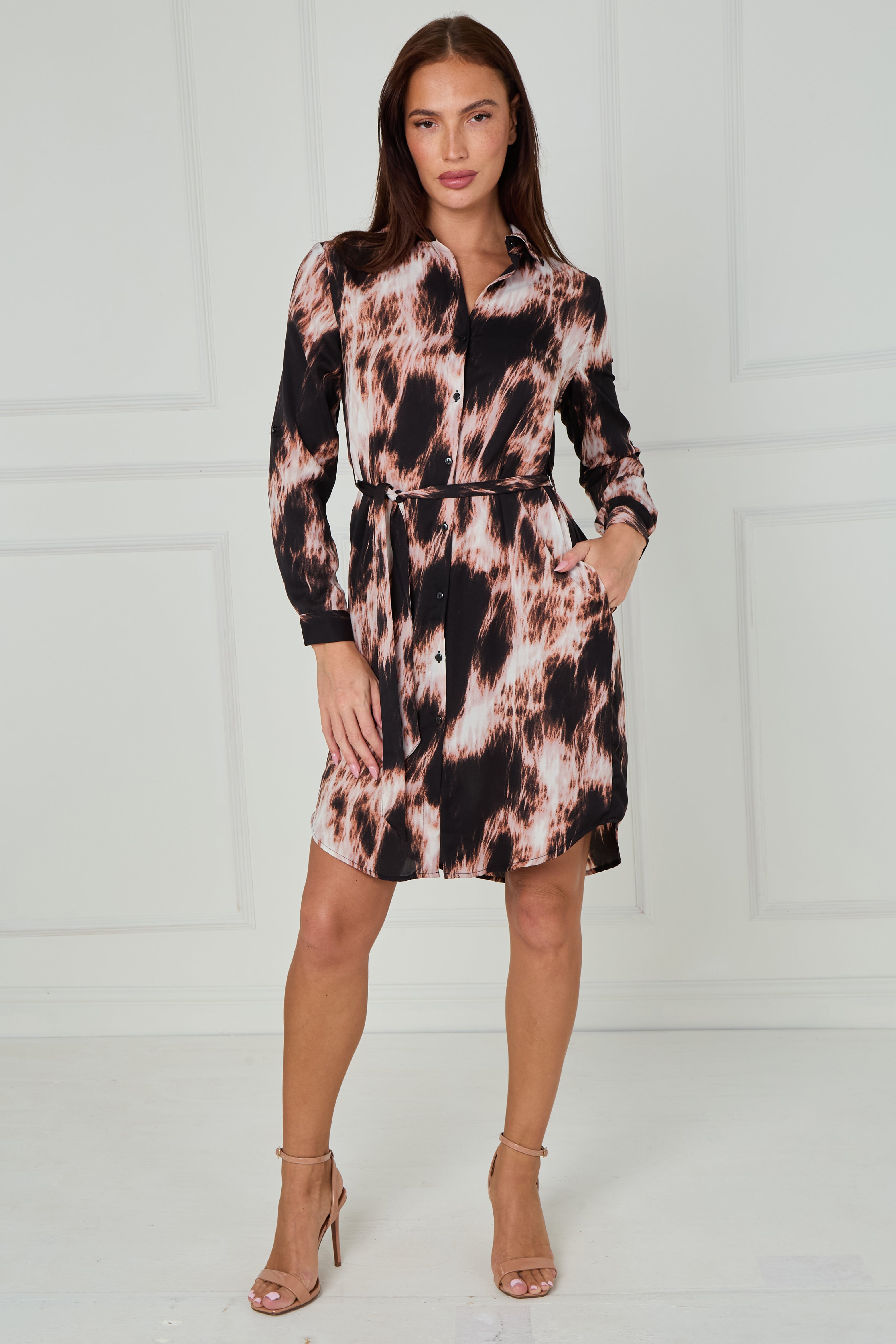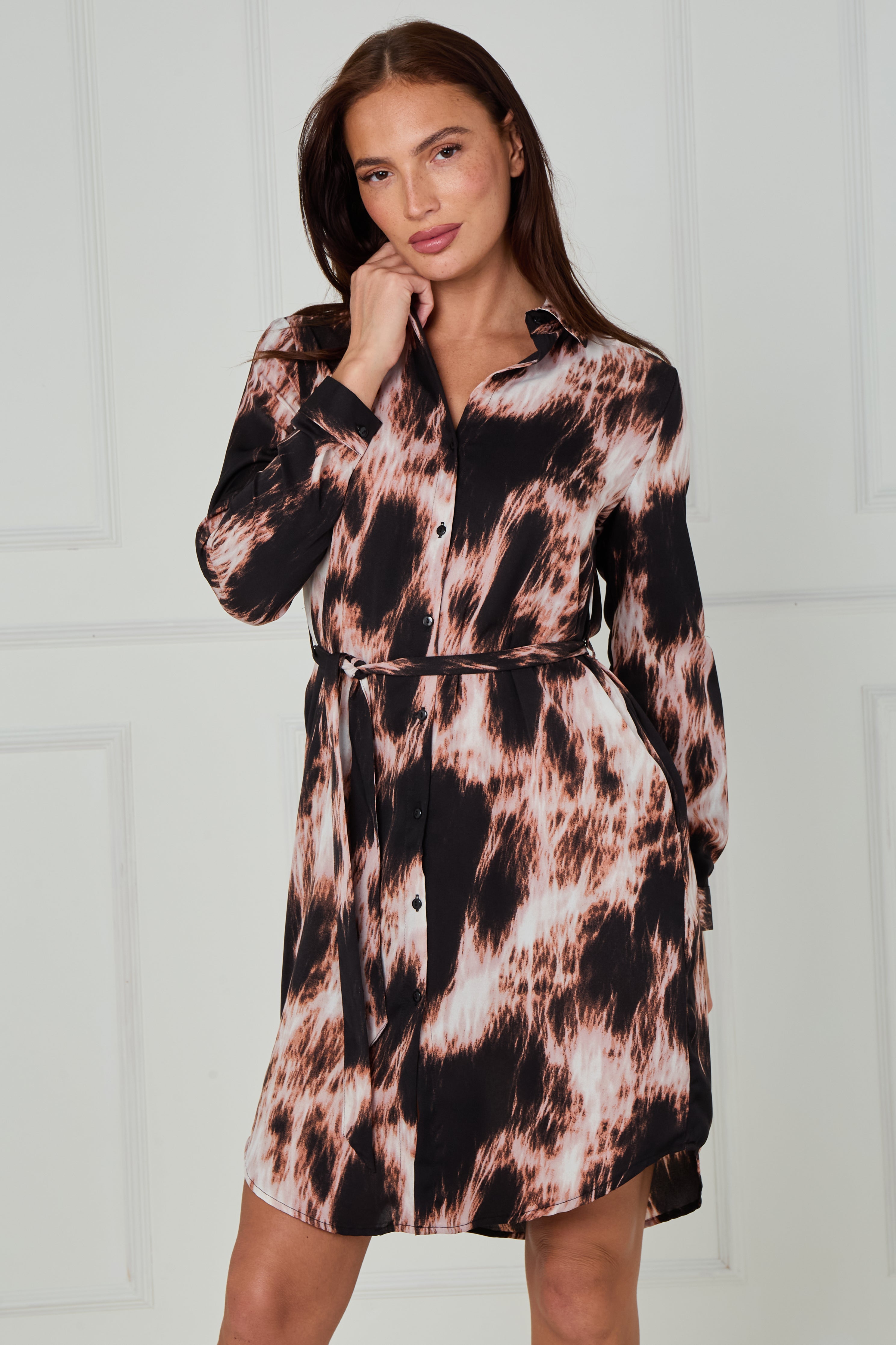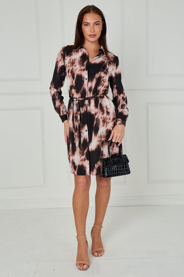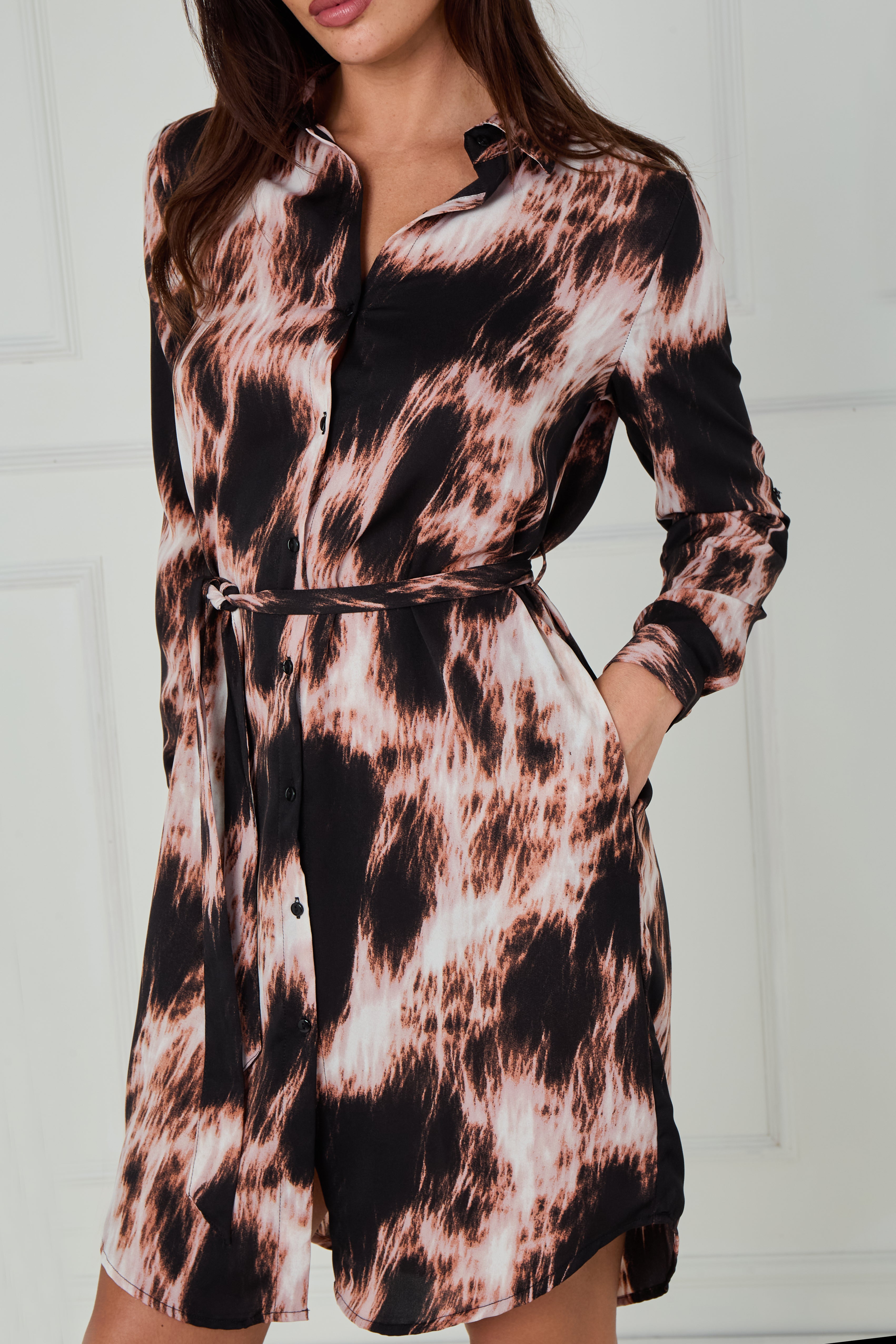 Make a statement in our Black and Blush Abstract Tie Dye Print Mini Shirt Dress, a modern take on a timeless favourite. Crafted from a soft, fluid fabric, it features an eye-catching abstract tie dye design in soft blush and black tones that add a touch of contemporary edge. The button-through front, classic shirt collar, and self-tie belt create a flattering, waist-defining shape, while the long sleeves with buttoned cuffs and curved hemline offer a polished finish. Designed with practical side pockets, this effortlessly stylish dress transitions perfectly from day to night—pair with heels for an elegant evening look or boots for easy everyday chic.