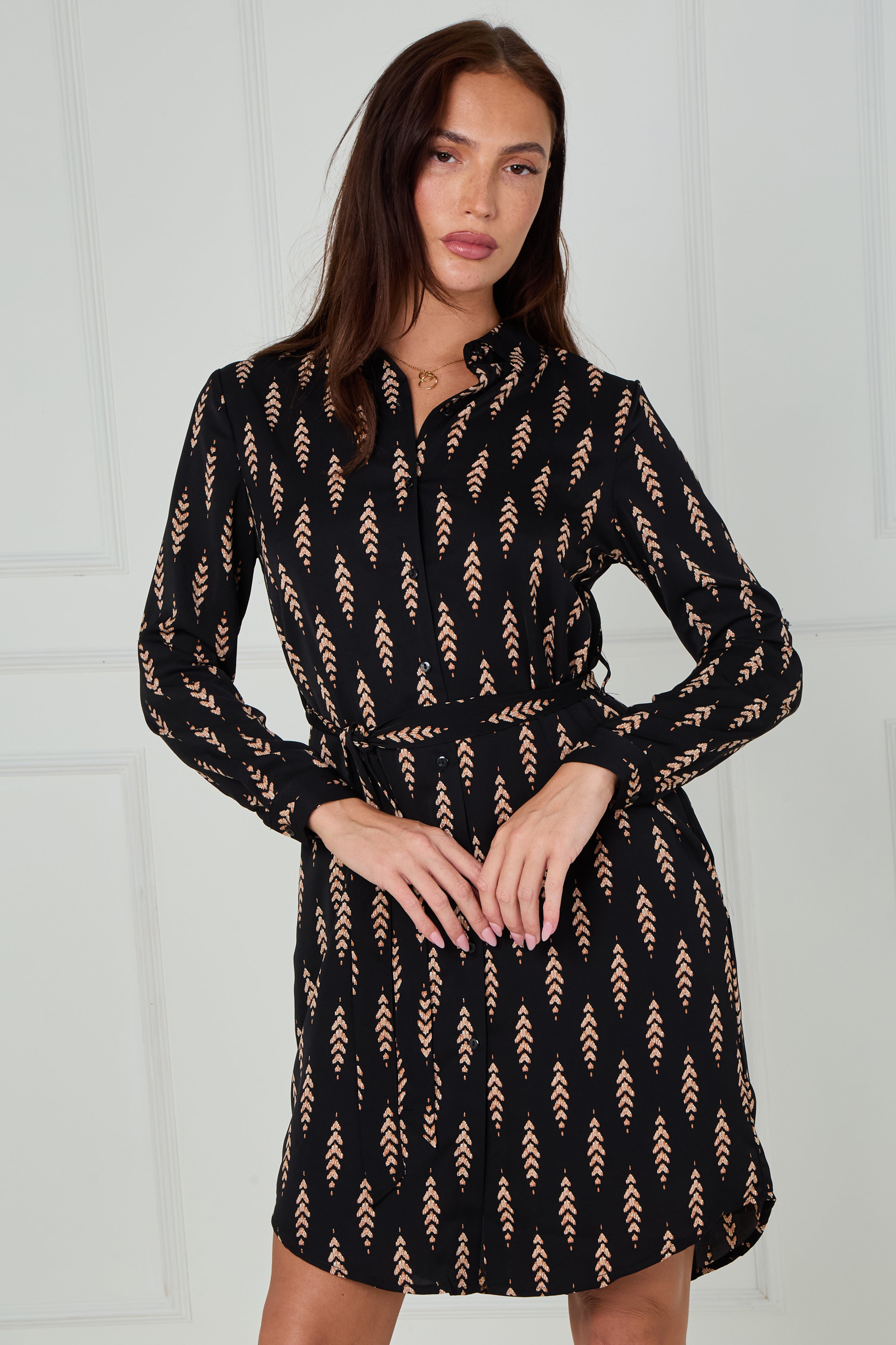 Bring a contemporary edge to your everyday style with our Black and Camel Chevron Print Mini Shirt Dress, designed in a soft, lightweight fabric for all-day comfort and effortless sophistication. Featuring an eye-catching chevron print in warm camel tones against a sleek black backdrop, this dress combines timeless patterning with a modern silhouette. The button-through front, classic shirt collar, and self-tie belt define the waist beautifully, while the long sleeves with buttoned cuffs and curved hemline add a refined touch. Complete with practical side pockets, this versatile mini dress is perfect for any occasion—pair with heels for a chic evening look or ankle boots for stylish daytime wear.