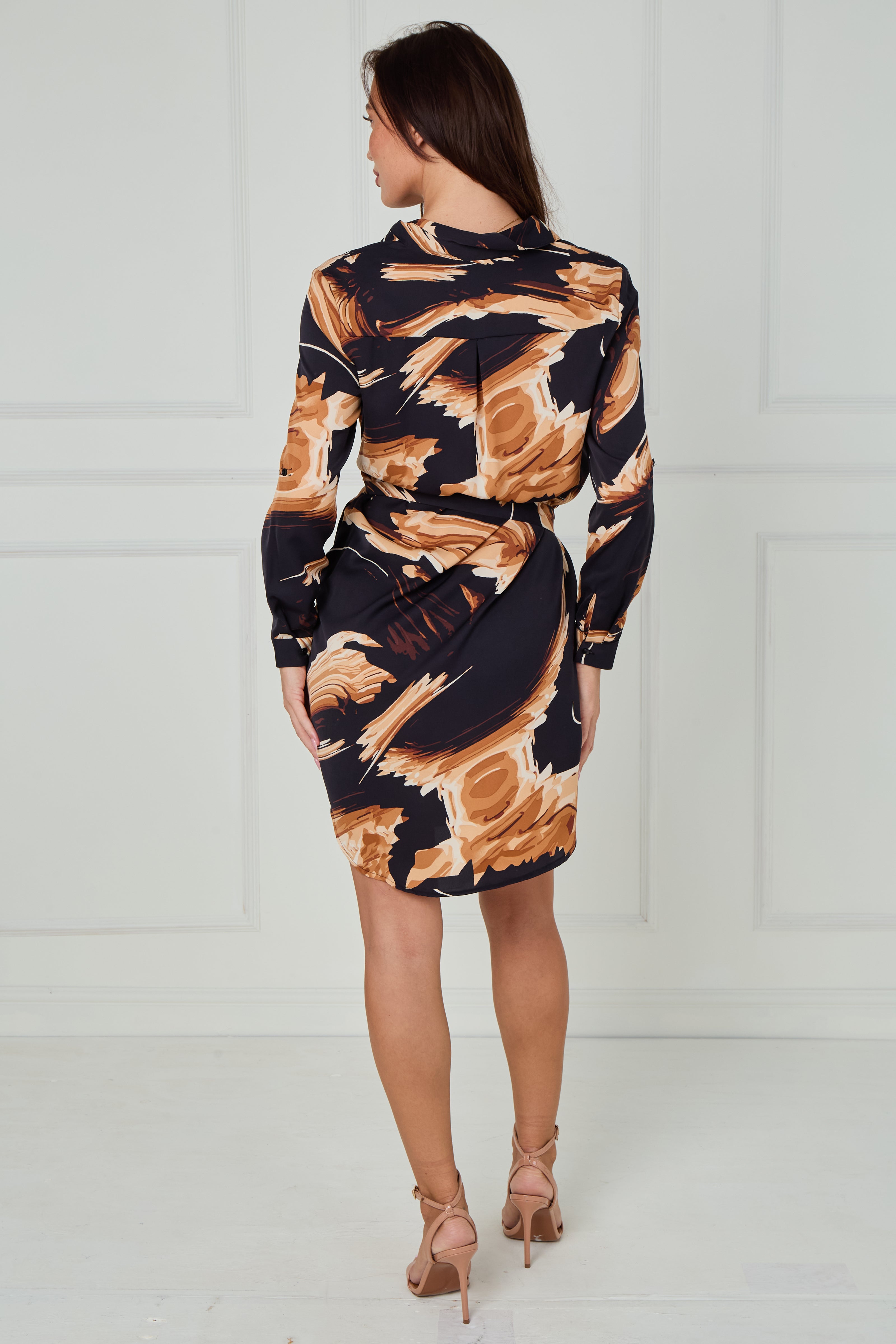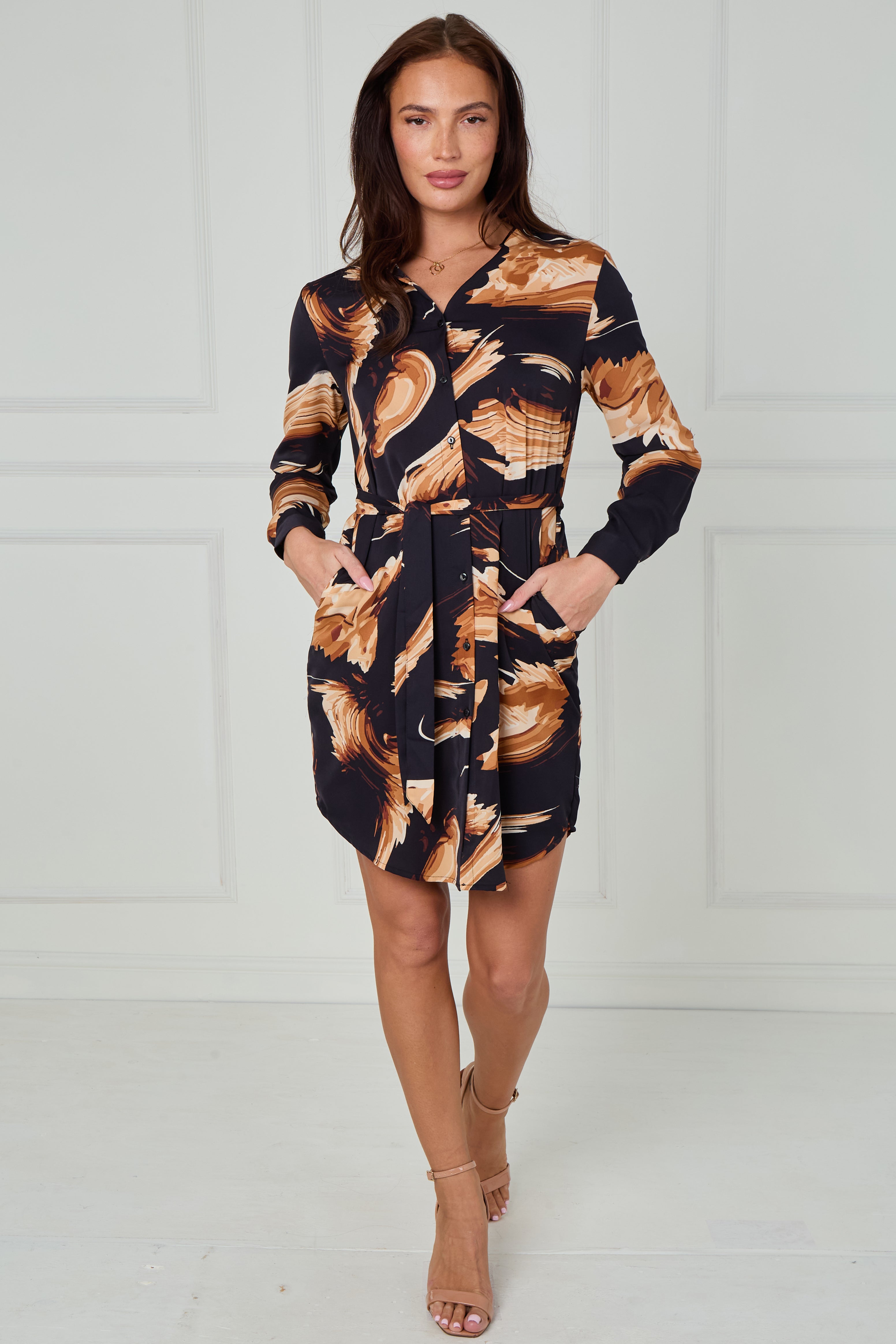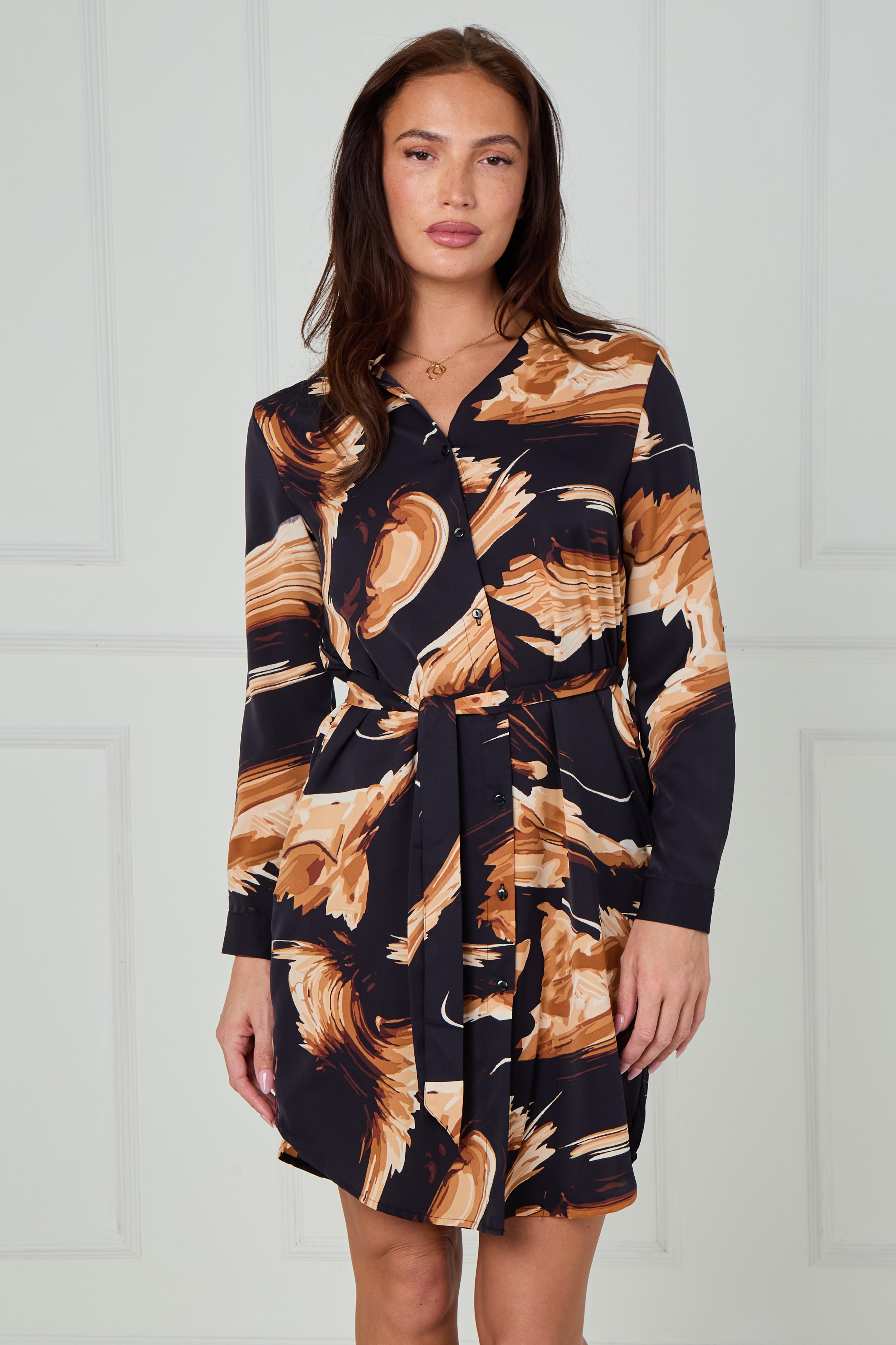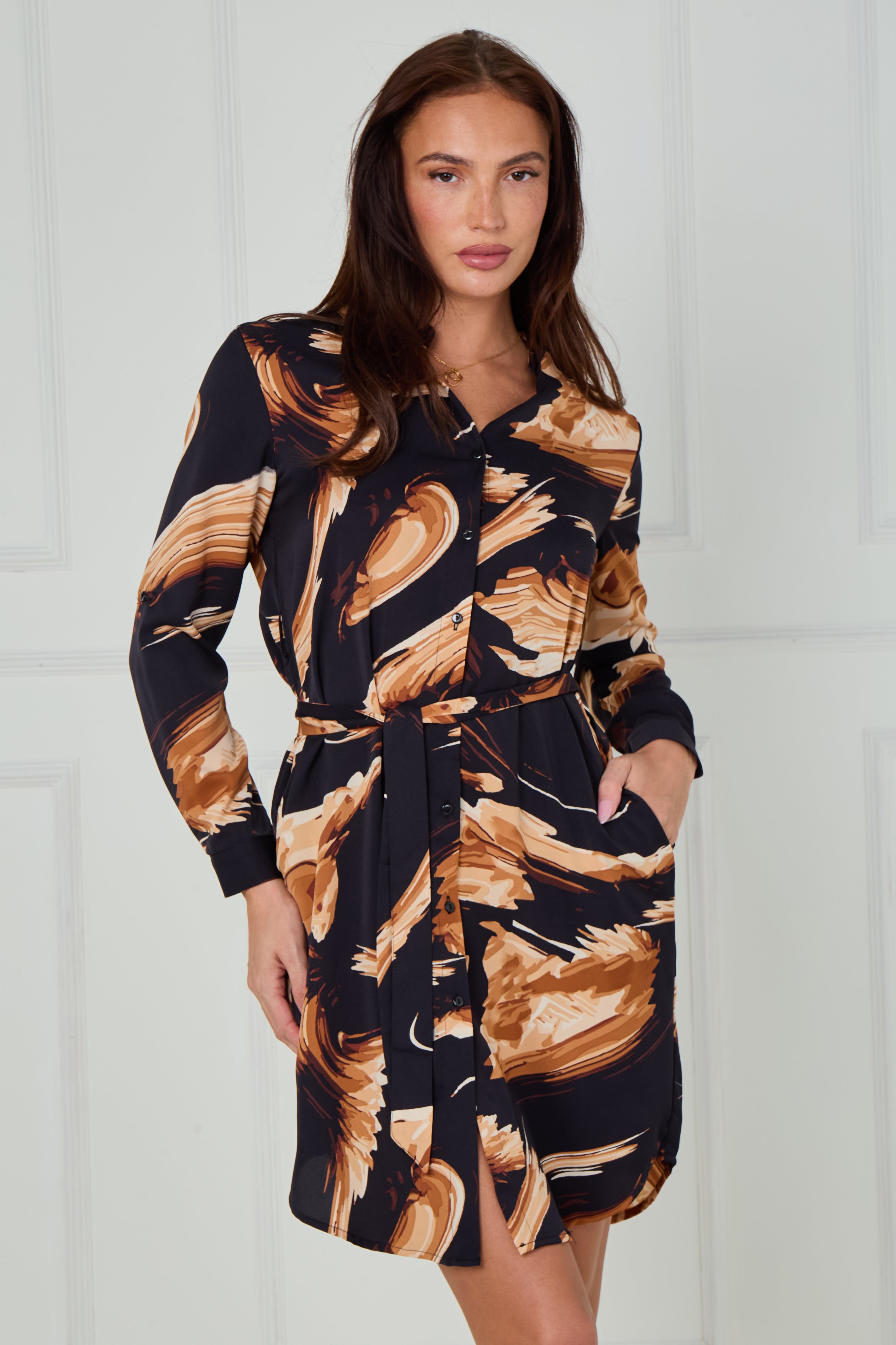 Add a sophisticated edge to your wardrobe with our Black and Mustard Smoky Abstract Print Mini Shirt Dress, designed to make a statement with ease. Crafted from a soft, fluid fabric, it features a captivating smoky abstract pattern in warm mustard and caramel tones against a sleek black backdrop. The button-through front, classic shirt collar, and self-tie belt create a flattering, waist-defining silhouette, while the long sleeves with buttoned cuffs and gently curved hemline add a polished touch. Finished with practical side pockets, this versatile mini dress transitions effortlessly from day to night—pair with heels for a chic evening look or ankle boots for modern daytime style.