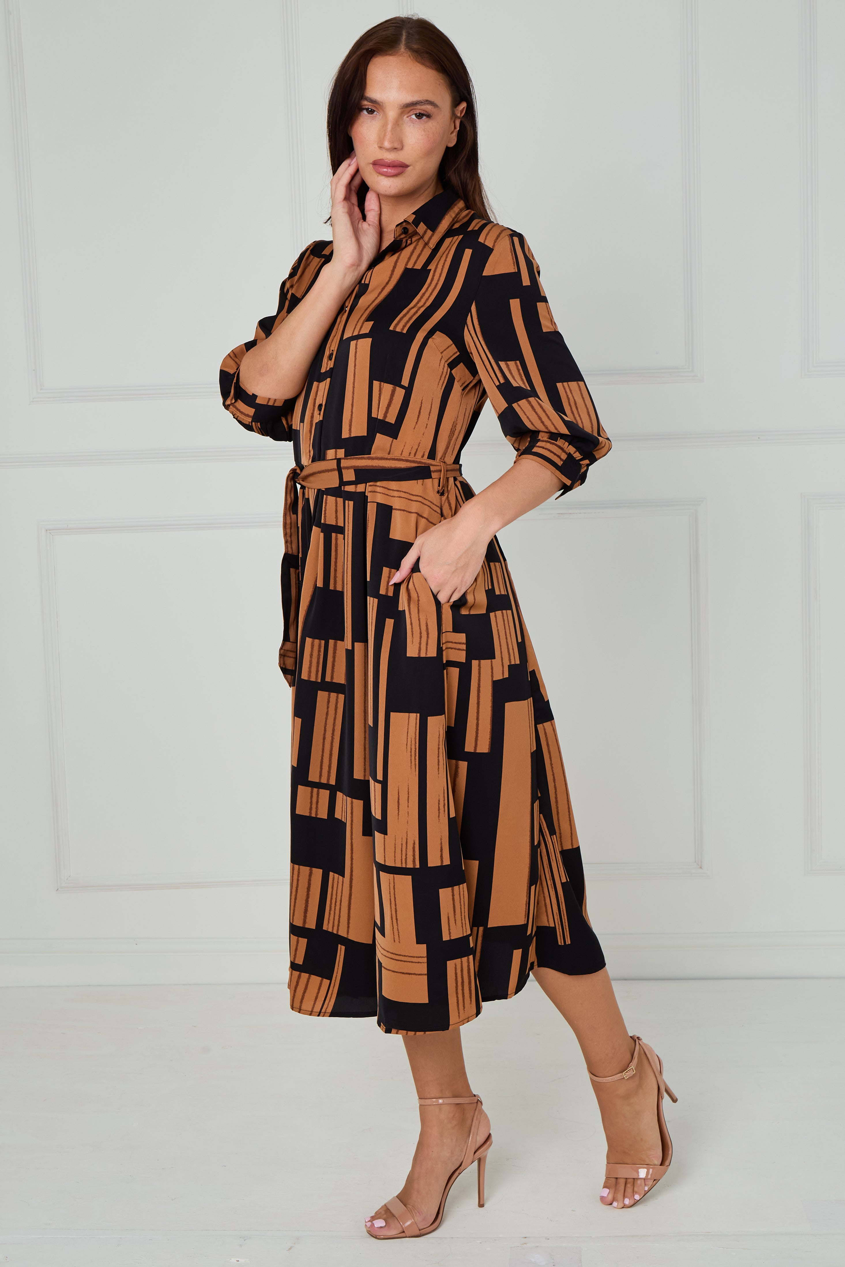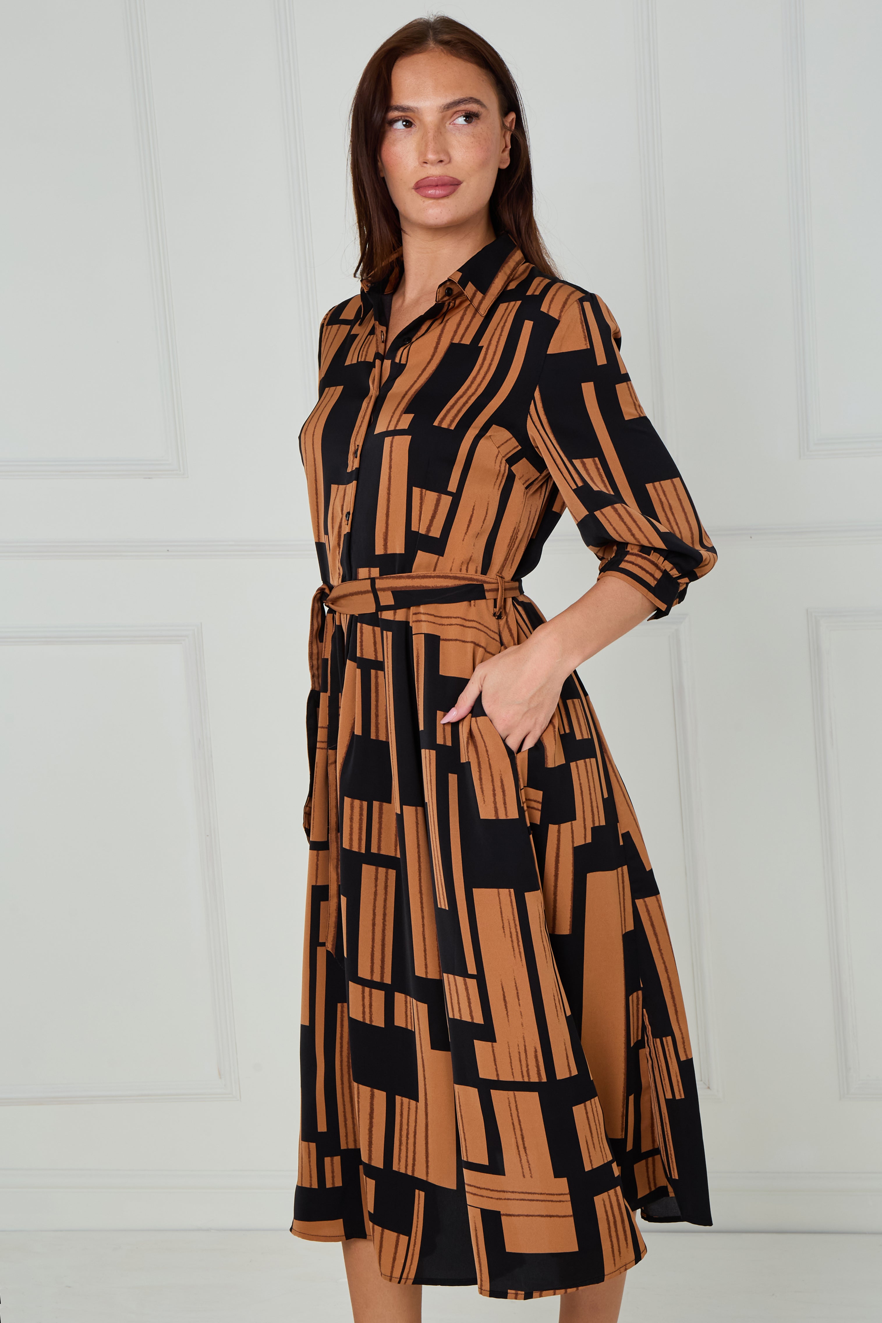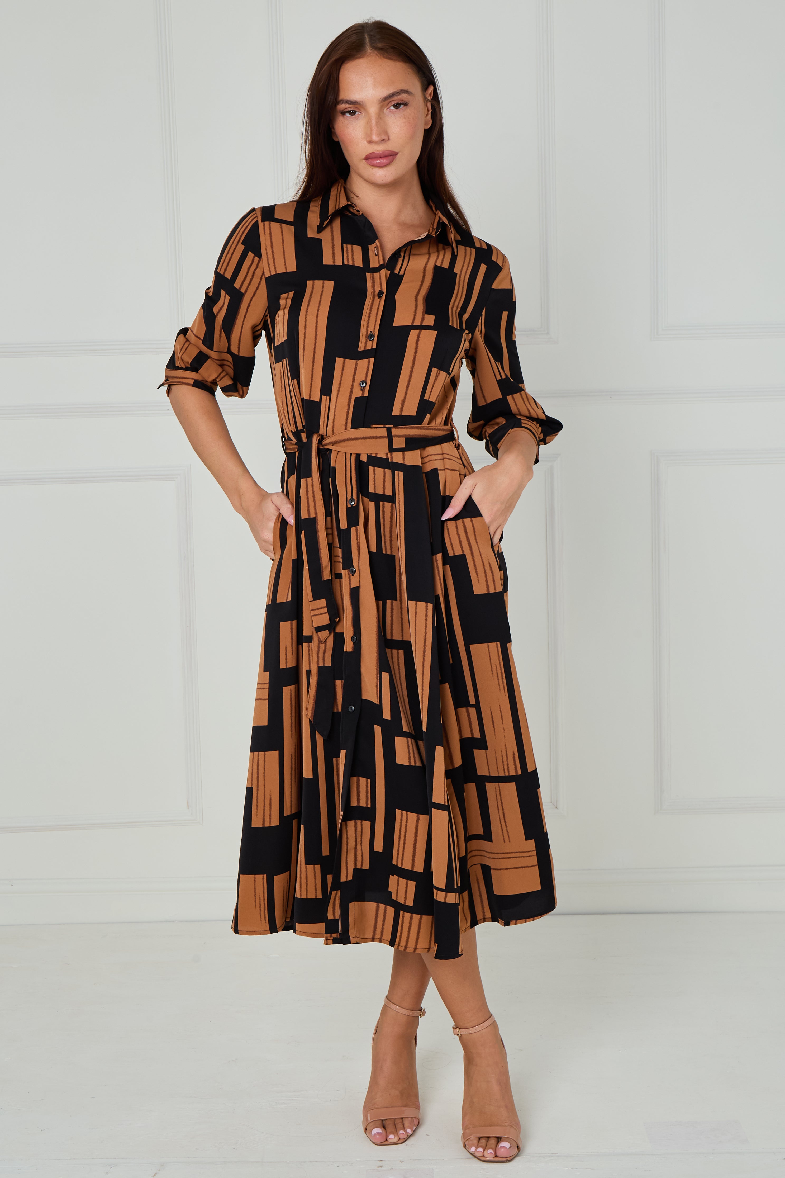 Make a bold yet refined statement with our Black and Tan Geometric Stripe Print Midi Shirt Dress, a standout piece that combines modern design with timeless elegance. Crafted from a soft, flowing fabric, it features a striking geometric stripe print in rich tan tones against a sleek black background. The button-through front, classic shirt collar, and self-tie belt define the waist for a flattering silhouette, while the long sleeves with roll-up button tabs add versatile styling options. Finished with handy side pockets and a graceful midi-length hem, this dress effortlessly transitions from workdays to weekends—style it with heels for a polished look or ankle boots for contemporary everyday chic.