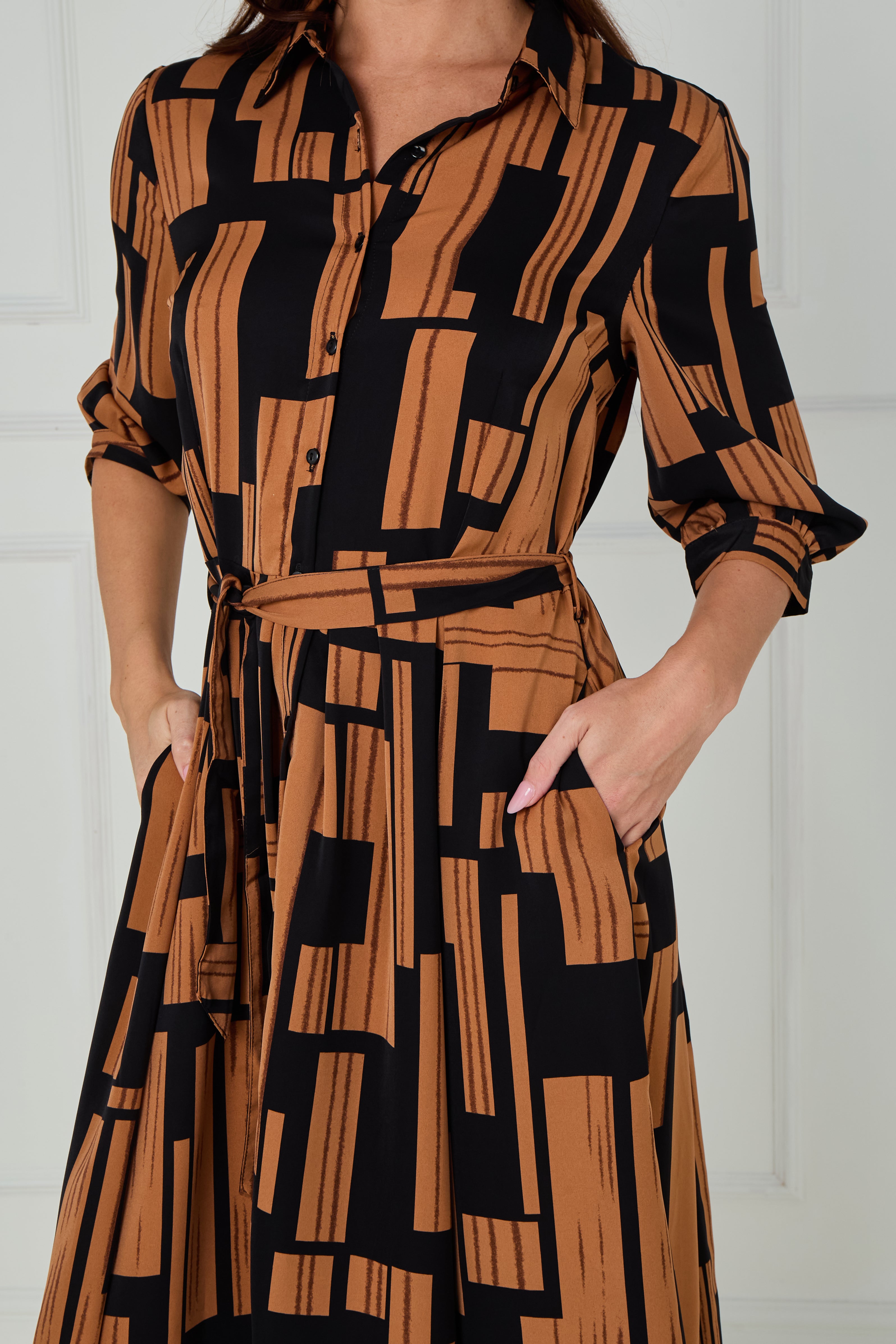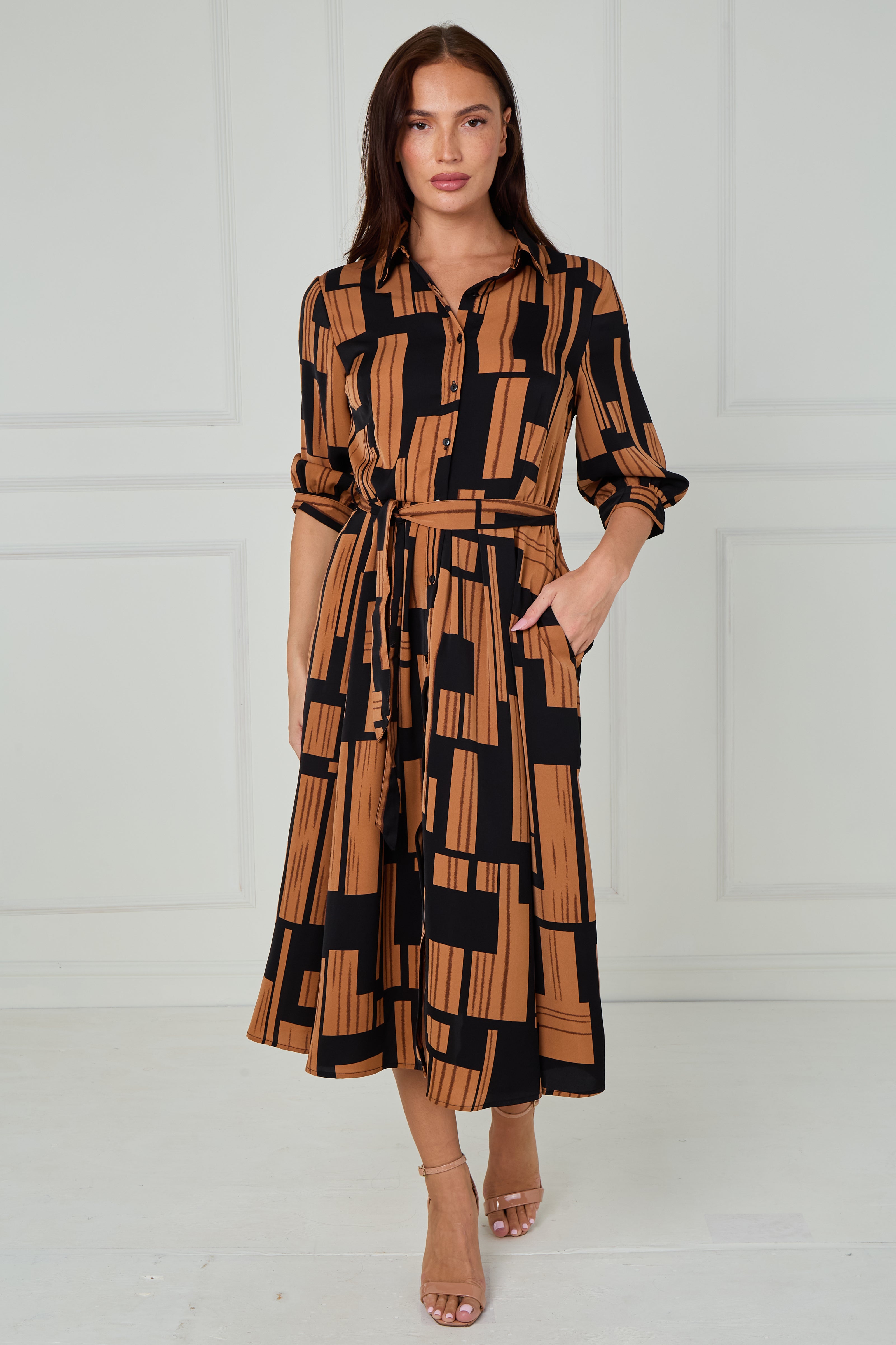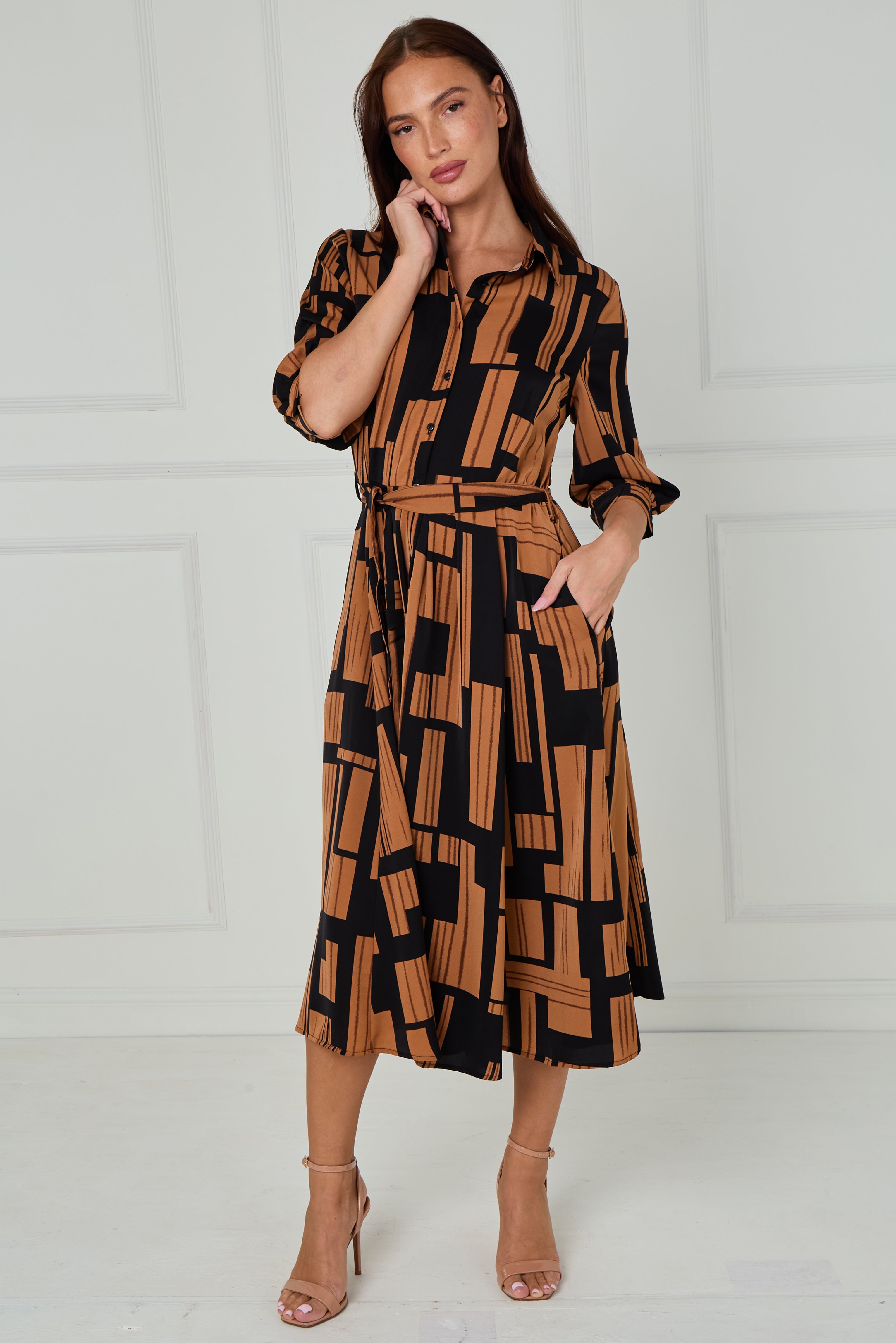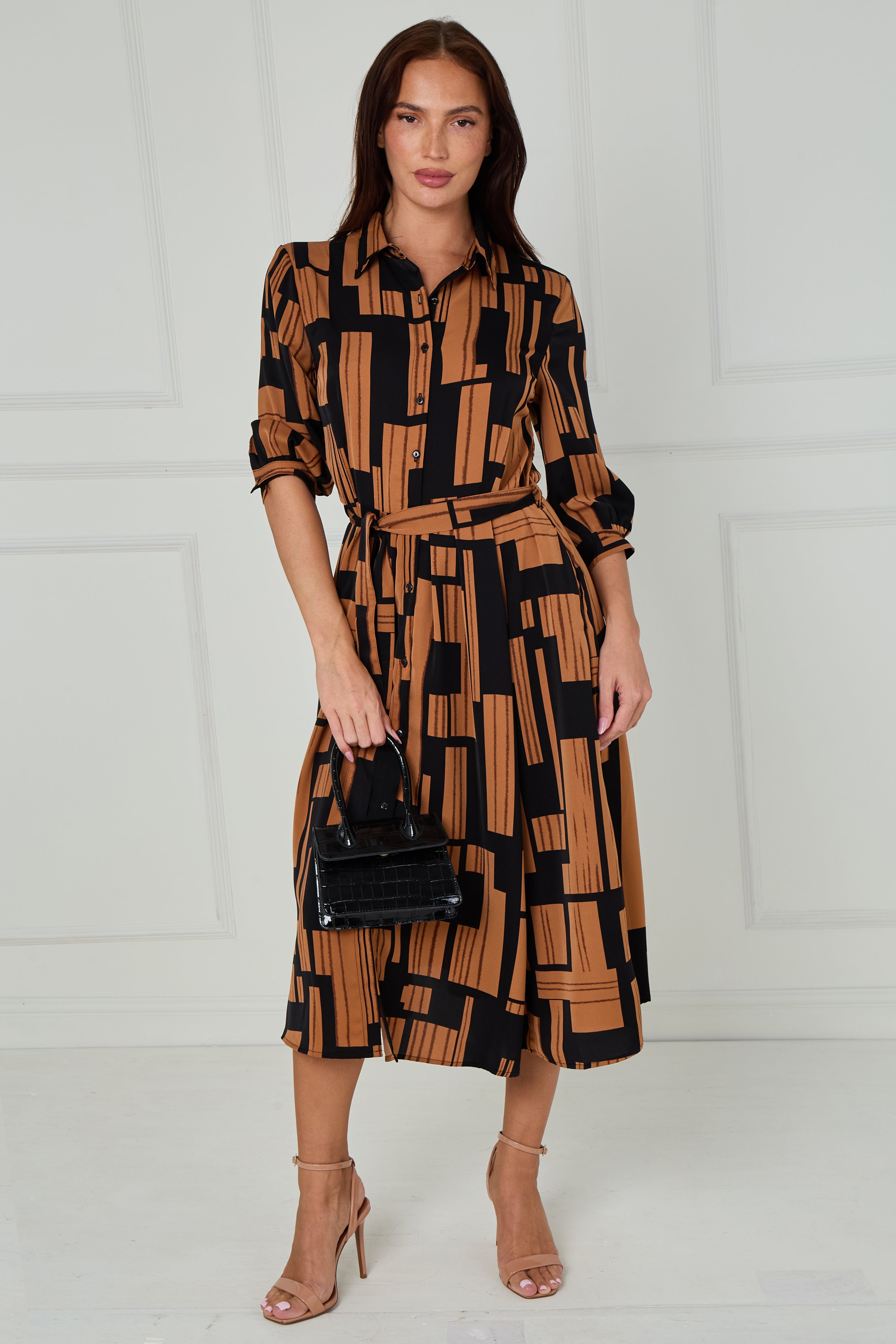 Make a bold yet refined statement with our Black and Tan Geometric Stripe Print Midi Shirt Dress, a standout piece that combines modern design with timeless elegance. Crafted from a soft, flowing fabric, it features a striking geometric stripe print in rich tan tones against a sleek black background. The button-through front, classic shirt collar, and self-tie belt define the waist for a flattering silhouette, while the long sleeves with roll-up button tabs add versatile styling options. Finished with handy side pockets and a graceful midi-length hem, this dress effortlessly transitions from workdays to weekends—style it with heels for a polished look or ankle boots for contemporary everyday chic.