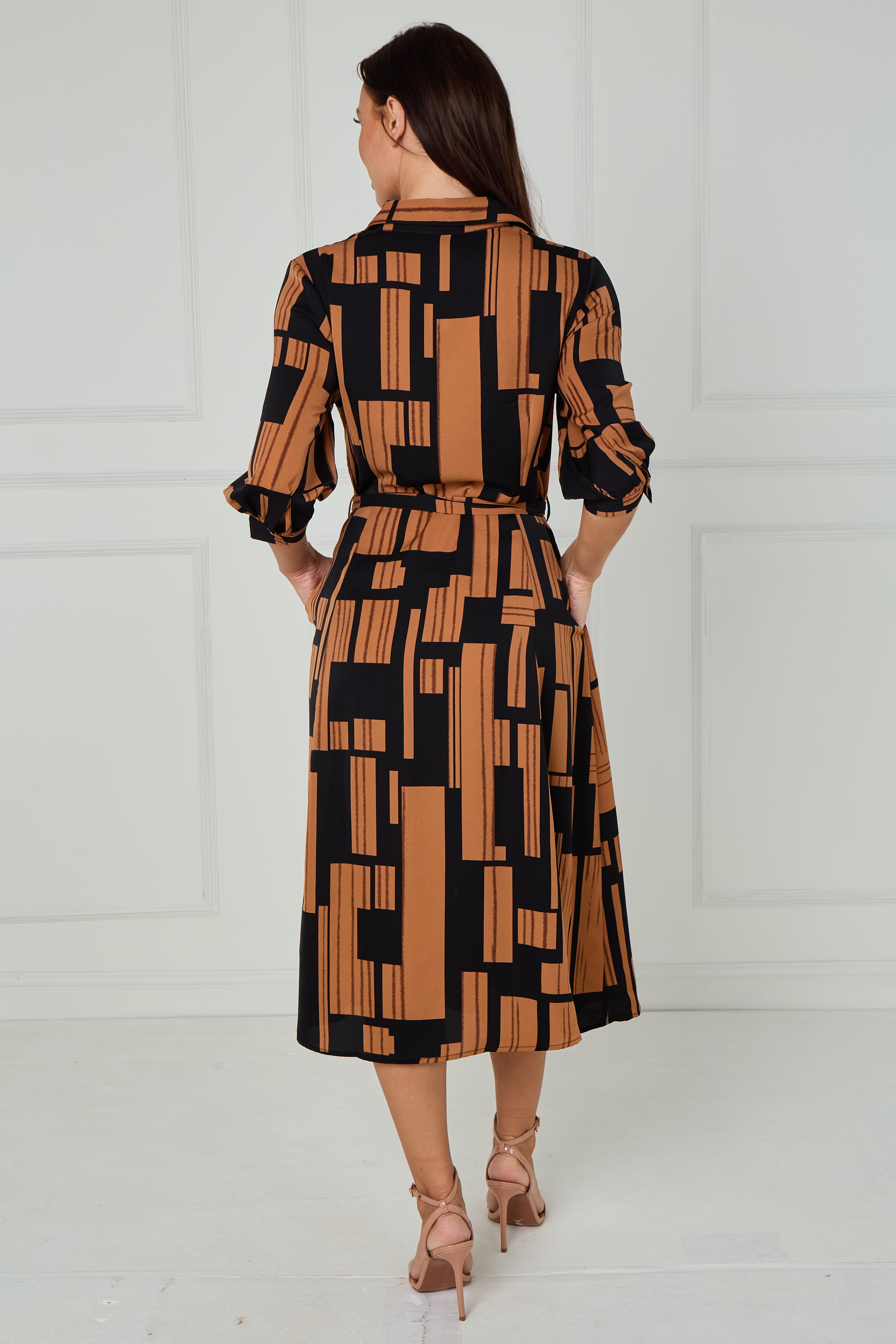Black and Tan Geometric Stripe Print Midi Shirt Dress