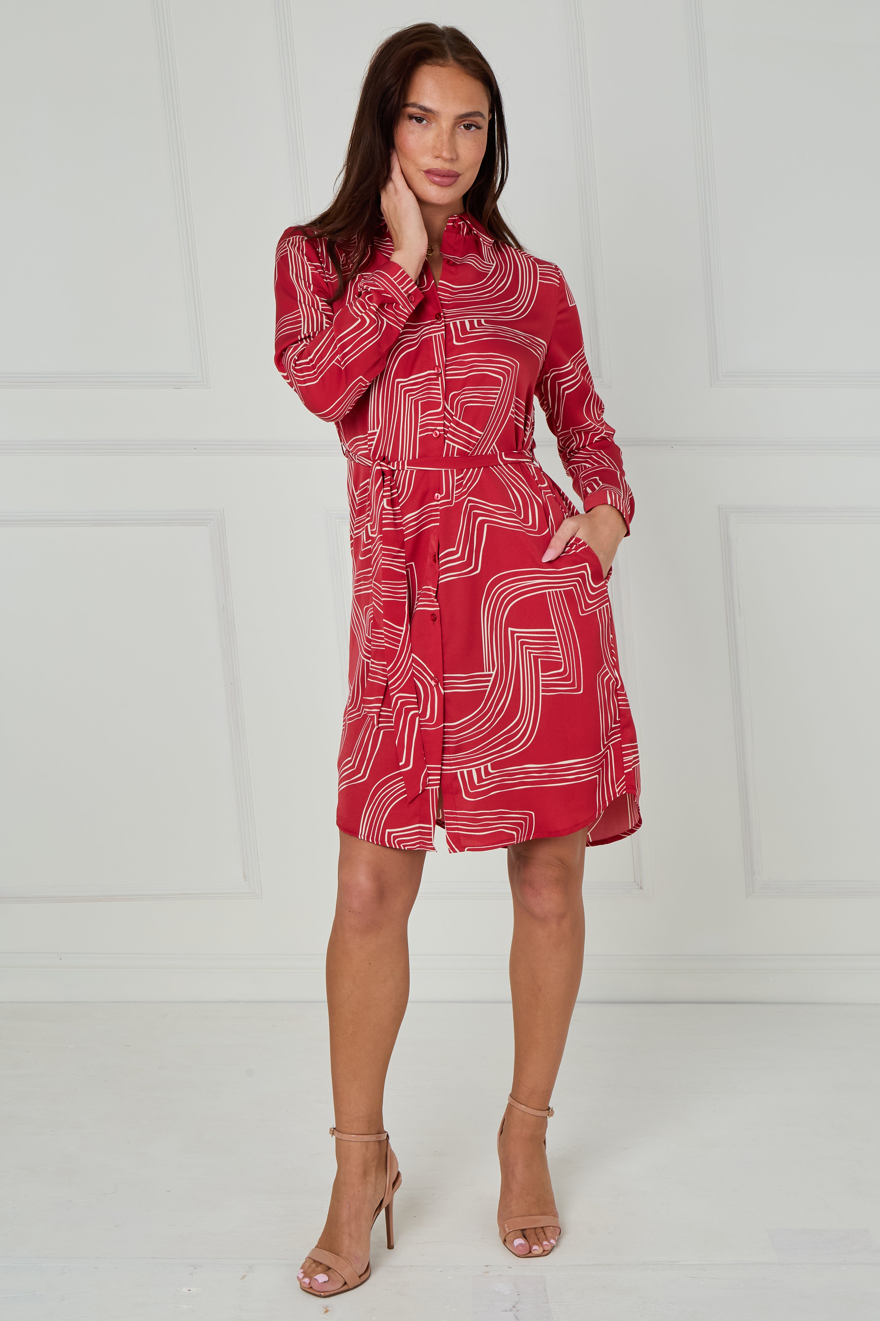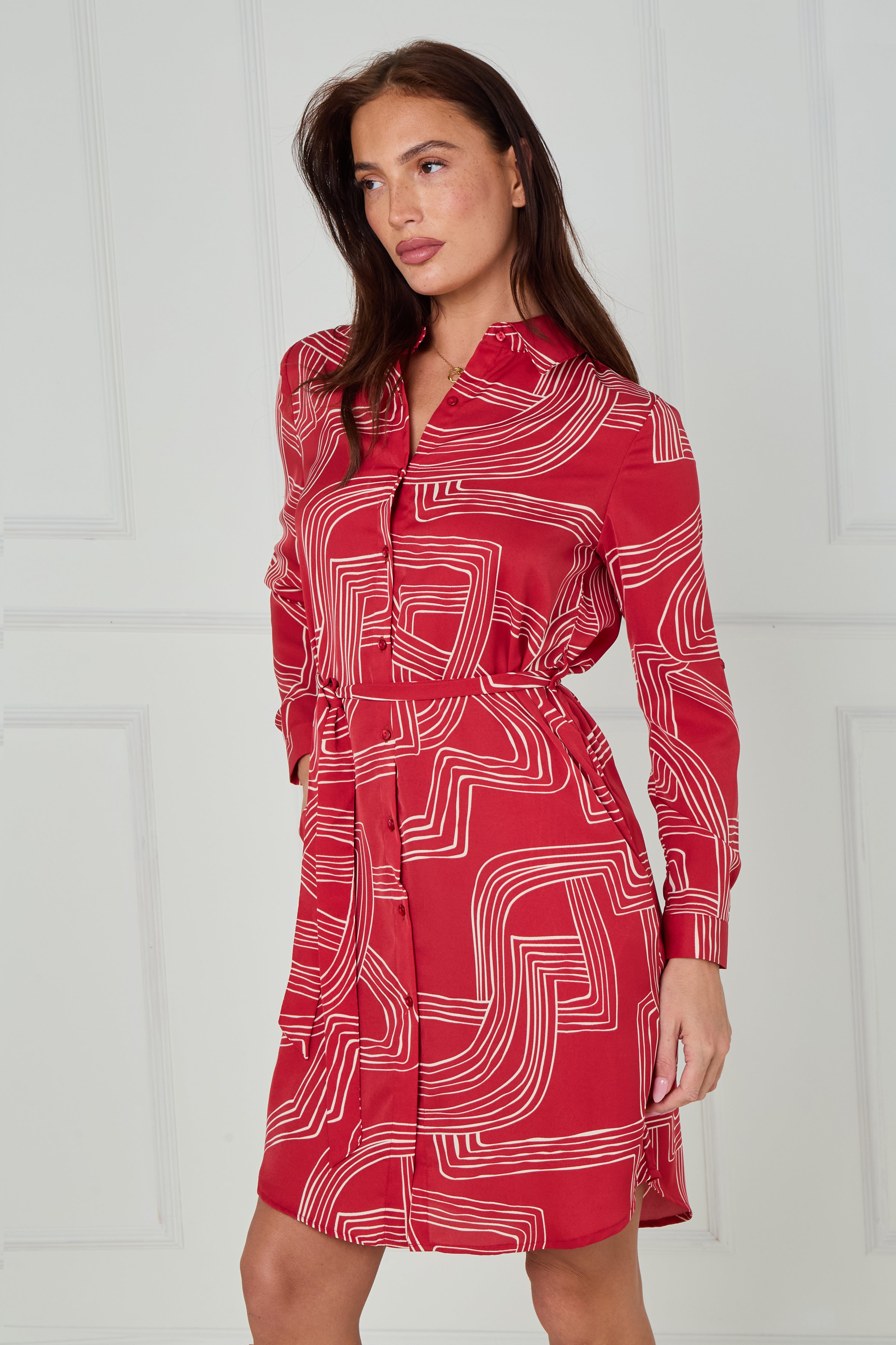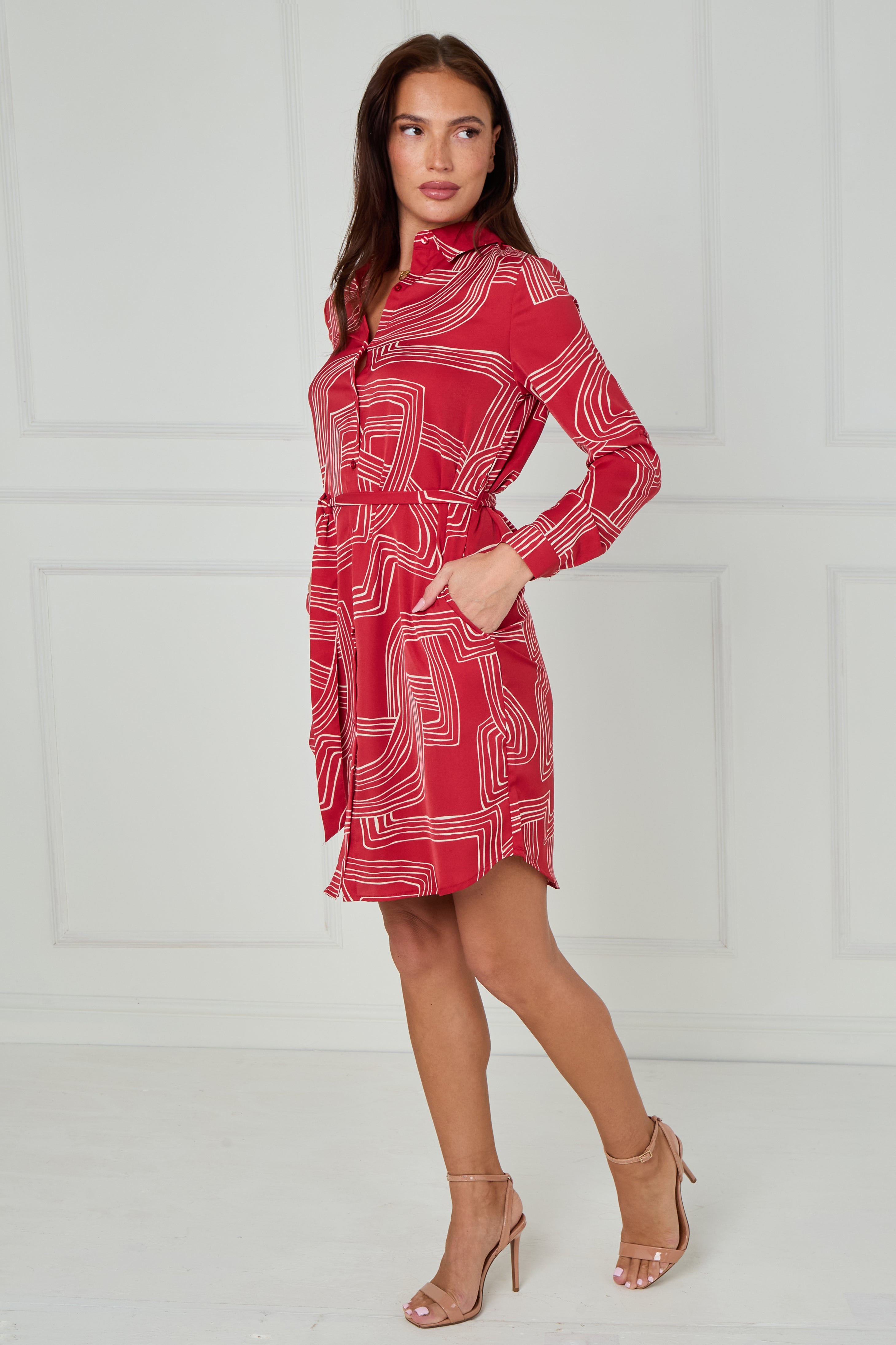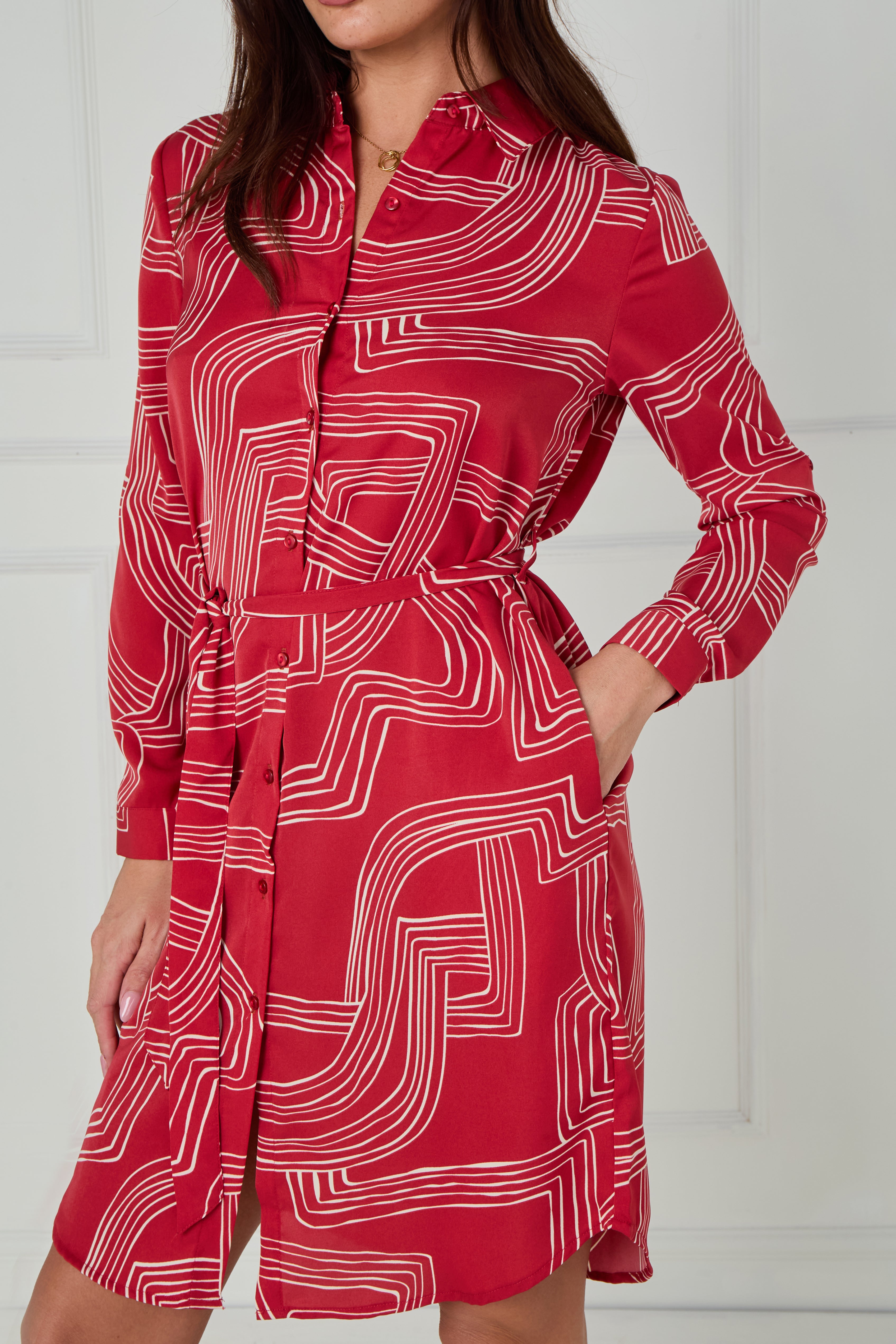 Add a modern twist to your wardrobe with our Crimson and White Geometric Maze Print Mini Shirt Dress, designed in a smooth, lightweight fabric for effortless style and comfort. The bold maze-inspired print in crisp white contrasts beautifully against the rich crimson base, creating a striking yet sophisticated look. Featuring a button-through front, classic shirt collar, and a self-tie belt to define the waist, this dress offers a flattering silhouette that suits every occasion. Finished with long sleeves, buttoned cuffs, side pockets, and a gently curved hemline, it’s the perfect blend of style and practicality. Pair with heels for an elevated evening outfit or trainers for a chic daytime ensemble.