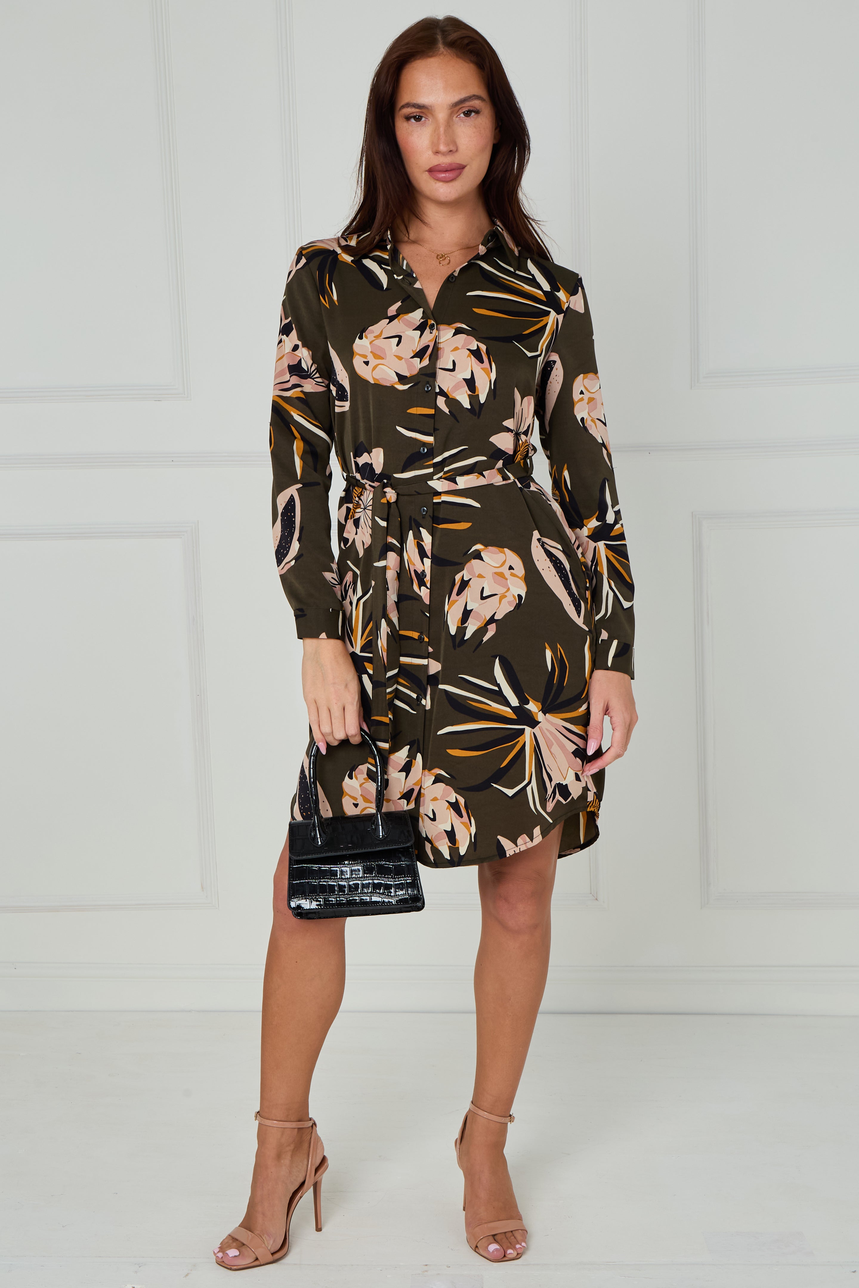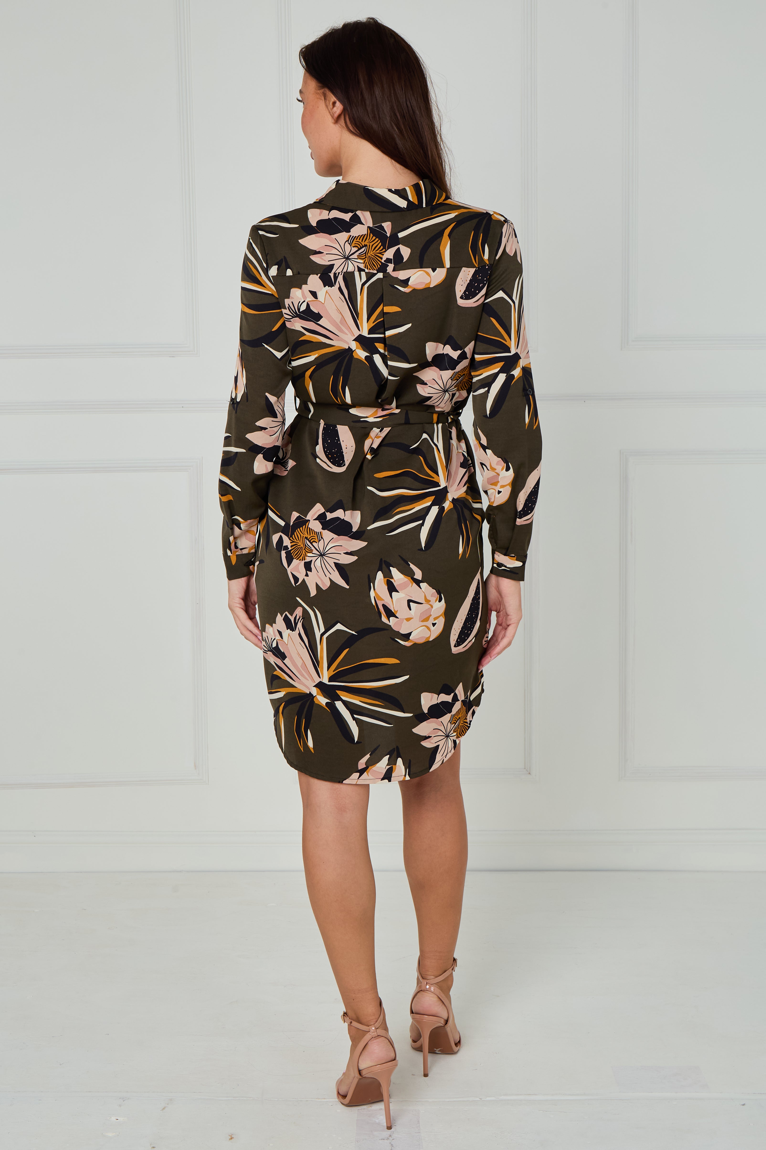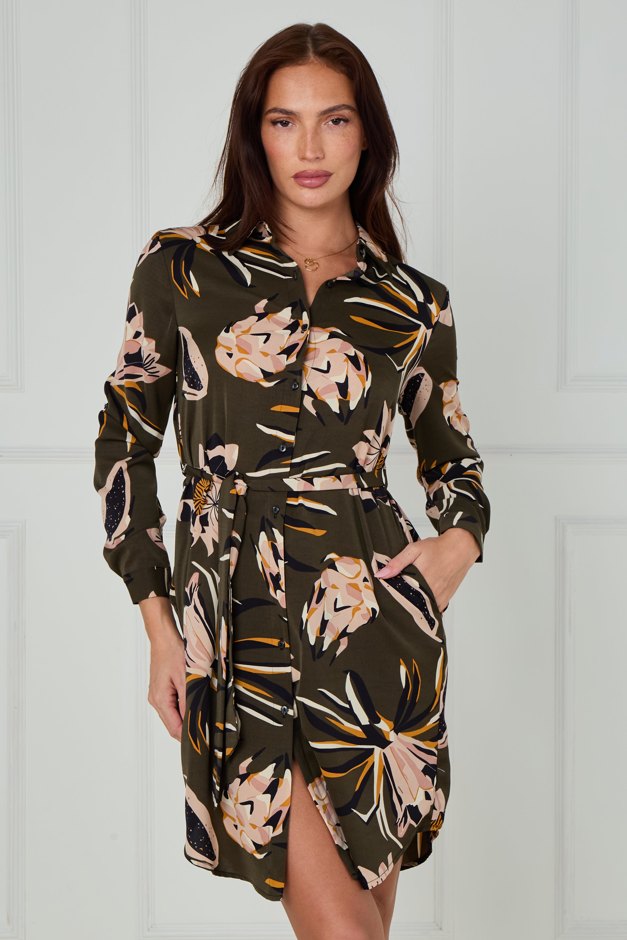 Bring effortless elegance to your wardrobe with our Khaki and Blush Tropical Floral Print Mini Shirt Dress, designed in a soft, fluid fabric that moves beautifully with you. Featuring a button-through front, classic shirt collar, and a self-tie belt to accentuate the waist, this dress combines comfort and style in perfect harmony. The khaki base is enhanced by a striking tropical floral print in blush, cream, and mustard tones, adding a warm and sophisticated touch. Finished with long sleeves, buttoned cuffs, and a curved hemline for a flattering silhouette, this versatile dress transitions seamlessly from day to night—pair it with heels for a polished look or ankle boots for relaxed daytime chic.
