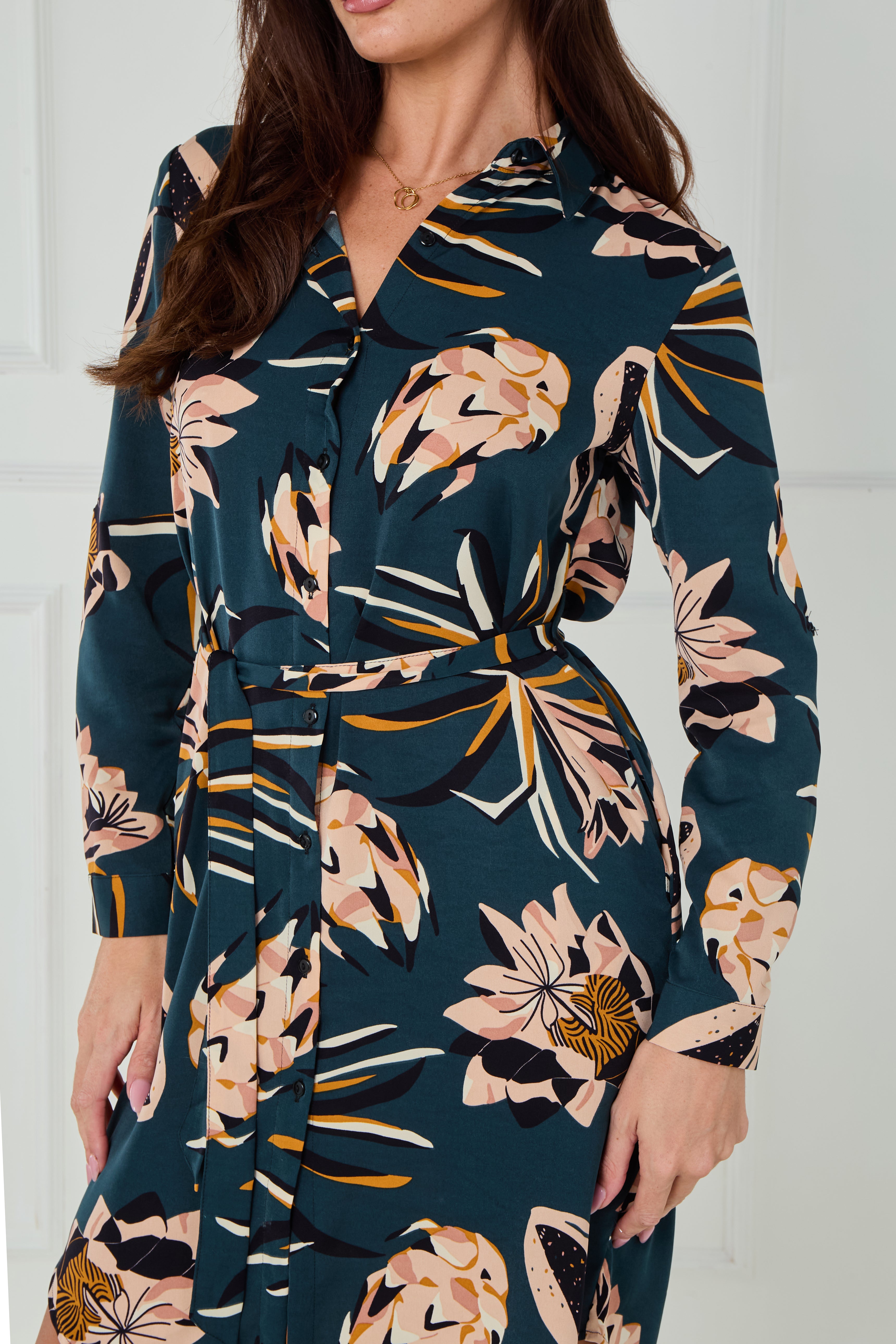 Elevate your everyday style with our Teal and Blush Tropical Floral Print Mini Shirt Dress, crafted from a soft, fluid fabric that drapes beautifully on the body. Featuring an elegant button-through front, classic shirt collar, and a self-tie belt to cinch the waist for a flattering silhouette, this dress stands out with its bold tropical floral print in blush, cream, and mustard tones against a rich teal background. Finished with long sleeves, buttoned cuffs, and a curved hemline, it offers both comfort and sophistication. Perfect for brunch dates, city breaks, or smart-casual occasions, this versatile mini dress transitions effortlessly from day to night—pair it with heels for an elevated evening look or boots for easy daytime chic.