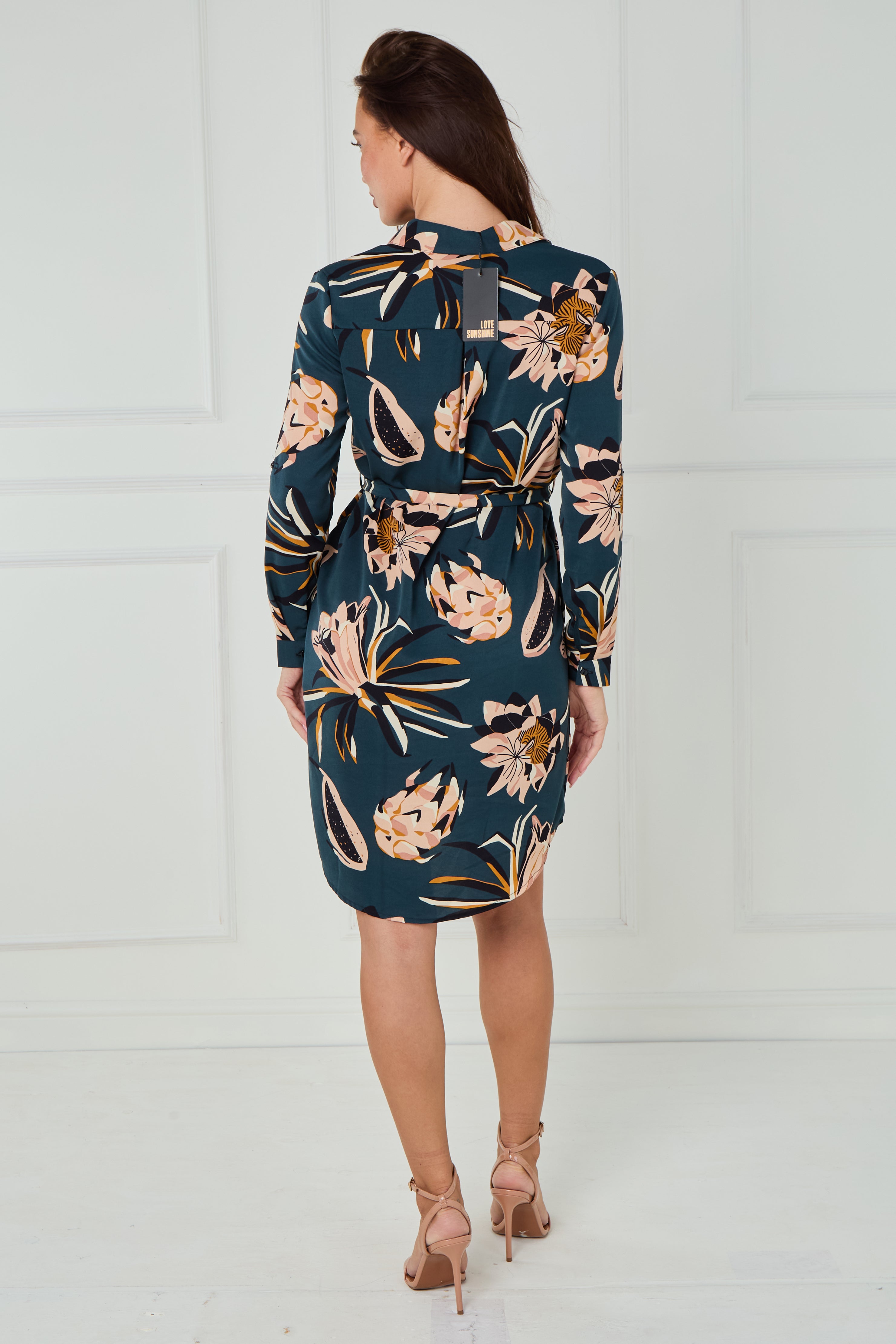 Teal and Blush Tropical Floral Print Mini Shirt Dress