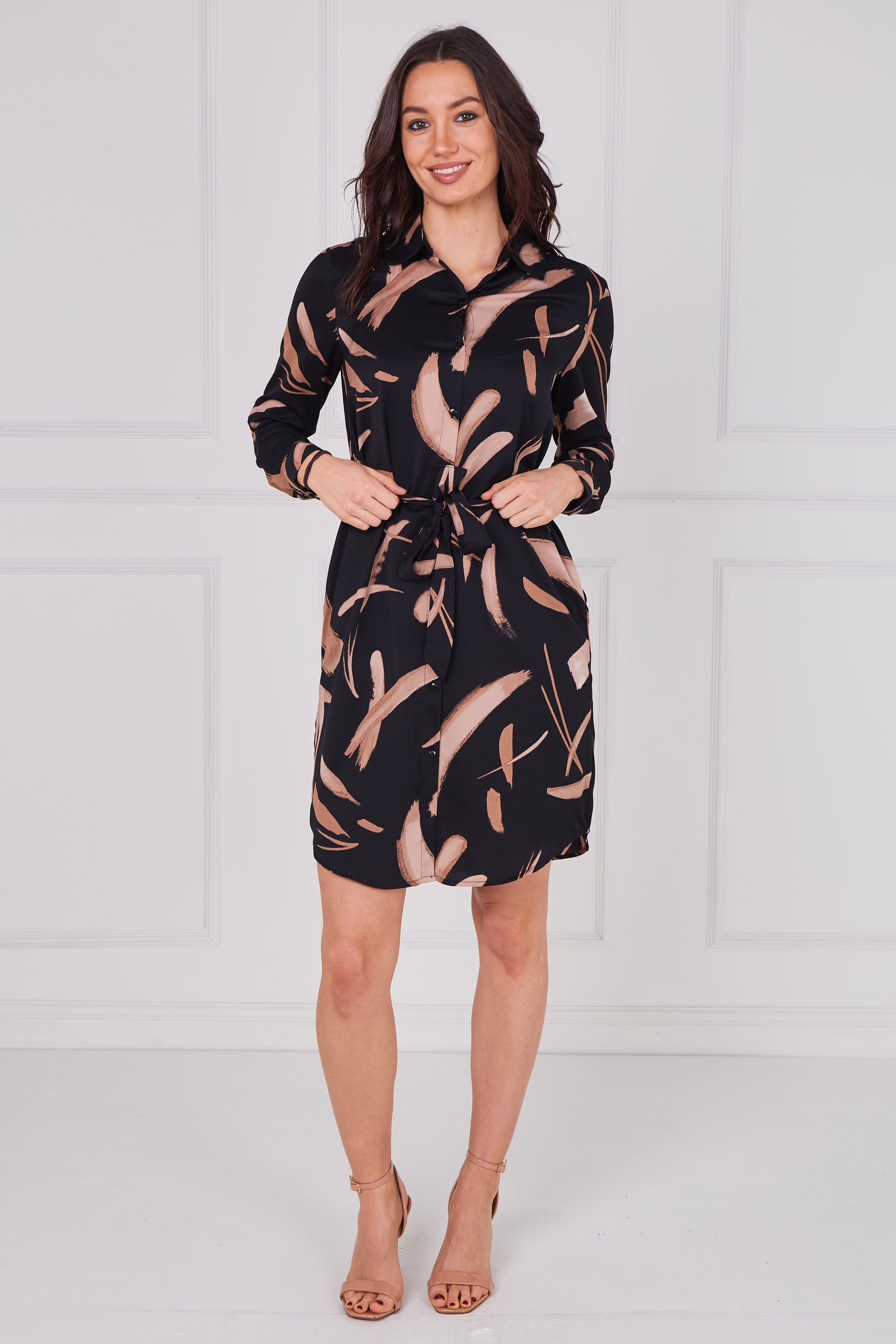 The Black and Caramel Painterly Print Belted Shirt Dress is a modern wardrobe essential designed in a deep black base with warm caramel brushstroke print for a bold yet sophisticated finish. Featuring a classic shirt collar, full button-through front, long sleeves with cuff detail, and a matching detachable waist belt to create a flattering silhouette, this chic shirt dress blends timeless tailoring with contemporary style. The soft, lightweight fabric drapes beautifully, making it perfect for workwear, dinner dates, special occasions, and effortless day-to-evening styling. Pair with nude, tan, or black heels for a polished look that feels confident, refined, and versatile.