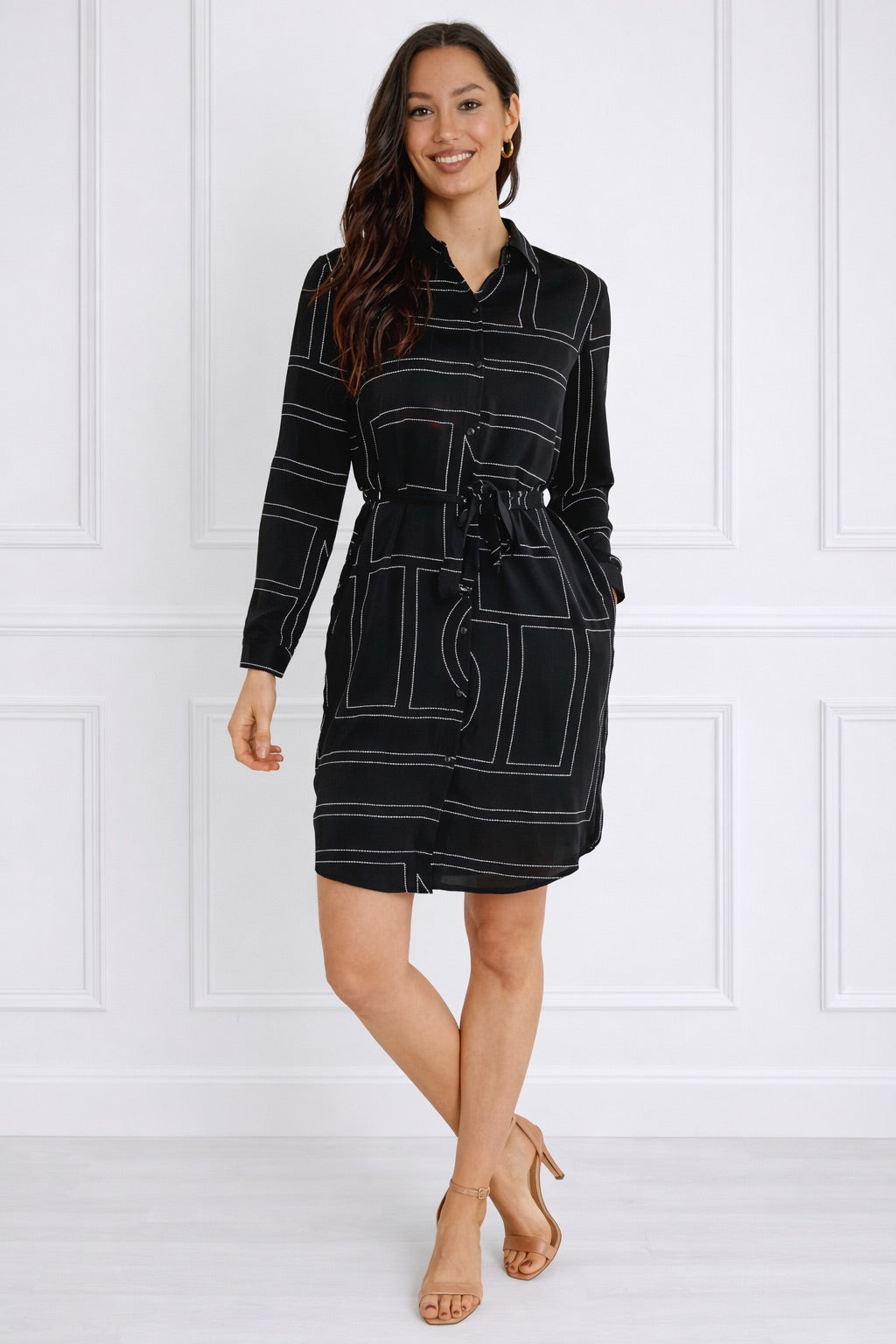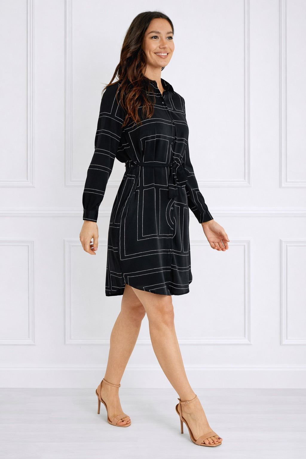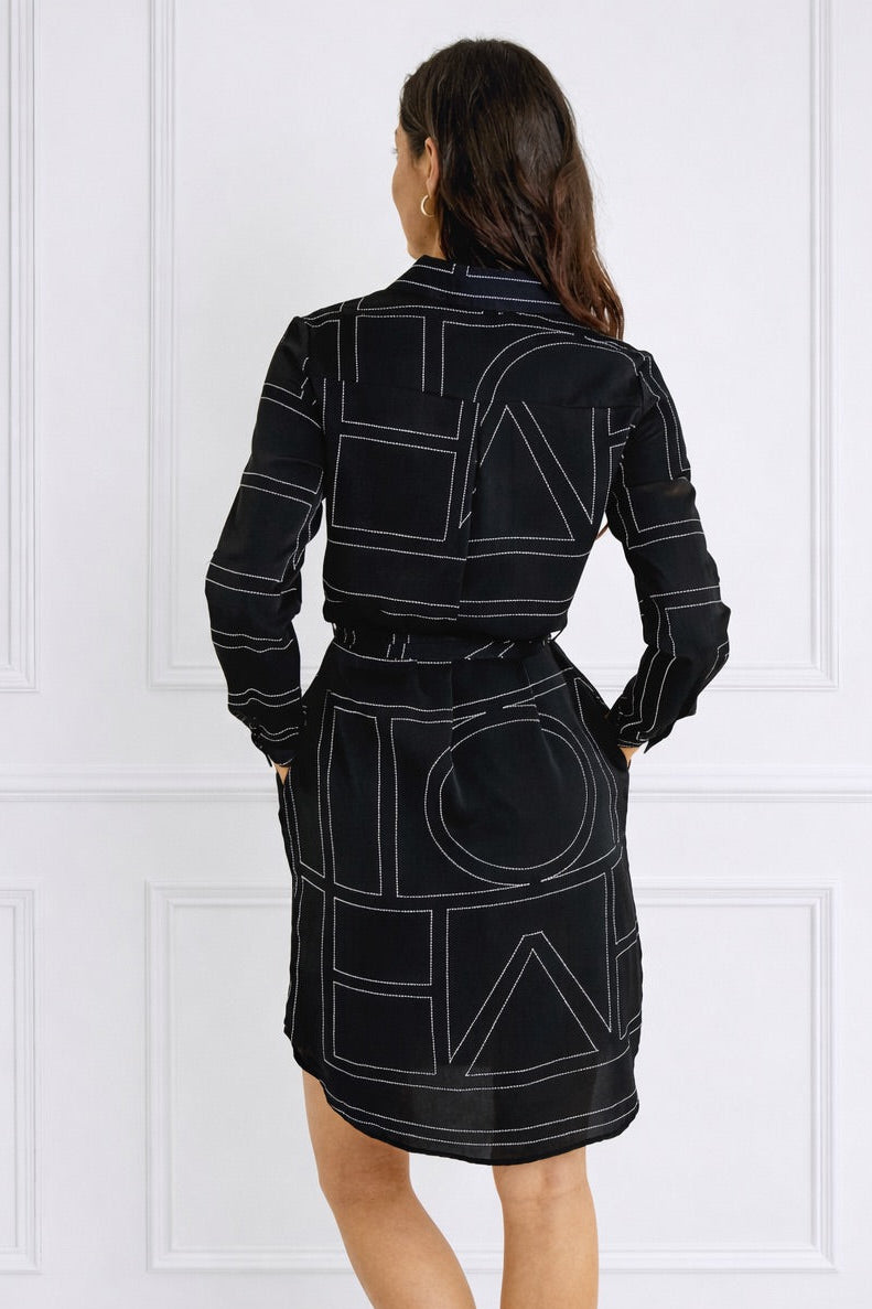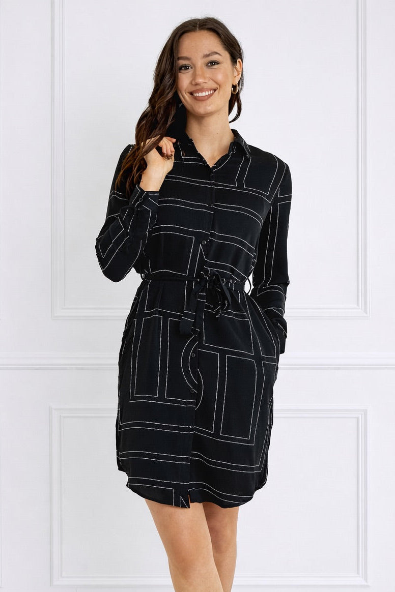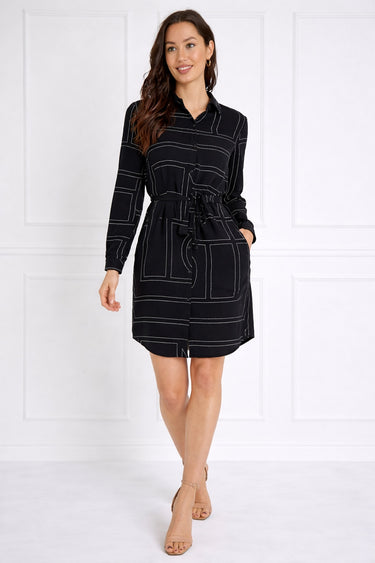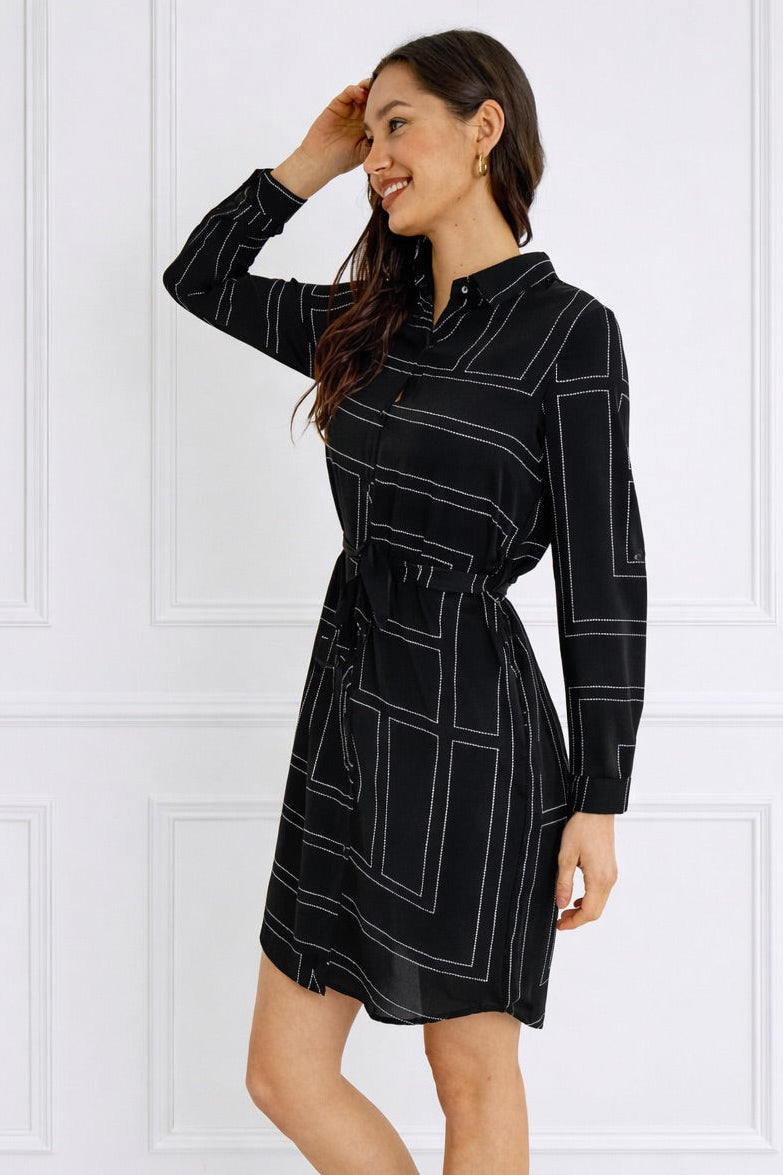 Black Geometric Print Belted Mini Shirt Dress