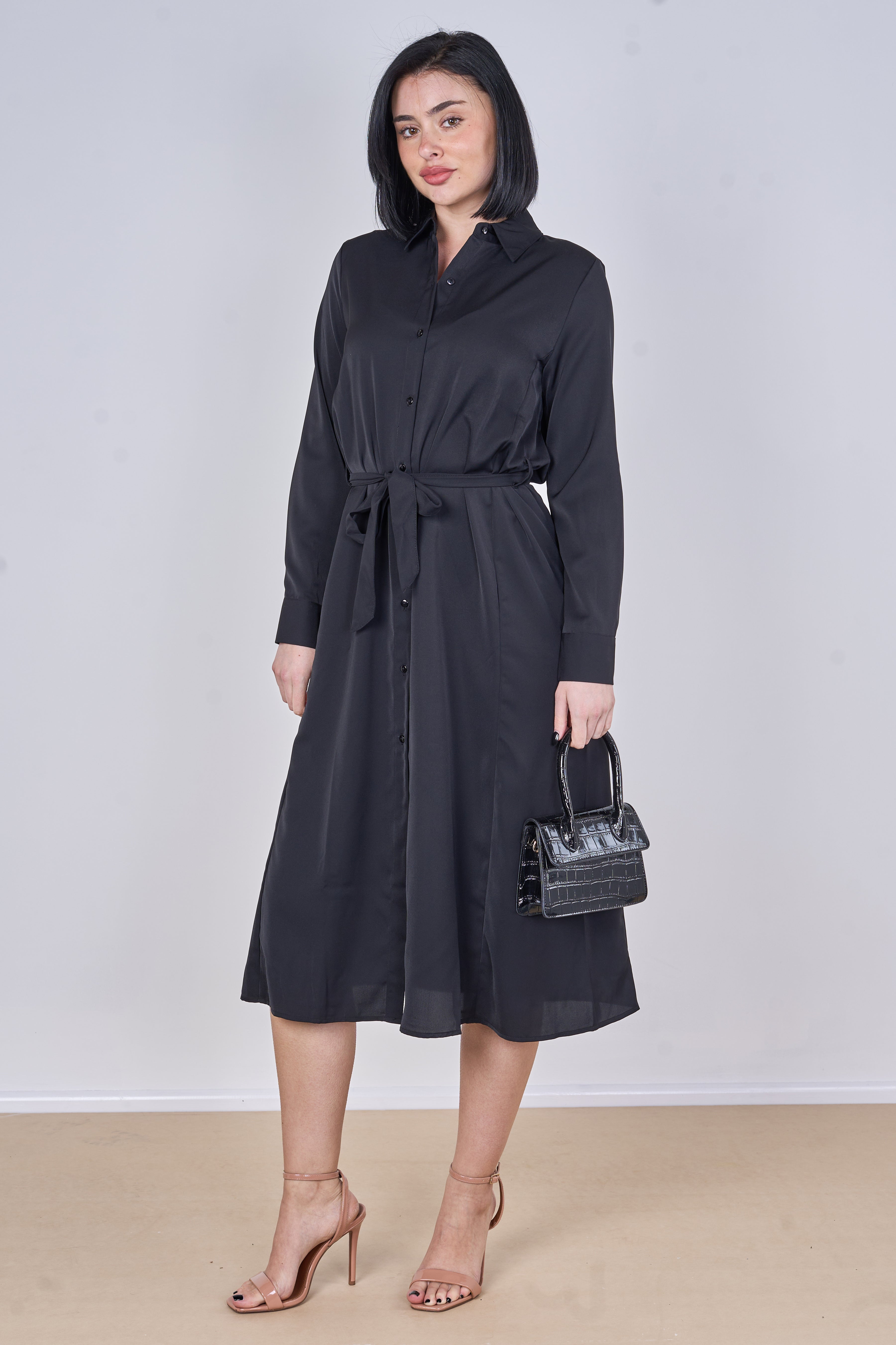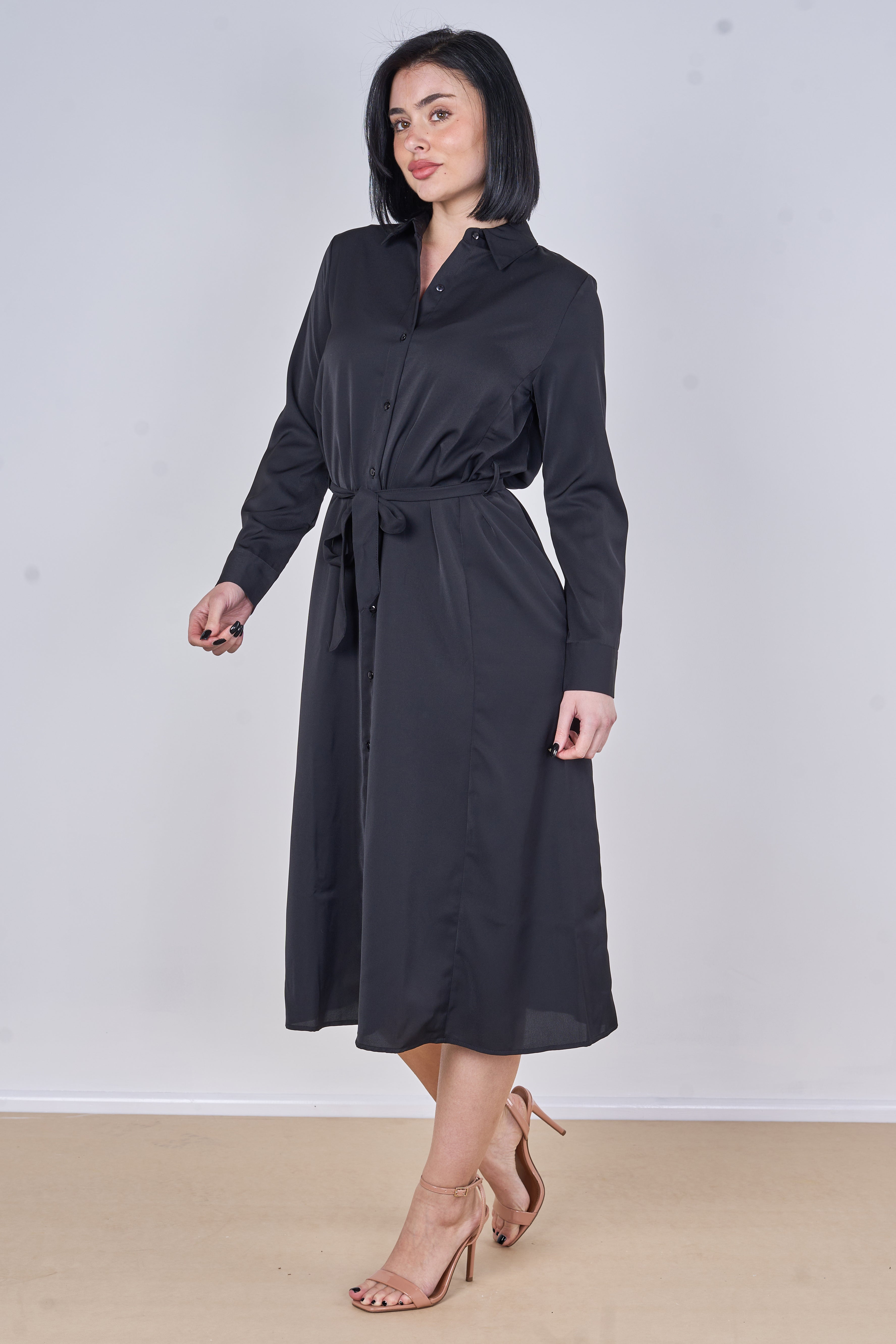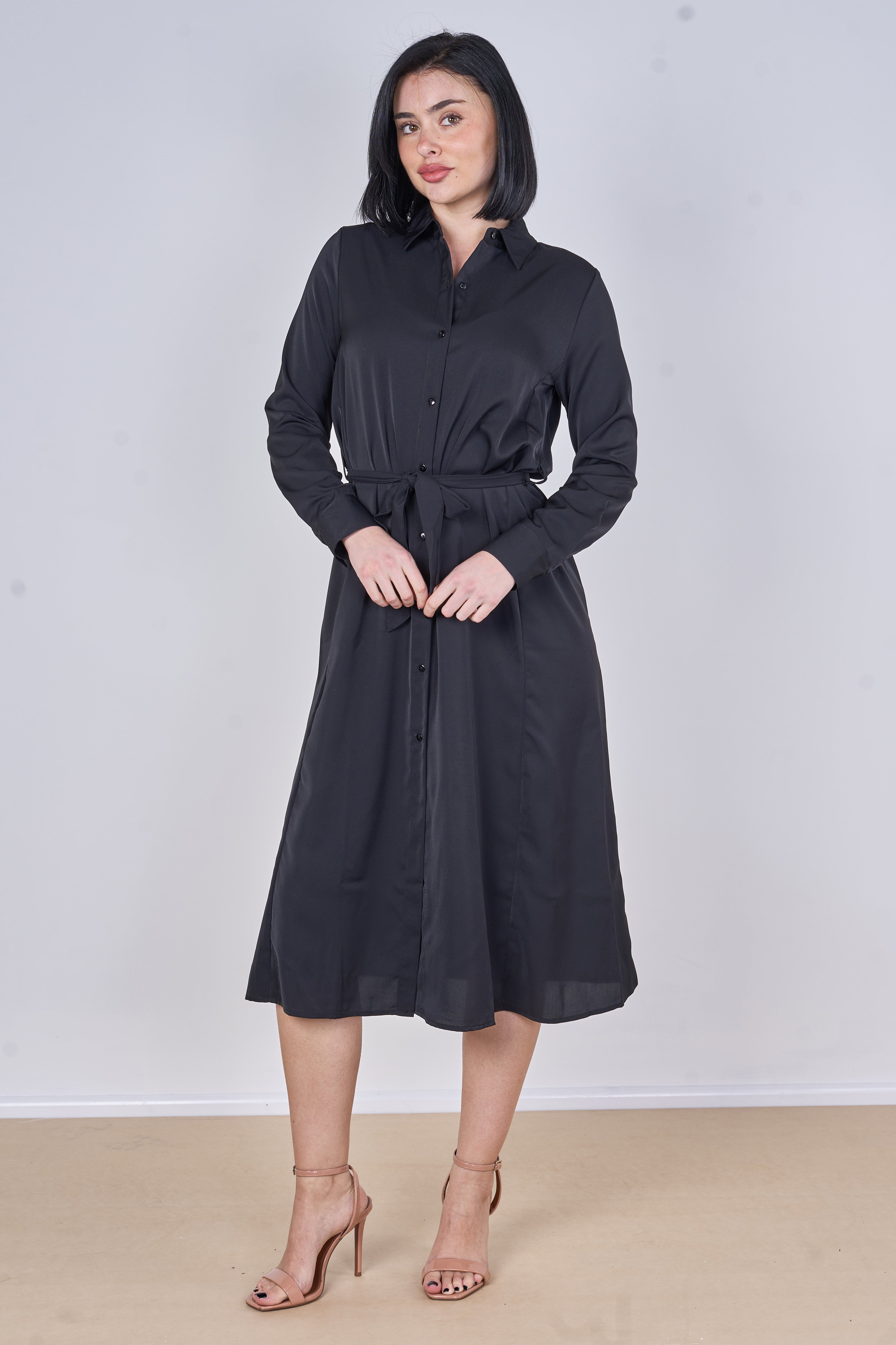 Effortlessly chic and versatile, this black plain belted button-front midi shirt dress is a must-have staple for any wardrobe. Featuring a classic shirt collar and full button-front fastening, it is designed with an adjustable tie waist belt to create a flattering silhouette while offering all-day comfort. The long sleeves with buttoned cuffs and elegant midi length make it perfect for both work and casual occasions, while two side pockets add a practical and convenient touch. Style it with heels for a sophisticated look or pair it with flats for an easy everyday outfit.