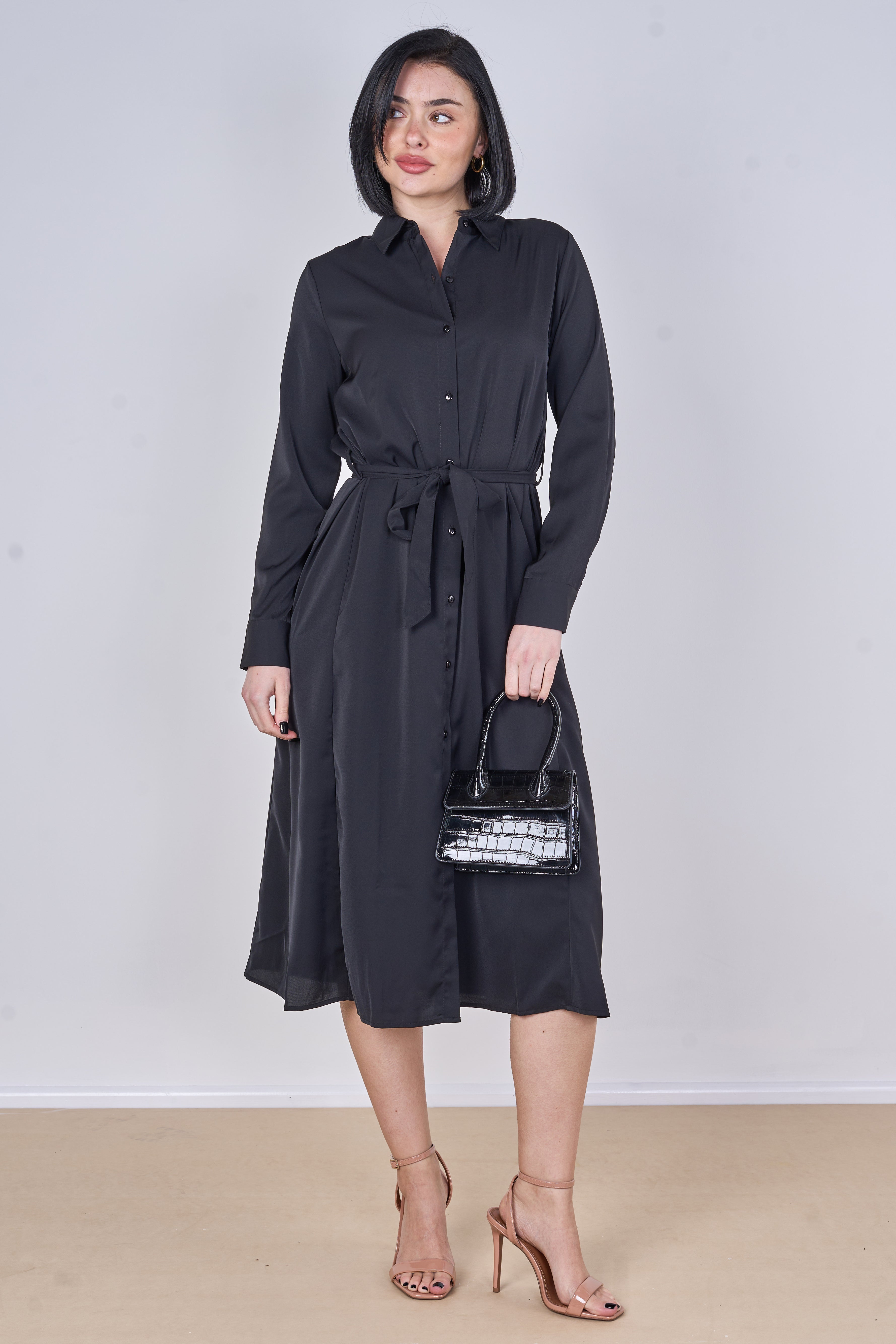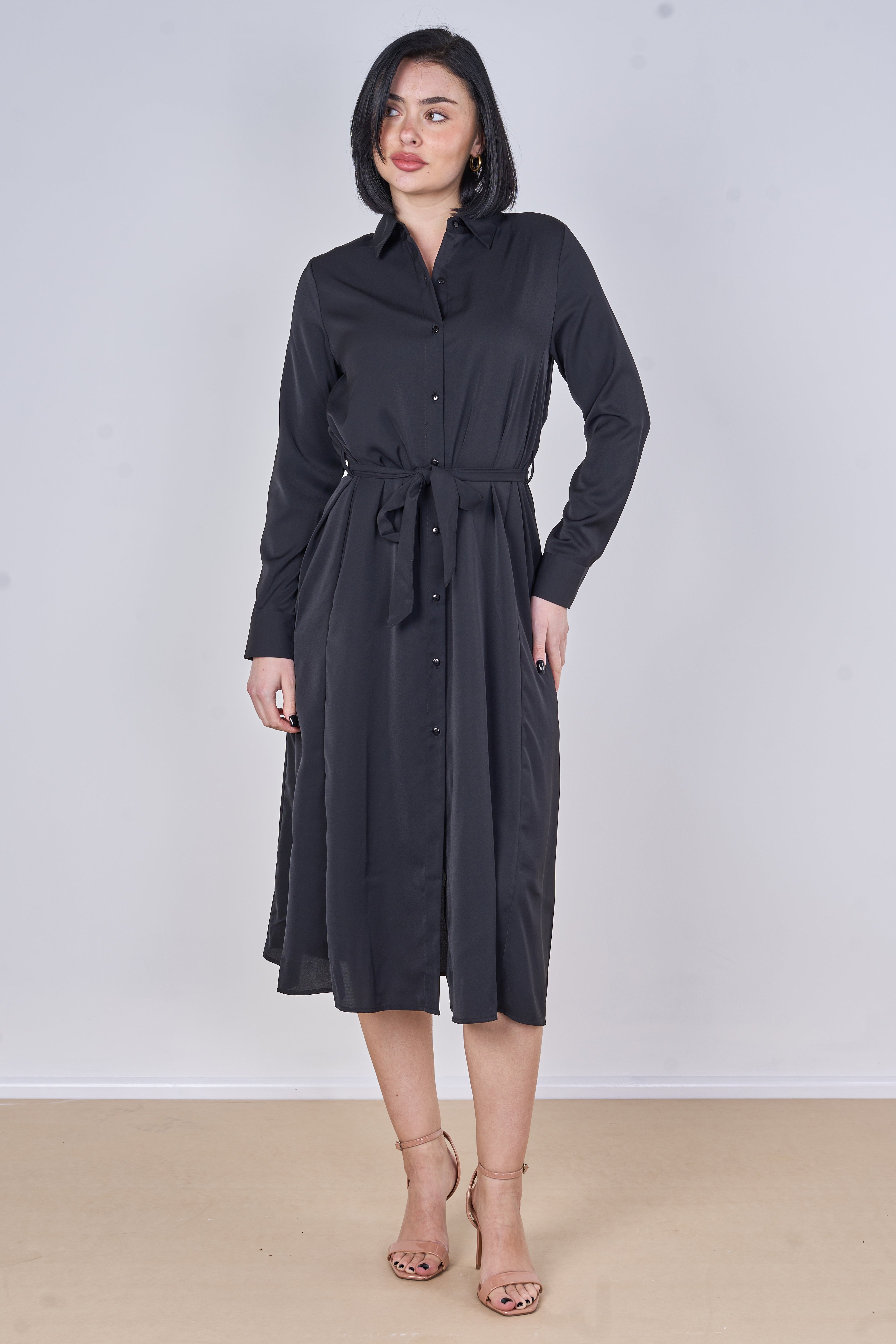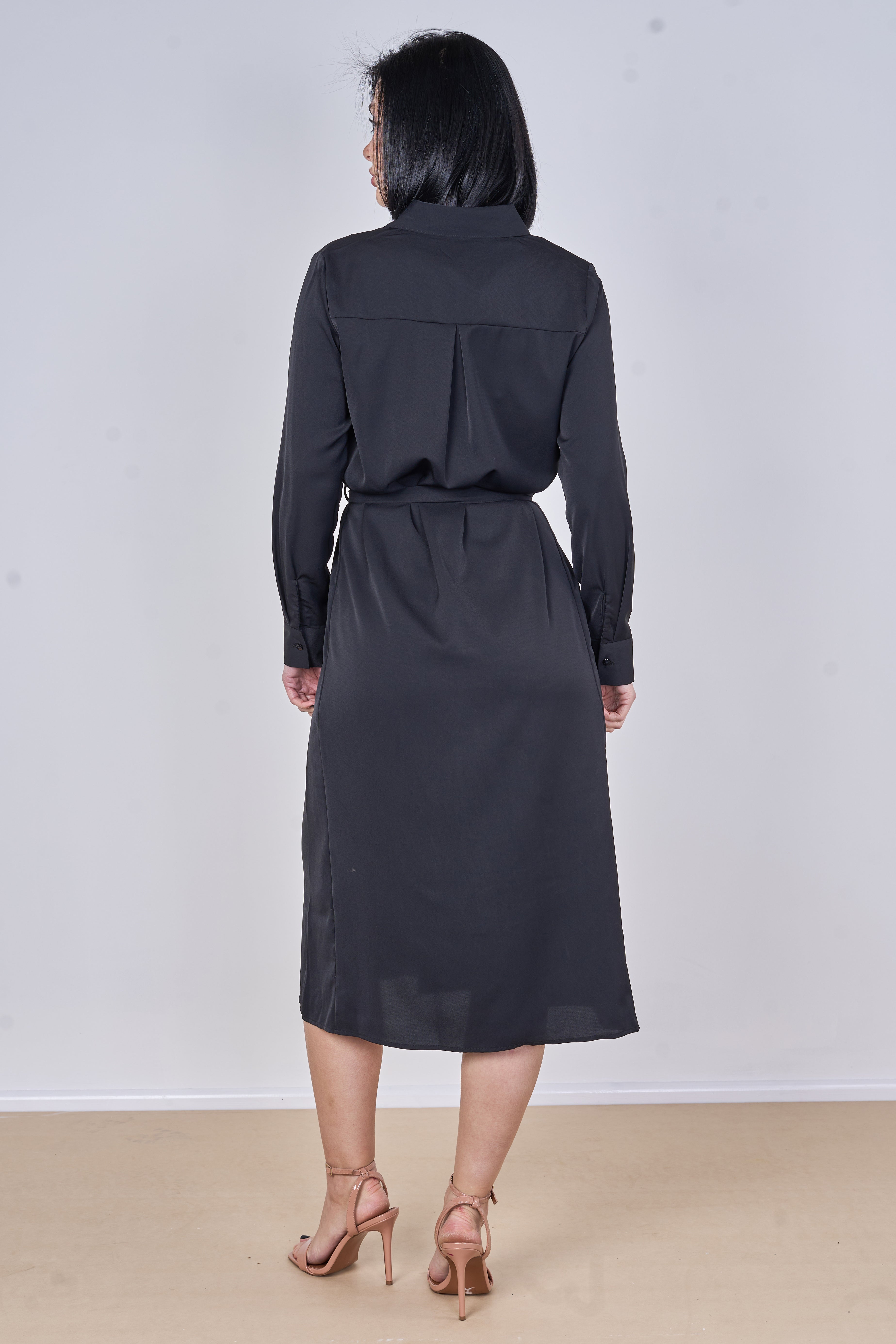 Effortlessly chic and versatile, this black plain belted button-front midi shirt dress is a must-have staple for any wardrobe. Featuring a classic shirt collar and full button-front fastening, it is designed with an adjustable tie waist belt to create a flattering silhouette while offering all-day comfort. The long sleeves with buttoned cuffs and elegant midi length make it perfect for both work and casual occasions, while two side pockets add a practical and convenient touch. Style it with heels for a sophisticated look or pair it with flats for an easy everyday outfit.