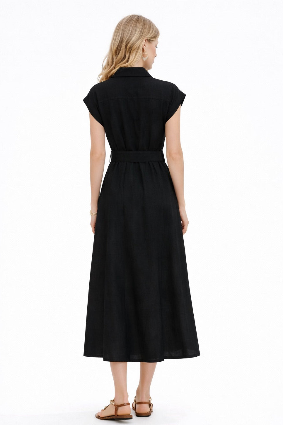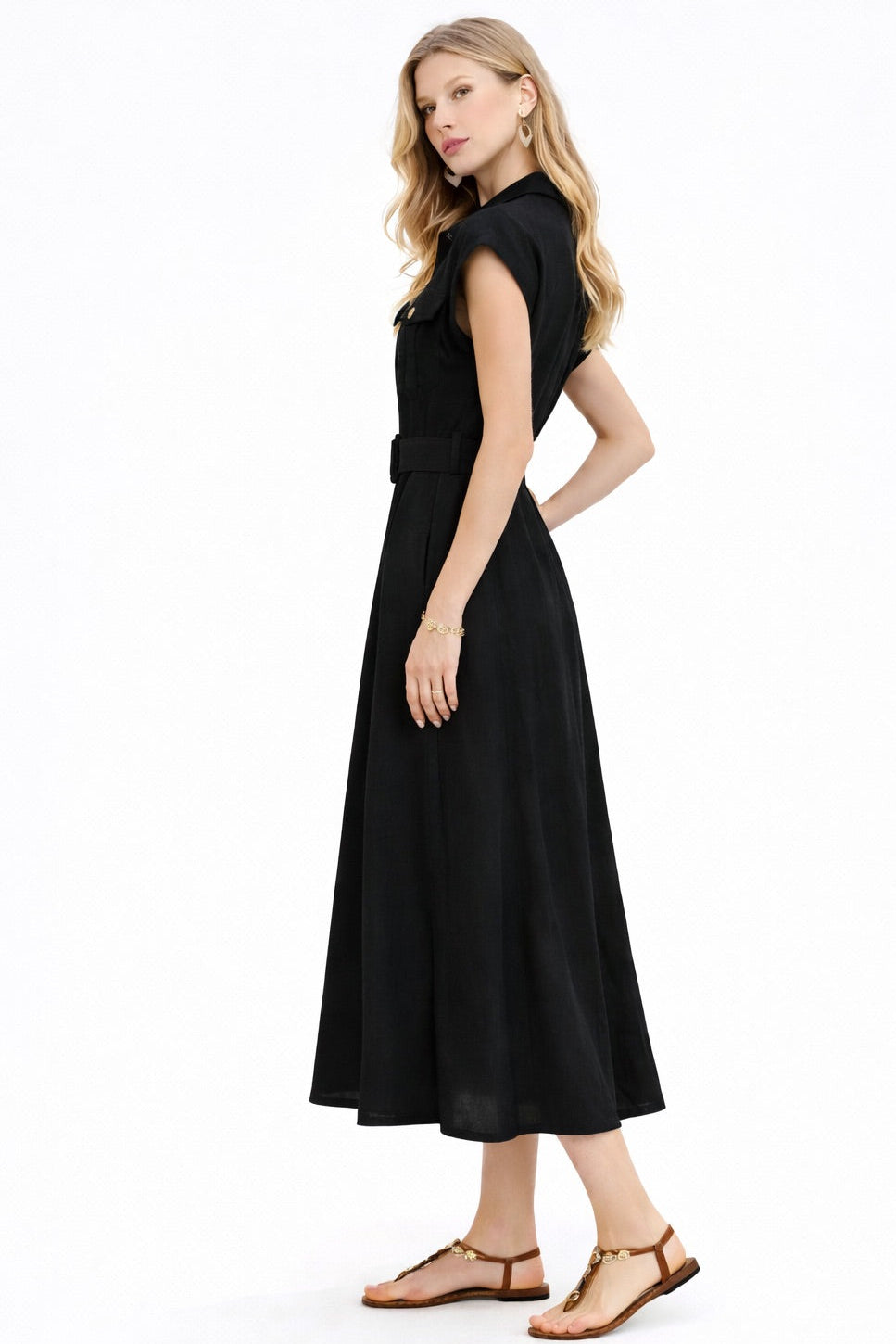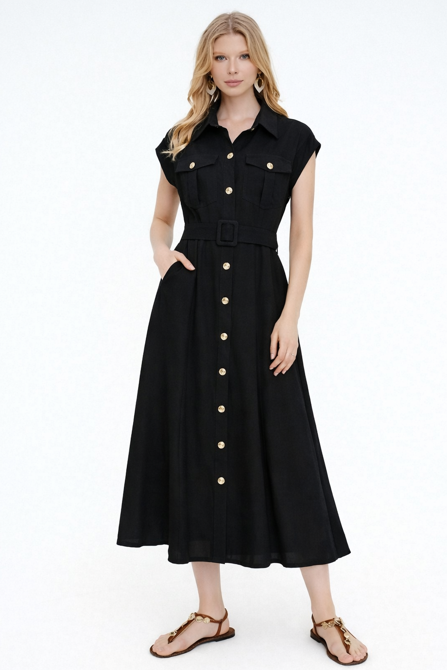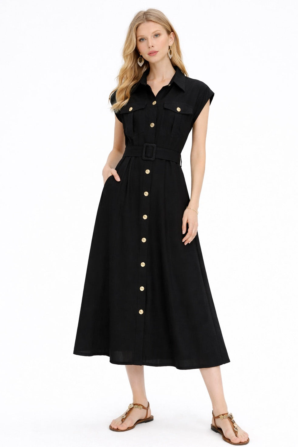 The Black Utility Belted Midi Shirt Dress blends structured tailoring with effortless sophistication. Designed with a sharp shirt collar, cap sleeves, and a full button-through front accented by gold-tone buttons, it offers a polished yet modern look. The matching belted waist with a statement buckle defines the silhouette, while the softly flared midi skirt creates graceful movement. Finished with practical flap chest pockets and two side pockets for everyday functionality, this versatile piece transitions seamlessly from refined daytime styling to elevated evening wear.