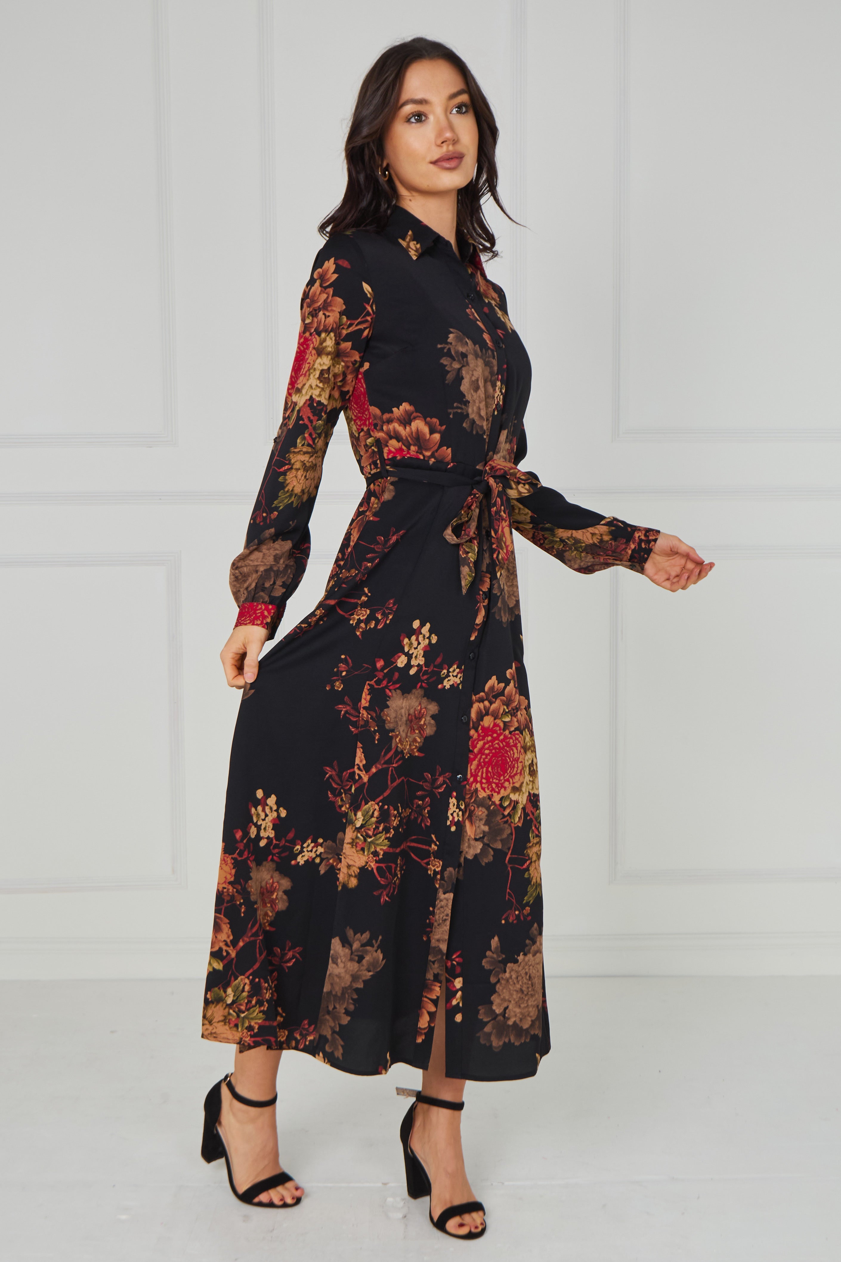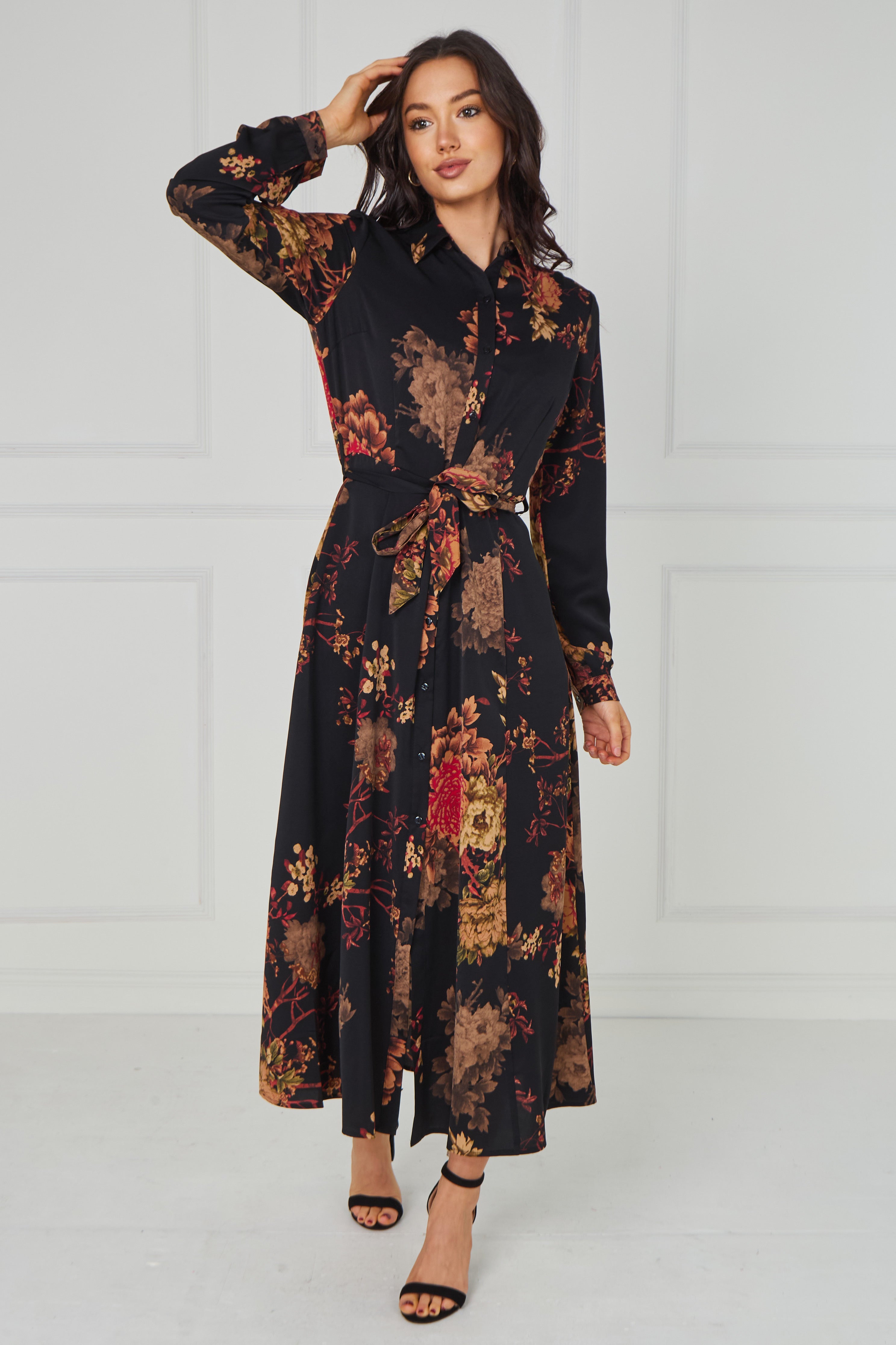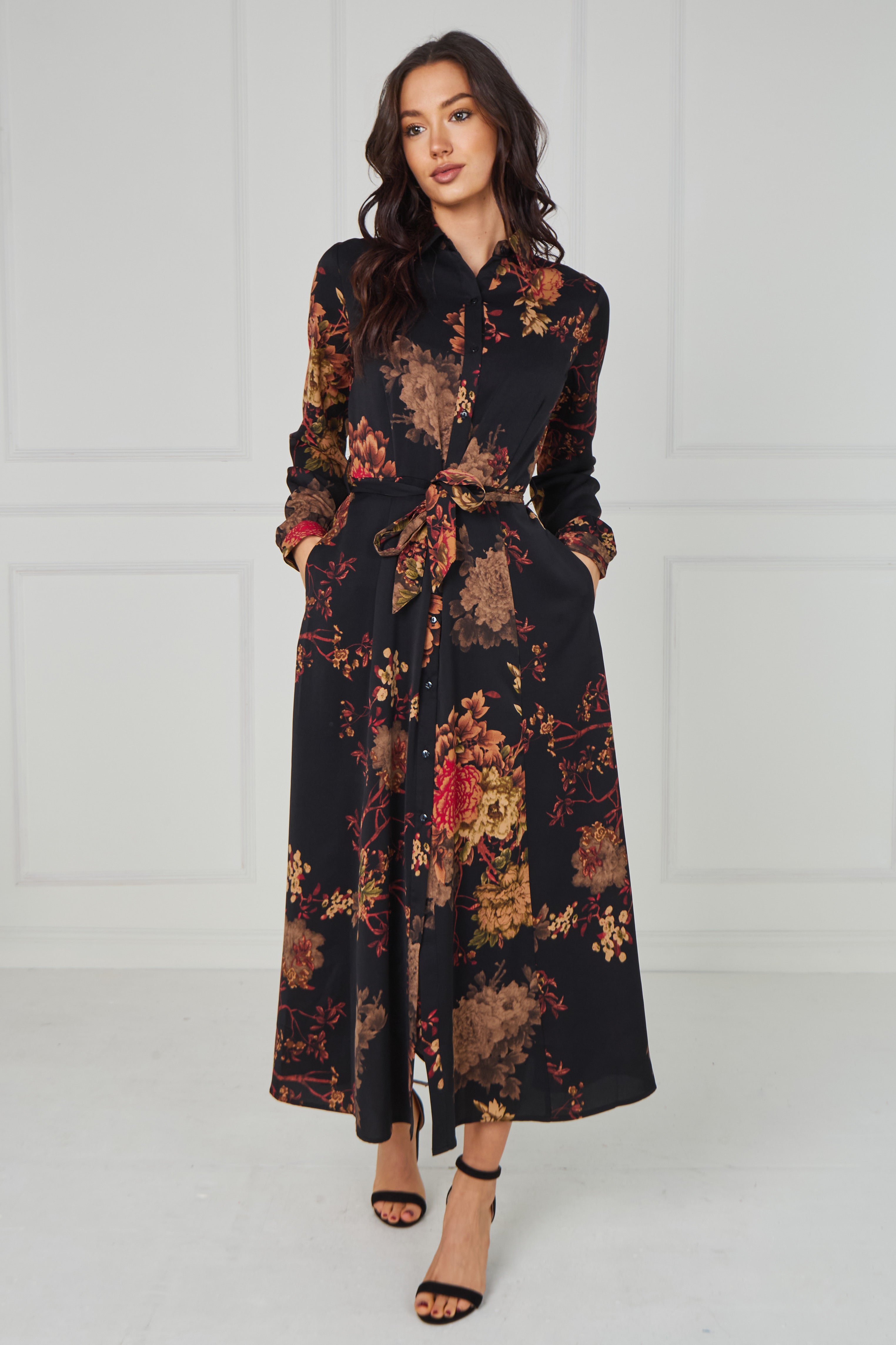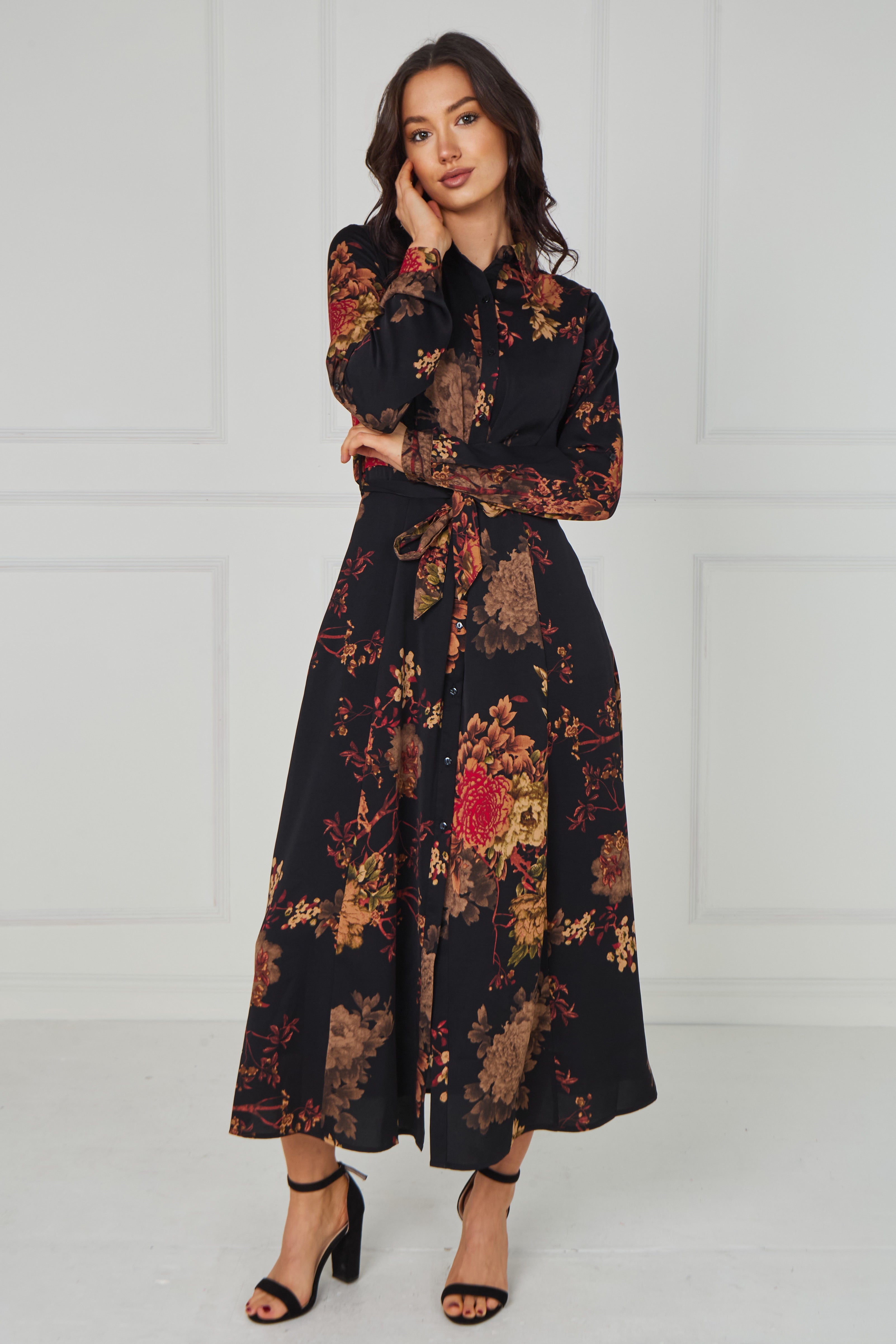 Timeless and effortlessly feminine, the Black Vintage Bloom Midi Dress features a rich floral print in warm tones of rust, mocha, and soft beige set against a deep black base. Designed with a classic button-through front, long sleeves, and a flattering self-tie waist belt to define the silhouette, it creates an elegant and flowing shape. The midi-length skirt drapes beautifully with movement, while two side pockets add practical everyday convenience. Perfect for both elevated daytime styling and evening occasions, this versatile dress pairs seamlessly with heels or sandals for a polished finish.